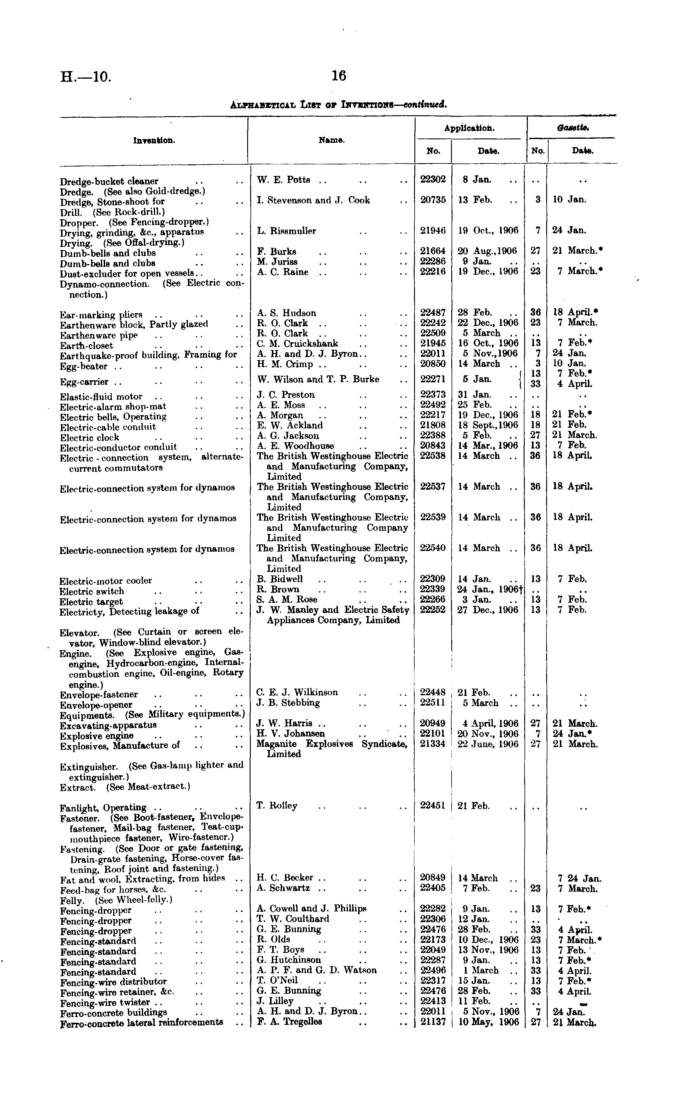 Applica.1 sion. Invention. Name. No. Date. No. Dais. Dredge-bucket cleaner Dredge. (See also Gold-dredge.) . Stone-shoot for Drill. (See Rock-drill.) Dropper. (Sec Fencing-dropper.) Drying, grinding, &c, apparatus . (Sec Offal-drying.) Dumb-bells and dubs Dumb-bells and crabs Dust-excluder for open \ essels Dynamo-connection. (Sec Electric connection. ) W. E. Potts 22302 8 Jan. I. Stevenson and J. Oook 20735 13 Fel). 3 10 Jan. l<. HisMinillrr 21946 19 Oct., 1906 7 24 Jan. F. Burks M. Juries A. C. Raine .. 21664 2228(i 2221C. 20 Aug., 1906 9 Jan. 19 Dec, 1906 27 23 21 March.* 7 March.* Ear-marking pliers Earthenware block, Partly gli Earthenware pipe Eartb-cloeet Earthquake-proof building, Framing for Egg-beater .. \. S. Hudson R. 0. Clark .. It. O.Clark ('. M. Cniickshank A. II. and 1). J. Byron.. II. M. Crimp .. 22487 22242 22609 21945 22011 20850 28 Feb. 22 Dec, 1906 5 March .. 16 Oct., 1906 5 Nov., 1906 14 March .. 5 Jan. Sβ 23 is 7 S 13 33 18 April.* 7 March. 7 Feb.* 24 Jan. 10 Jan. 7 Feb.* 4 April. Egg-carrier .. W. Wilson and T. P. Burke 22271 Elastic-fluid motor Electric-alarm shop-mat Electric hells. Open Electric-oable conduit Electric olocfe Eleotric-oonduotor oonduit Klectric -connection system, alternatecurrent commutators Electric-connection system for dynamos Electric connection system for dynamos J. C. Preston A. K. Moss .. A. Morgan E. W. Acklan.l A. G. Jackscm A. E. Woodhonee The British Westinghouae Electric and Manufacturing Company, Limited The British Weetinghouse Electric and Manufacturing Company, Limited The British Weetinghouse Electric and Manufacturing Company Limited The British Wcstinghouse Electric and Manufacturing Company, Limited B. Bidwell R. Brown 8. A. M. Rose J. W. Manley and Electric Safety Appliances Company, Limited 22373 22492 22217 21808 22388 20843 22538 ±>5:(7 22539 31 Jan. 25 Feb. 19 Dec, 1906 18 Sept., 1006 5 Feb. .. 14 Mar., 1906 14 March .. 14 March .. 14 March .. is is T, 13 Sβ Sβ Sβ 21 Feb.* 21 Feb. ■21 March. 7 Feb. 18 April. 18 April. 18 April. Klectric-connection system for dynamos 22540 14 March .. Sβ 18 April. Electric-motor cooler Electric switch Electric target Electricty, Detecting leakage of 2230!) 2233!) 22266 22252 U Jan. 24 Jan., 1906t li Jan. 27 Dec, 1906 13 i3 13 7 Feb. 7 Feb! 7 Feb. Elevator. (See Curtain or screen etevator, Window-blind elevator.) Engine. (See Explosive engine, Gasengine, Hydrocarbon-enL'inc, Internalcombustion engine. Oil-engine, Rotary engine.) Envelope-fastener Envelo)>e-opener Equipments. (See Military equipments.) Excavating-apparatus Explosive engine Explosives, Manufacture of C. E. J. Wilkinson J. B. Stebbing 22448 22511 21 Feb. r> .March .. J. W. Harris H. V. Johaoien .. iiitc Explosives Syndicate, Limited 20949 22101 21334 4 April, 1906 20 Nov., 1906 22 .Juno, 1906 27 7 ■1 7 21 March. 24 Jan.* •21 March. Extinguisher. (See Gee-lamp light extinguisher.) Extract. (See Meat-extract.) 21 Feb. Fanlight, Operating .. Fastener. (See Boot-fastener, Envelope■icr. Mail-bag Ei rt-cup-mouthpiece fastener, Wire-fastener.) ling. (See Door or gate fastening, Drain-grate fastening, Horse-cover fastening, Roof jotal and fastening.) ,l wool, Extracting, from hide* .. g for horse Felly. (Sec Wheel-felly.) Fencing-dropper Fencing-dropper Fencing-dropper Fencing-standard Fencing-standard Fencing-standard Fencing-standard Fencing-wire distributor Fencing-wire retainer. &c. Fencing-wire twistcr .. Ferro-concrete buildings Ferro-concreto lateral reinforcements T. Rolley 22451 H. C. Becker . . A. Schwartz 14 March . . 7 Fob. 7 24 Jan. 7 March. 20849 22405 23 A. Cowell and J. Phillips T. \V. Coulthard G. E. Bunning l<. Olds ?. T. Boys G. Hutchinson A. 1'. F. and G. D. Watson I. O'Neil ( '.. 1C. Bunning J. Lilley A. H. and D. J. Byron.. F. A. Tregelles 22282 22301) 22476 22173 22040 22287 22496 22317 22470 22413 22011 21137 9 Jan. 12 Jan. 28 Feb. 10 Dec, 1906 13 Nov., 1906 9 Jan. 1 March .. 1S Jan. 28 Feb. 11 Feb. 5 Nov., 1906 10 May, 1906 13 83 23 13 13 S3 13 S3 7 Feb.* 4 April. 7 March.* 7 Feb. 7 Feb.* 4 April. 7 Feb.* 4 April. 7 27 24 Jan" 21 March.