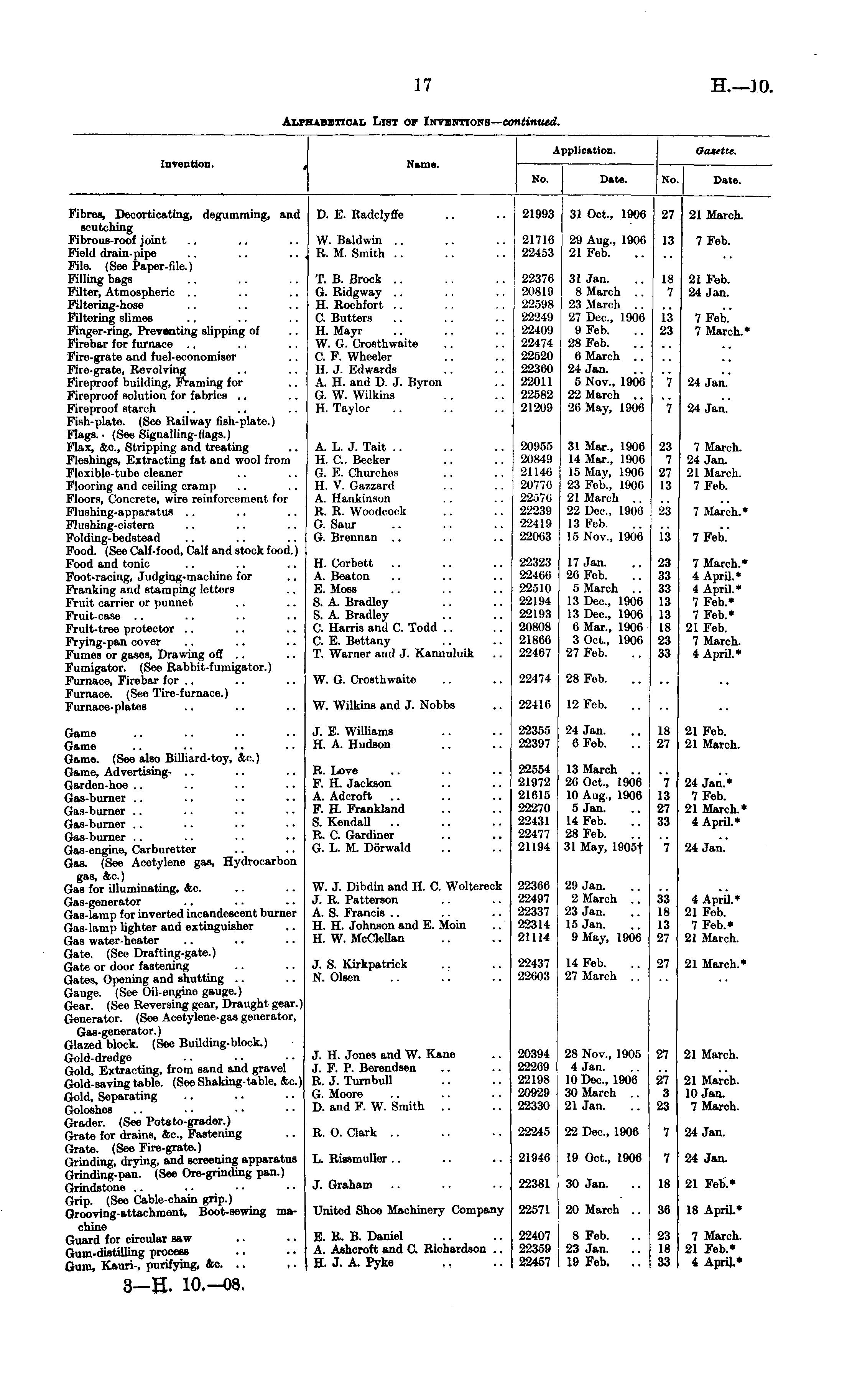 Application. Oaxette. Invention. Name. No. Date. No. Date. Fibres, Decorticating, degumming, and scutching Fibrous-roof joint Field drain-pipe File. (See Paper-file.) Filling bags Filter, Atmospheric Filtering-hose Filtering slimes Finger-ring, Preventing slipping of Firebar for furnace .. Fire-grate and fuel-economiser Fire-grate, Revolving Fireproof building, Framing for Fireproof solution for fabrics Fireproof starch Fish-plate. (See Railway fish-plate.) Flags.. (See Signalling-flags.) Flax, &c, Stripping and treating Fleshings, Extracting fat and wool from Flexible-tube cleaner Flooring and ceiling cramp Floors, Concrete, wire reinforcement for Flushing-apparatus Flushing-cistern Folding-bedstead Food. (See Calf-food, Calf and stock food.) Food and tonic Foot-racing, Judging-machine for Franking and stamping letters Fruit carrier or punnet Fruit-case Fruit-tree protector Frying-pan cover Fumes or gases, Drawing off .. Fumigator. (See Rabbit-fumigator.) Furnace, Firebar for .. Furnace. (See Tire-furnace.) Furnace-plates D. E. Radclyffe 21993 31 Oct., 1906 27 21 March. W. Baldwin .. R. M. Smith 21716 22453 29 Aug., 1906 21 Feb. 13 7 Feb. T. B. Brock .. G. Ridgway .. H. Rochfort .. C. Butters H. Mayr W. G. Crosthwaite C. F. Wheeler H. J. Edwards A. H. and D. J. Byron G. W. Wilkins H. Taylor 22376 20819 22598 22249 22409 22474 22520 223(>0 22011 22682 21209 31 Jan. 8 March .. 23 March .. 27 Dec, 1906 9 Feb. 28 Feb. 6 March .. 24 Jan. 5 Nov., 1906 22 March .. 20 May, 1906 IN 7 21 Feb. 24 Jan. is 23 7 Feb.' 7 March.* 'i 24 Jan.' 7 24 Jaii. A. L. J. Tait H. C. Becker G. E. Churches H. V. Gazzard A. Hankinson R. R. Woodcock G. Saur G. Brennan 20955 20849 21146 20776 22576 22239 22419 22063 31 Mar., 1906 14 Mar., 1906 v, 1906 23 Feb., 1906 21 March .. 22 Dec, 1906 13 Feb. 15 Nov., 1906 23 7 27 13 7 March. 24 Jan. 21 March. 7 Feb. 28 7 March.* 13 7 Feb.' H. Corbett A. Beaton E. Moss S. A. Bradley S. A. Bradley C. Harris and C. Todd C. E. Bettany T. Warner and J. Kannuluik 22323 22466 22510 22194 22193 20808 21866 22467 17 Jan. 26 Fob. 5 March .. 13 Dec, 1906 13 Dec, 1906 6 Mar., 1906 3 Oct., 1906 27 Feb. 23 33 33 13 13 is 23 33 7 March.* 4 April.* 4 April.* 7 Feb.* 7 Feb.* 21 Feb. 7 March. 4 April.* W. G. Crosthwaite 22474 28 Feb. W. Wilkins and J. Nobbs 22416 12 Feb. Game Game Game. (See also Billiard-toy, Ac.) Game, Advertising-Garden-hoe Gas-burner Gas-burner Gas-burner Gas-burner Gas-engine, Carburetter Gas. (See Acetylene gas, Hydrocarbon gas, &c.) Gas for illuminating, &c. Gas-generator Gas-lamp for inverted incandescent burner Gas-lamp lighter and extinguisher Gas water-heater Gate. (See Drafting-gate.) Gate or door fastening Gates, Opening and shutting Gauge. (See Oil-engine gauge.) Gear. (See Reversing gear, Draught gear.) Generator. (See Acetylene-gas generator, Gas-generator.) Glazed block. (See Building-block.) Gold-dredge Gold, Extracting, from sand and gravel Gold-saving table. (See Shaking-table, &c.) Gold, Separating Goloshes Grader. (See Potato-grader.) Grate for drains, &c, Fastening Grate. (See Fire-grate.) Grinding, drying, and screening apparatus Grinding-pan. (See Ore-grinding pan.) Grindstone Grip. (See Cable-chain grip.) Grooving-attachment, Boot-sewing machine Guard for circular saw Gum-distilling process Gum, Kauri-, purifying, &o. .. ,. J. E. Williams H. A. Hudson 22355 22397 24 Jan. 6 Feb. IS 27 21 Feb. 21 March. R. Love F. H. Jackson A. Adcroft F. H. Frankland S. Kendall R. C. Gardiner G. L. It Dorwald 22554 21972 21615 22270 22431 22477 21194 13 March .. 26 Oct., 1906 10 Aug., 1906 5 Jan. 14 Feb. 28 Feb. 31 May, 1905f 7 13 27 ss 24 Jan.* 7 Feb. 21 March.* 4 April.* 7 24 Jan. W. J. Dibdin and H. C. Woltereck J. R. Patterson A. S. Francis H. H. Johnson and E. Moin H. W. McClellan 22366 22497 22337 22314 21114 29 Jan. 2 March .. 23 Jan. 15 Jan. 9 May, 1906 33 Lβ 13 L'7 4 April.* 21 Feb. 7 Feb.* 21 March. J. S. Kirkpatrkk N. Olsen .. .'. 22437 22603 14 Feb. 27 March .. 87 21 March.* J. H. Jones and W. Kane J. F. P. Berendsen R. J. TurnbiiH G. Moore D. and F. W. Smith .. 28 Nov., 1905 4 Jan. 10 Dec,1906 30 March .. 21 Jan. 21 March. 20394 222G9 22198 20929 22330 27 27 3 as 21 March. 10 Jan. 7 March. R. 0. Clark .. 22245 22 Dec, 1906 7 24 Jan. L. Rissmuller 21946 19 Oct., 1906 7 24 Jan. J. Graham 22381 30 Jan. 18 21 Feb.* United Shoe Machinery Company 22571 20 March .. Sβ 18 April.* E. R. B. Daniel A. Ashcroft and C. Richardson .. H. J. A. Pyke 22407 22359 22457 8 Feb. 23 Jan. 19 Feb. .. 28 18 33 7 March. 21 Feb.* 4 April.*