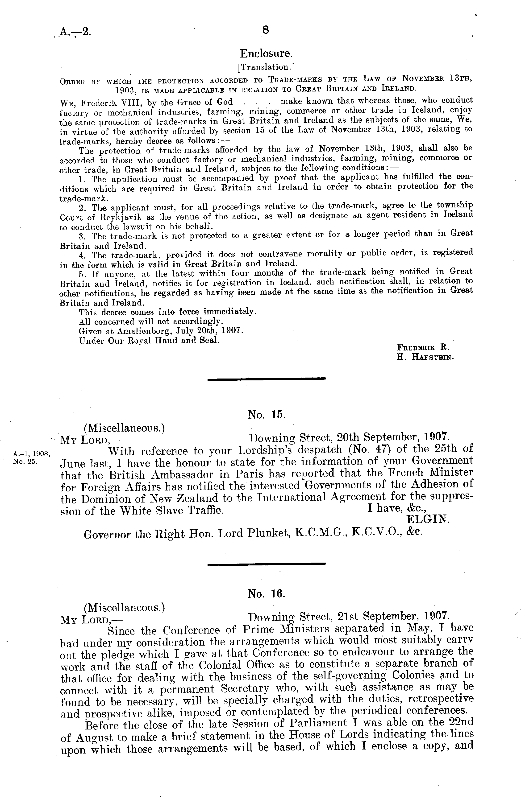 [Translation.] Order by which the protection accorded to Trade-marks by the Law of November 13th, 1903, is made applicable in relation to Great Britain and Ireland. We, Frederik VIII, by the Grace of God . . . make known that whereas those, who conduct factory or mechanical industries, farming, mining, commerce or other trade in Iceland, enjoy the same protection of trade-marks in Great Britain and Ireland as the subjects of the same, We, in virtue of the authority afforded by section 15 of the Law of November 13th, 1903, relating to trade-marks, hereby decree as follows: — The protection of trade-marks afforded by the law of November 13th, 1903, shall also be accorded to those who conduct factory or mechanical industries, farming, mining, commerce or other trade, in Great Britain and Ireland, subject to the following conditions: — 1. The application must be accompanied by proof that the applicant has fulfilled the conditions which are required in Great Britain and Ireland in order to obtain protection for the trade-mark. 2. The applicant must, for all proceedings relative to the trade-mark, agree to the township Court of Reykjavik as the venue of the action, as well as designate an agent resident in Iceland to conduct the lawsuit on his behalf. , 3. The trade-mark is not protected to a greater extent or for a longer period than in Great Britain and Ireland. 4. The trade-mark, provided it does not contravene morality or public order, is registered in the form which is valid in Great Britain and Ireland. 5. If anyone, at the latest within four months of the trade-mark being notified in Great Britain and Ireland, notifies it for registration in Iceland, such notification shall, in relation to other notifications, be regarded as having been made at the same time as the notification in Great Britain and Ireland. This decree comes into force immediately. All concerned will act accordingly. Given at Amalienborg, July 20th, 1907. Under Our Roval Hand and Seal. Frederik R. H. Hafstbin.