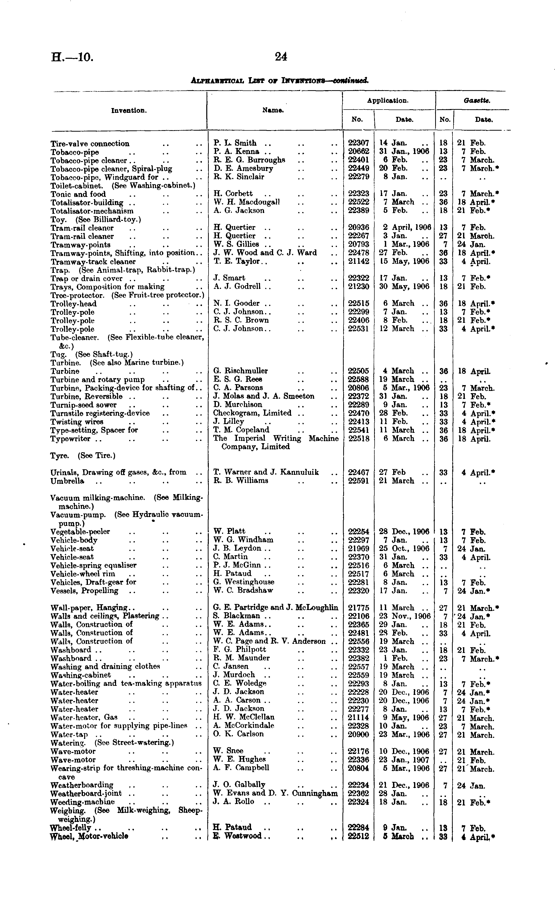 Application. Qatette. Invention. Name. No. Date. No. Date. Tire-valve connection Tobacco-pipe Tobacco-pipe cleaner Tobacco-pipe cleaner, Spiral-plug Tobacco-pipe, Windguard for .. Toilet-oabinet. (See Washing-cabinet.) Tonic and food Totalisator-building .. Totalisator-mechanism Toy. (See Billiard-toy.) Tram-rail cleaner Tram-rail cleaner Tramway-points Tramway-points, Shifting, into posit ion.. Tramway-track cleaner Trap. (Sec Animal-trap, Rabbit-trap.) Trap or drain cover Trays, Composition for making Tree-proteotOT. (See Fruit-tree protector.) Trolley-head .. .. Trolley-pole Trolley-pole Trolley-pole Tube-cleaner. (See Flexible-tube cleaner, &c.) Tug. (See Shaft-tug.) Turbine. (See also Marine turbine.) Turbine Turbine and rotary pump Turbine, Packing-device for shafting of.. Turbine, Reversible Turnip-seed sower Turnstile registering-devioe Twisting wires Type-setting, Spacer for Typewriter P. L. Smith P. A. Kenna .. R. E. G. Burroughs D. E. Amcsburv R. K. Sinclair 22307 20662 22401 22449 22279 14 Jan. 31 Jan., 1906 6 Feb. 20 Feb. 8 Jan. is 13 •23 ■23 21 Feb. 7 Feb. 7 March. 7 March.* H. Corbett .. \V. H. Macdougall A. G. Jackson 22323 22522 22389 17 Jan. 7 March .. 5 Feb. 23 36 is 7 March.* 18 April.* 21 Feb.* H. Quertier H. Quertier .. W. S. Gillies .. J. W. Wood and C. J. Ward T. E. Taylor 20936 22267 20793 22478 21142 2 April, HI06 3 Jan. I Mar., 1906 27 Feb. 15 May, 1900 13 27 7 Sβ 83 7 Feb. 21 March. 24 Jan. 18 April.* 4 April. J. Smart A. J. Godrell .. 22322 21230 17 Jan. 30 May, 1906 13 is 7 Feb.* 21 Feb. N. I. Gooder C. J. Johnson.. R. S. C. Brown C. J. Johnson 22515 22299 22406 22531 6 March .. 7 Jan. 8 Feb. .. 12 March .. 36 18 is 33 18 April.* 7 Fob.* 21 Feb.* 4 April.* G. Rischmuller E. S. G. Rees C. A. Parsons J. Molas and J. A. Smeeton D. Murchison Cheekogram, Limited J. Lilley T. M. Copeland The Imperial Writing Machine Company, Limited 22505 22588 20806 22372 22289 22470 22413 22541 22518 4 March .. 19 March .. 5 Mar., 1906 31 Jan. 9 Jan. 28 Feb. .. 11 Feb. 11 March .. 6 March .. 36 23 is 13 33 33 Sβ 30 18 April. 7 March. 21 Feb. 7 Feb.* 4 April.* 4 April.* 18 April.* 18 April. Tyre. (See Tire.) 22467 22591 27 Feb 21 March .. Urinals, Drawing off gases, &c, from Umbrella T. Warner and J. Kannuluik R. B. Williams 4 April.* S3 Vacuum milking-machine. (See Milkingmachine.) Vacuum-pump. (See Hydraulic vacuumpump.) Vegetable-peeler Vehicle-body Vehicle-seat Vehicle-seat Vehicle-spring equaliser Vehicle-wheel rim Vehicles, Draft-gear for . Propelling W. Platt W. G. Windham J. B. Lovdon C. Martin P. J. McGinn H. Pataud (!. Westinghouse W. C. Bradshaw 22254 22297 21969 22370 22516 22517 22281 22320 28 Dec, 1906 7 Jan. 25 Oct., 1906 31 Jan. 6 March .. 6 March .. 8 Jan. 17 Jan. in 13 7 33 7 Feb. 7 Feb. 24 Jan. 4 April. 7 7 Fei>! 24 Jan.* Wall-paper, Hanging.. W.ills and ceiUngs, Plastering .. W.ilK ('■instruction of Walls, Construction of Walls, Construction of Washboard Washboard Washing and draining clot 1' Washing-cabinet Water-boiling and ten-making apparatus Water-heater Water-heater Water-heater Water-heater, Gas Water-motor for supplying pipe-lines .. Water-tap Watering. (See Street-watering.) Wave-motor Wave-motor Wearing-strip for threshing-machine concave Weatherboarding Weatherboard-joint .. Weecling-machine Weighing. (See Milk-weighing, Sheepweighing. ) Wheel-felly Wheel, Motor-vehicle G. E. Partridge and J. McLimghlin S. Blackman W. E. Adams.. W. E. Adams.. W. C. Page and R. V. Anderson .. F. G. Philpott R. M. Maunder C. Jansen J. Murdoch C. E. Woledge J. D. Jackson A. A. Carson J. D. Jackson H. W. McClellan A. MeCorkindale 0. K. Carlson 21775 22106 22365 22481 22556 22332 22382 22557 22559 22293 22228 22230 22277 21114 22328 209O0 11 March .. 23 Nov., 1906 29 Jan. 2S Feb. 19 March .. 23 Jan. 1 Feb. 19 March .. 19 March .. 8 Jan. 20 Dec., 1906 20 Dec., 1906 8 Jan. 9 May, 1906 10 Jan. •23 Mar., 1906 ■27 7 IS 33 21 March.* '24 Jan.* 21 Feb. 4 April. is ■23 21 Feb. 7 March.* 13 7 7 13 27 23 •J 7 7 Feb.* 24 Jan.* 24 Jan.* 7 Feb.* 21 March. 7 March. 21 March. W. Snee W. E. Hughes A. F. Campbell 22176 22336 20804 10 Dec, 1906 23 Jan., 1907 5 Mar., 1906 ■j 7 21 March. 21 Feb. 21 March. 27 J. O. Galbally W. Evans and I). Y. Cunningham J. A. RoUo 22234 22362 22324 21 Dec, 1906 28 Jan. 18 Jan. 7 24 Jan. is 21 Feb.* H. Pataud .. E. Westwood .. ., ,. 22284 22512 9 Jan. 5 March .. 13 33 7 Feb. 4 April.*