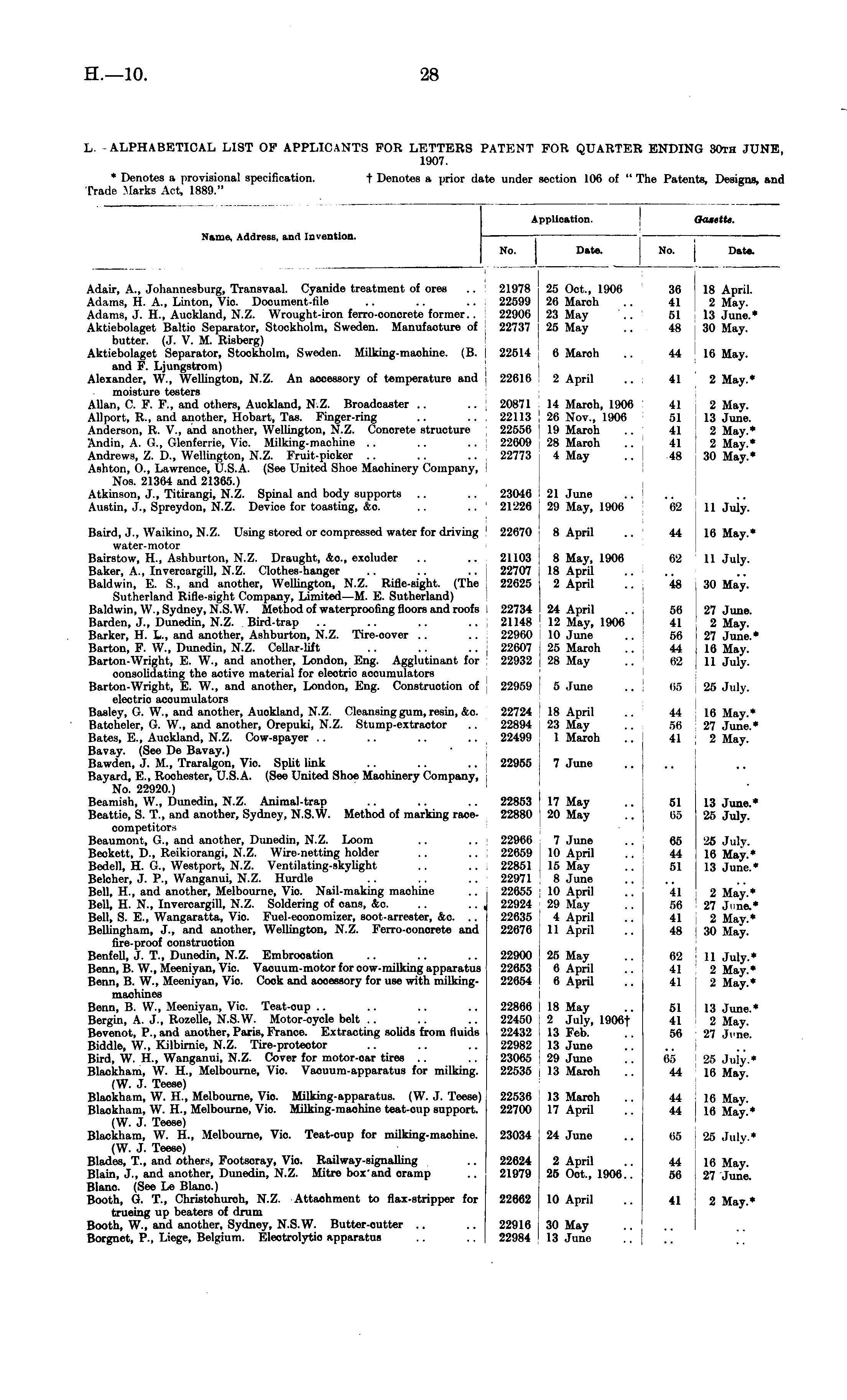 L.-ALPHABETICAL LIST OF APPLICANTS FOR LETTERS PATENT FOR QUARTER ENDING 30th JUNE, 1907.