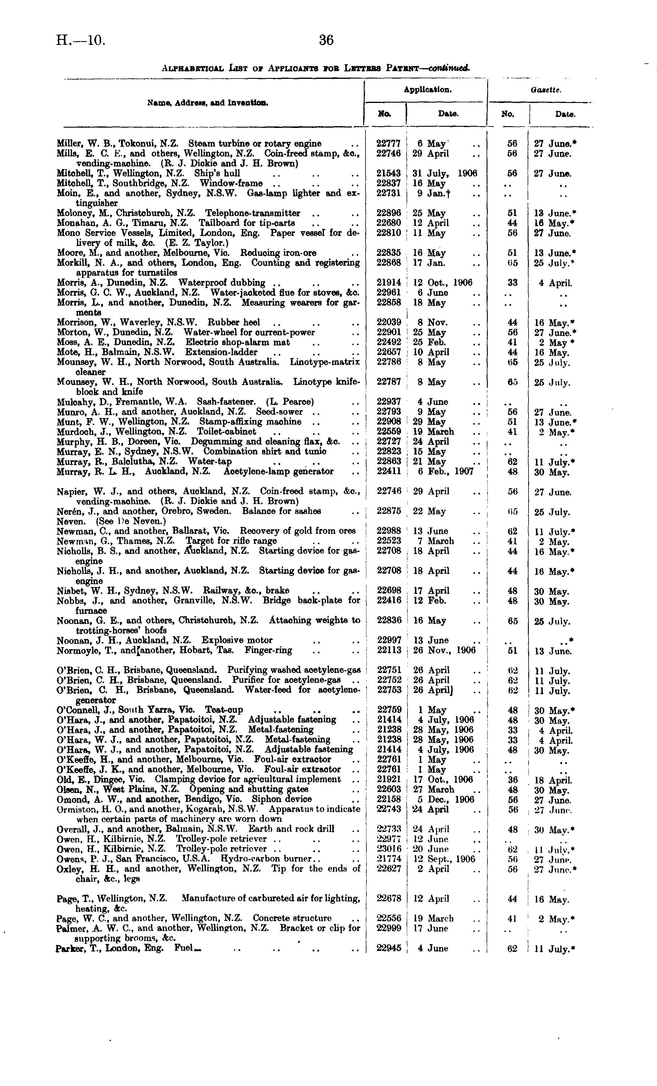 >P1>] ical ion. I rue I >.tr. Name, Address, and Invention. Nα Date. No. Date. Miller, W. B., Tokonui, N.Z. Steam turbine or rotary engine Mills, E. C. E., and others, Wellington, N.Z. Coin-freed stamp, &o., vending-machine. (R. J. Diokie and J. H. Brown) Mitchell, T., Wellington, N.Z. Ship's hull Mitchell, T., Southbridge, N.Z. Window-frame .. Moin, E., and another, Sydney, N.S.W. Gas-lamp lighter and extinguisher Moloney, M., Christchuroh, N.Z. Telephone-transmitter Monahan, A. G., Timaru, N.Z. Tailboard for tip-oarts Mono Servioe Vessels, Limited, London, Eng. Paper vessel for delivery of milk, &o. (E. Z. Taylor.) Moore, M., and another, Melbourne, Vic Reducing iron-ore Morkill, N. A., and others, London, Eng. Counting and registering apparatus for turnstiles Morris, A., Dunedin, N.Z. Waterproof dubbing Morris, G. C. W., Auckland, N.Z. Water-jaoketed flue for stoves, &c Morris, L., and another, Dunedin, N.Z. Measuring wearers for garments Morrison, W., Waverley, N.S.W. Rubber heel Morton, W., Dunedin, N.Z. Water-wheel for ourrent-power Moss, A. E., Dunedin, N.Z. Electrio shop-alarm mat Mote, H., Balmain, N.S.W. Extension-ladder Mounsey, W. H., North Norwood, South Australia. Linotype-matrix oleaner Mounsey, W. H., North Norwood, South Australia. Linotype knifeblook and knife Mulcahy, D., Fremantle, W.A. Sash-fastener. (L. Pearoe) Munro, A. H., and another, Auckland, N.Z. Seed-sower Munt, F. W., Wellington, N.Z. Stamp-affixing machine Murdoch, J., Wellington, N.Z. Toilet-oabinet Murphy, H. B., Doreen, Vic Degumming and cleaning flax, &c. Murray, E. N., Sydney, N.S.W. Combination shirt and tunio Murray, R., Balolutha, N.Z. Water-tap .. Murray, R. L. H., Auokland, N.Z. Aoetylene-lamp generator 22777 6 May 22746 29 April 21543 31 July, 1906 22837 16 May 22731 ! 9 Jan.| 56 56 56 27 June.* 27 June. 27 June. 22896 25 May 22680 12 April 22810 11 May 51 44 56 13 June.* Iβ May.* 27 June. 22835 16 May 22868 17 Jan. 51 68 13 June.* 2f> July.' 21914 12 Oot, 1906 22961 6 June 22858 18 May 22039 8 Nov. 22901 25 May 22492 25 Feb. 22657 10 April 22786 8 May 33 4 April. 44 56 41 44 t>5 16 May.* 27 June.* 2 May* 16 May. 25 July. 22787 8 May 65 25 July. 22937 4 June 22793 9 May 22908 29 May 22559 19 March 22727 24 April 22823 15 May 22863 21 May 22411 6 Feb., 1907 56 51 41 27 June. 13 June.* 2 May.* 62 48 11 July.* 30 May. Napier, W. J., and others, Auckland, N.Z. Coin-freed stamp, &c, vending-maohine. (R. J. Diokie and J. H. Brown) Neren, J., and another, Orebro, Sweden. Balance for sashes Neven. (See l)e Neven.) Newman, C, and another, Ballarat, Vic. Recovery of gold from ores Newman, G., Thames, N.Z. Target for rifle range Nioholls, B. S., and another, N.Z. Starting device for gasengine Nioholls, J. H., and another, Auokland, N.Z. Starting devioe for gasengine Nisbet, W. H., Sydney, N.S.W. Railway, &c, brake Nobbs, J., and another, Granville, N.S.W. Bridge baok-plate for furnace Noonan, G. E., and others, Christohuroh, N.Z. Attaching weights to trotting-horses' hoofs Noonan, J. H., Auckland, N.Z. Explosive motor Normoyle, T., andjanother, Hobart, Tas. Finger-ring 22746 29 April 56 27 June. 22875 22 May 66 26 July. 22988 13 June 22523 7 March 22708 18 April 62 41 44 11 July.* 2 May. 16 May,* 22708 18 April 44 16 May.* 22698 17 April 22416 12 Feb. 48 48 30 May. 30 May. 22836 16 May 65 25 July. 22997 13 June 22113 26 Nov., 1906 51 13 June. O'Brien, C. H., Brisbane, Queensland. Purifying washed acetylene-gas O'Brien, C. H., Brisbane, Queensland. Purifier for acetylene-gas O'Brien, C. H., Brisbane, Queensland. Water-feed for aoetylenegenerator O'Connell, J., South Yarra, Vic Teat-oup O'Hara, J., and another, Papatoitoi, N.Z. Adjustable fastening O'Hara, J., and another, Papatoitoi, N.Z. Metal-fastening O'Hara, W. J., and another, Papatoitoi, N.Z. Metal-fastening O'Hara, W. J., and another, Papatoitoi, N.Z. Adjustable fastening O'Keeffo, H., and another, Melbourne, Vic Foul-air extractor O'Keeffe, J. K., and another, Melbourne, Vic Foul-air extractor Old, E., Dingee, Vic Clamping devioe for agricultural implement .. Olsen, N., West Plains, N.Z. Opening and shutting gates Omond, A. W., and another, Bendigo, Vic Siphon devioe Ormiston, IL. (.).. and another, Kogarah, N.S.W. Apparatus to indicate when certain porta of machinery are worn down Ovenvll, J., an<l another, Balinain, N.S.W. Earth and rock drill Owen, EL, Kilbimie, N.Z. Trolley-pale retriever .. Owen, H., Kilbirnic, N.Z. Trolley-pole retriever .. Owen-, P. J., San Francisco, U.S.A. Hydro-carbon burner.. Oxley, H. H., and another, Wellington, N.Z. Tip for the ends of chair, &c, legs 22751 26 April 22752 26 April 22753 26 April] 62 62 62 11 July. 11 July. 11 July. 22759 1 May 21414 4 July, 1906 21238 28 May, 1906 21238 28 May, 1906 21414 4 July, 1906 22761 1 May 22761 1 May 21921 17 Oct., 1906 22603 27 March 22158 5 Dec., 1906 22743 '24 April 48 48 33 33 48 30 May.* 30 May. 4 April. 4 April. 30 May. 36 48 56 N 18 April. 30 May. 27 June. '27 Jane. 22733 24 April 22977 12 June 23016 20 June 21774 12 Sept, 1906 22627 2 April 48 30 May.* 62 Sβ 56 il July.* •27 June. 27 June.* Page, T., Wellington, N.Z. Manufacture of carbureted air for lighting, heating, Ac. Page, W. C, and another, Wellington, N.Z. Concrete structure Palmer, A. W. C, and anothor, Wellington, N.Z. Bracket or clip for supporting brooms, fee. Parker, T., London, Eng. Fuel_ 22678 12 April 44 Iti May. 22556 111 March 22999 17 June 41 2 May.* 22945 4 June 62 11 July.*