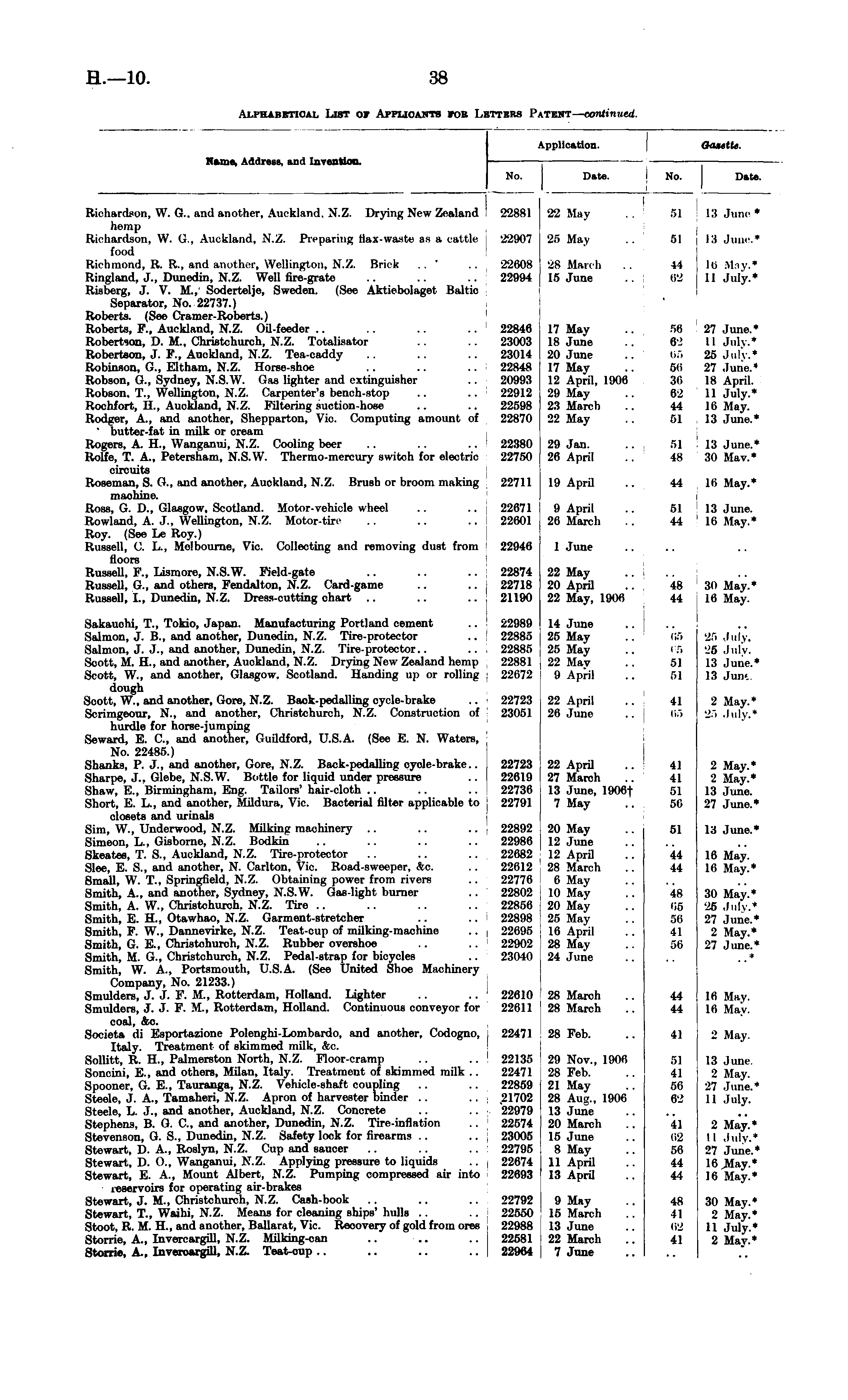 Application. CkuttU. Name, Address, and Invention. No. Date. No. Date. Richardson, W. G.. and another, Auckland. N.Z. Drying New Zealand 22881 hemp Richardson, W. G., Auckland, N.Z. Preparing flax-waste as a cattle 22907 food Richmond, R. R., and another, Wellington, N.Z. Brick .. ' .. 22608 Ringland, J., Dunedin, N.Z. Well fire-grate .. .. .. 22994 Risberg, J. V. M., Sodertelje, Sweden. (See Aktiebolaget Baltic Separator, No. 22737.) Roberts. (See Cramer-Roberts.) Roberts, F., Auckland, N.Z. Oil-feeder .. .. .. .. 22846 Robertson, D. M., Christchurch, N.Z. Totalisator .. .. 23003 Robertson, J. ¥., Auckland, N.Z. Tea-caddy .. .. .. 23014 Robinson, G., Eltham, N.Z. Horse-shoe .. .. .. 22848 Robson, G., Sydney, N.S.W. Gas lighter and extinguisher .. 20993 Robson. T., Wellington, N.Z. Carpenter's bench-stop .. .. 22912 Rochfort, H., Auckland, N.Z. Filtering suction-hose .. .. 22598 Rodger, A., and another, Shepparton, Vic Computing amount of 22870 " butter-fat in milk or cream Rogers, A. H., Wanganui, N.Z. Cooling beer .. .. .. 22380 Rolfe, T. A., Petersham, N.S.W. Thermo-mercury switch for electric 22750 circuits Roseman, S. G., and another, Auckland, N.Z. Brush or broom making 22711 machine. Ross, G. D., Glasgow, Scotland. Motor-vehicle wheel .. .. 22671 Rowland, A. J., Wellington, N.Z. Motor-tin* .. .. .. 22601 Roy. (See Le Roy.) Russell, C. L., Molbourne, Vic. Collecting and removing dust from 22946 floors Russell, F., Lismore, N.S.W. Field-gate .. .. .. 22874 Russell, G., and others, Fendalton, N.Z. Card-game .. .. 22718 Russell, I., Dunedin, N.Z. Dress-cutting chart .. .. .. 21190 Sakauchi, T., Tokio, Japan. Manufacturing Portland cement .. 22989 Salmon, J. B., and another, Dunedin, N.Z. Tire-protector .. 22885 Salmon, J. J., and another, Dunedin, N.Z. Tire-protector.. .. 22885 Scott, M. H., and another, Auckland, N.Z. Drying New Zealand hemp 22881 Scott, W., and another, Glasgow. Scotland. Handing up or rolling : 22672 dough Scott, W., and another, Gore, N.Z. Baok-pedalling cycle-brake .. 22723 Scrimgeour, N., and another, Christchurch, N.Z. Construction of 23051 hurdle for horee-jumping Seward, E. C, and another, Guildford, U.S.A. (See E. N. Waters, No. 22485.) Shanks, P. J., and another, Gore, N.Z. Back-pedalling cycle-brake.. 22723 Sharpe, J., Glebe, N.S.W. Bottle for liquid under pressure .. 22619 Shaw, EC, Birmingham, Eng. Tailors' hair-cloth .. .. . . 22736 Short, E. L., and another, Mildura, Vic. Bacterial filter applicable to 22791 closets and urinals Sim, W., Underwood, N.Z. Milking machinery .. .. .. 22892 Simeon, L., Gisborne, N.Z. Bodkin .. .. .. .. 22986 Skeatee, T. S., Auckland, N.Z. Tire-protector .. .. . . 22682 Slee, E. S., and another, N. Carlton, Vic. Road-sweeper, Ac. .. 22612 Small, W. T., Springfield, N.Z. Obtaining power from rivers .. 22776 Smith, A., and another, Sydney, N.S.W. Gas-light burner .. 22802 Smith, A. W., Christchurch. N.Z. Tire .. .. .. . . 22856 Smith, E. H., Otawhao, N.Z. Garment-stretcher .. . . 22898 Smith, F. W., Dannevirke, N.Z. Teat-cup of milking-machine .. , 22695 Smith, G. E., Christchurch, N.Z. Rubber overshoe .. .. 22902 Smith, M. G., Christchurch, N.Z. Pedal-strap for bicycles .. 23040 Smith, W. A., Portsmouth, U.S.A. (See United Shoe Machinery Company, No. 21233.) Smulders, J. J. F. M., Rotterdam, Holland. Lighter .. .. 22610 Smulders, J. J. F. M., Rotterdam, Holland. Continuous conveyor for 22611 coal, &c. Societa di Esportazione Polenghi-Lombardo, and another, Codogno, 22471 Italy. Treatment of skimmed milk, &c. Sollitt, R. H., Palmerston North, N.Z. Floor-cramp .. .. 22135 Soncini, E., and others, Milan, Italy. Treatment of skimmed milk .. 22471 Spooner, G. E., Tauranga, N.Z. Vehicle-shaft coupling .. .. 22859 Steele, J. A., Tamaheri, N.Z. Apron of harvester binder .. .. 21702 Steele, L. J., and another, Auckland, N.Z. Concrete .. .. 22979 Stephens, B. G. C, and another, Dunedin, N.Z. Tire-inflation .. 22574 Stevenson, G. S., Dunedin, N.Z. Safety lock for firearms .. .. 23005 Stewart, D. A., Roslyn, N.Z. Cup and saucer .. .. .. 22795 Stewart, D. ()., Wanganui, N.Z. Applying pressure to liquids .. 22674 Stewart, E. A., Mount Albert, N.Z. Pumping compressed air into 22693 reservoirs for operating air-brakes Stewart, J. M., Christchurch, N.Z. Cash-book .. .. .. 22792 Stewart, T., Waihi, N.Z. Means for cleaning ships' hulls .. .. 22550 Stoot, R. M. H., and another, Ballarat, Vic. Recovery of gold from ores 22988 Storrie, A., Invercargill, N.Z. Milking-can .. .. .. j 22581 Storrie, A., Inveroargill, N.Z. Teat-cup.. .. .. .. | 22964 I 22 May 25 May 28 March 15 June 17 May 18 June 20 June 17 May 12 April, 1906 29 May 23 March 22 May 29 Jan. 26 April 19 April 9 April 26 March 1 June 22 May 20 April 22 May, 1006 14 June 25 May 25 May 22 May 9 April 22 April 26 June BJ 13 June * r>1 in June.* li li, May. , eS 11 July.* 56 27 June.* 62 II July.* U5 25 July.* "iii 27 June.' 30 18 April. 62 11 July.* 44 16 May. 51 13 June.* 51 13 June.* 48 30 Mav.* 44 16 May.* 51 13 June. 44 ' 16 May.* 48 30 May.* 44 16 May. <;:. ■>:< Juiy. l!5 'J6 .Inly. 51 13 June.* 51 13 Jun< 41 2 May.* li"> 2"> July.* 22 April 27 March 13 June, 1906f 7 May 41 2 May.* 41 2 May.* 51 13 June. 56 27 June.* 20 May 12 June 12 April 28 March 6 May 10 May 20 May 25 May 16 April 28 May 24 June 51 13 June.* 44 16 May. 44 16 May.* 48 30 May.* 05 '25 .fiily.* 56 27 June.* 41 2 May.* Bβ 27 June.* * 28 March 28 March 44 16 May. 44 16 May. 28 Feb. 41 2 Maj 29 Nov., 1906 28 Feb. 21 May 28 Aug., 1906 13 June 20 March 15 June 8 May 11 April 13 April 51 13 June. 41 2 May. • r >() 27 June.* 62 11 July. '4l 2 May.* 62 II July.* 56 27 June.* 44 16 JMay.* 44 16 May.* 9 May 15 March 13 June 22 March 7 June 48 30 May.* 41 2 May.* 68 11 July.* 41 2 May.*