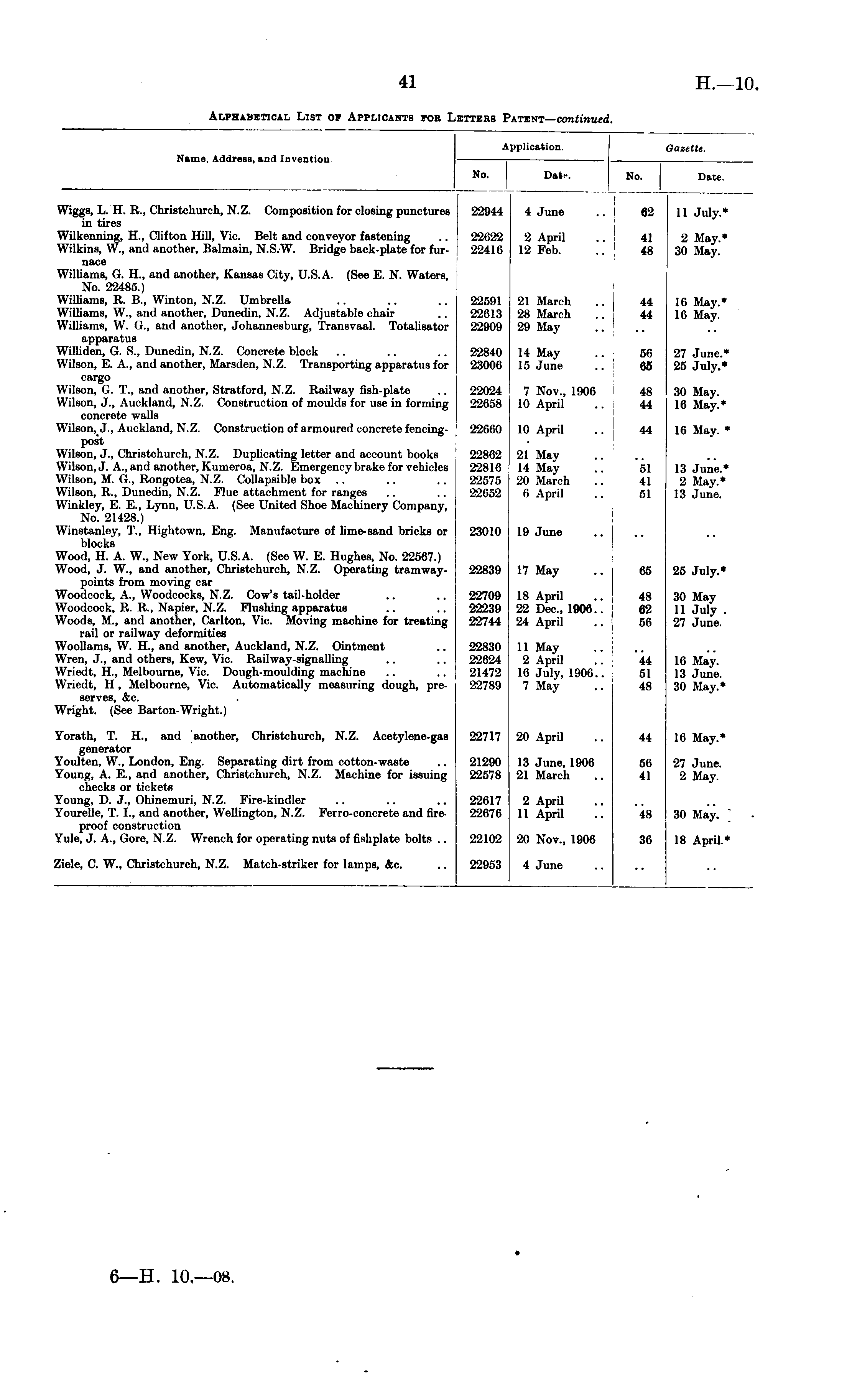 .ppl Ileal lion. Gazette. Name, Address, and invention No. Date No. Date. Wiggs, L. H. R., Christchurch, N.Z. Composition for closing punctures in tires Wilkenning, H., Clifton Hill, Vic. Belt and conveyor fastening Wilkins, W., and another, Balmain, N.S.W. Bridge back-plate for furnace Williams, G. H., and another, Kansas City, U.S.A. (See E. N. Waters, No. 22485.) Williams, R. B., Winton, N.Z. Umbrella Williams, W., and another, Dunedin, N.Z. Adjustable chair Williams, W. (!., and another, Johannesburg, Transvaal. Totalisator apparatus Williden, G. S., Dunedin, N.Z. Concrete block Wilson, E. A., and another, Marsden, N.Z. Transporting apparatus for cargo Wilson, G. T., and another, Stratford, N.Z. Railway fish-plate Wilson, J., Auckland, N.Z. Construction of moulds for use in forming concrete walls Wilson,_ J., Auckland, N.Z. Construction of armoured concrete fencingpost Wilson, J., Christchurch, N.Z. Duplicating letter and account books Wilson, J. A., and another, Kumeroa, N.Z. Emergency brake for vehicles Wilson, M. G., Rongotea, N.Z. Collapsible box Wilson, R., Dunedin, N.Z. Flue attachment for ranges Winkley, E. E., Lynn, U.S.A. (See United Shoe Machinery Company, No. 21428.) Winstanley, T, Hightown, Eng. Manufacture of lime-sand bricks or blocks Wood, H. A. W., New York, U.S.A. (See W. E. Hughes, No. 22567.) Wood, J. W., and another, Christchurch, N.Z. Operating tramwaypoints from moving car Woodcock, A., Woodcocks, N.Z. Cow's tail-holder Woodcock, R. R., Napier, N.Z. Flushing apparatus Woods, M., and another, Carlton, Vic. Moving machine for treating rail or railway deformities Woollams, W. H., and another, Auckland, N.Z. Ointment Wren, J., and others, Kew, Vic. Railway-signalling Wriedt, H., Melbourne, Vic. Dough-moulding machine Wriedt, H, Melbourne, Vic. Automatically measuring dough, preserves, Ac Wright. (See Barton-Wright.) 22944 22622 22416 22591 22613 22909 22840 23006 22024 22658 22660 22862 22816 22575 22652 4 June 2 April 12 Feb. 21 March 28 March 29 May 14 May 15 June 7 Nov., 1906 10 April 10 April 21 May 14 May 20 March 6 April 62 41 48 44 44 56 65 48 44 44 51 41 51 11 July.* 2 May.* 30 May. 16 May.* 16 May. 27 June.* 25 July.* 30 May. 16 May.* 16 May. * 13 June.* 2 May.* 13 June. 23010 19 June 22839 17 May 65 25 July.* 22709 22239 22744 18 April 22 Dec, 1906.. 24 April 48 62 56 30 May 11 July . 27 June. 22830 22624 21472 22789 11 May 2 April 16 July, 1906.. 7 May 44 51 48 16 May. 13 June. 30 May.* Yorath, T. H., and another, Christchurch, N.Z. Acetylene-gas generator Youlten, W., London, Eng. Separating dirt from cotton-waste Young, A. E., and another, Christchurch, N.Z. Machine for issuing checks or tickets Young, D. J., Ohinemuri, N.Z. Fire-kindler Yourelle, T. I., and another, Wellington, N.Z. Ferro-concrete and fireproof construction Yule, J. A., Gore, N.Z. Wrench for operating nuts of fishplate bolts .. 22717 20 April 44 16 May.* 21290 22578 13 June, 1906 21 March 56 41 27 June. 2 May. 22617 22676 2 April 11 April 48 30 May. 22102 20 Nov., 1906 36 18 April.* Ziele, C. W., Christchurch, N.Z. Match-striker for lamps, Ac. 22953 4 June