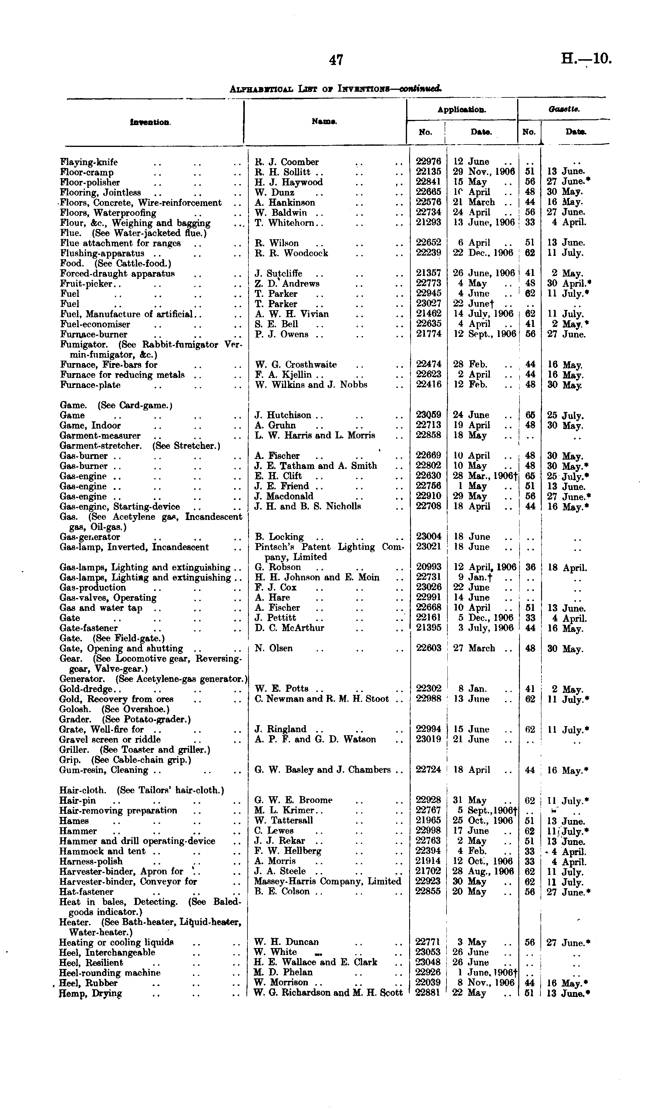 l>pl ion. Invention Name. No. Date. No. Data. Flaying-knifc Floor-cramp Floor-polisher Flooring, Jointless ■Floors, Concrete, Wire-reinforcement .. Floors, Waterproofing Flour, &c, Weighing and bagging Flue. (See Water-jacketed flue.) Flue attachment for ranges flushing-apparatus Food. (See Cattle-f ood.) Forced-draught apparatus Fruit-pioker.. I'll,] Fuel Fuel, Manufacture of artificial.. ETuel-economiier Furnace-burner Fumigator. (See Rabbit-fnmigator Ver-min-fumigator, &c.) Furnace, Fire-bars for Furnace for reducing metals Furnace-plate R. J. Coomber R. H. Sollitt H. J. Haywood .. ,. W. Diinz A. Hankinson W. Baldwin .. T. Whitehorn.. 22976 22135 22841 22665 22576 22734 21293 12 June .. ; 29 Nov., 1906 ' 15 May .. ! 1C April .. I 21 March .. | 24 April .. 13 June, 1906 .".I Bβ 48 44 Bβ 33 13 June. 27 June.* 30 May. 10 May. 27 June. 4 April. R. Wilson R. R. Woodoook 22652 22239 6 April .. 22 Deo., L906 61 82 13 June. 11 July. J. Sutcliffe Z. D. Andrews T. Parker T. Parker A. W. H. Vivian S. E. Bell P. J. Owens .. 21357 22773 22945 23027 21462 22635 21774 26 June, 1906 4 May 4 June 22 Juni-t .. 14 July, 1906 4 April .. 12 Sept., 1906 41 IS 82 62 41 Bβ 2 May. 30 April.* 11 July.* 11 July. 2 May* 27 June. W. G. Crosthwaite F. A. Kjellin .. W. Wilkins and J. Nobbs 22474 22623 22416 28 Feb. 2 April . . 12 Feb. 44 44 IS 16 May. 16 May. 30 May. Game. (See Card-game.) Game Game, Indoor Garment-measurer Garment-stretcher. (See Stretcher.) Gas-burner Gas-burner Gas-engine Gas-engine Gas-engine Gas-engine, Starting-device Gas. (See Acetylene gas, fncandeeceni gas, Oil-gas.) Gas-gerierator Gas-lamp, Inverted, Incandescent J. Hutchison A. Gruhn L. W. Harris and L. Morris A. Fischer J. E. Tatham and A. Smith E. H. Clift .. J. E. Friend .. J. Macdonald J. H. and B. S. Nieholls 23059 22713 22858 22669 22802 22630 22756 22910 22708 24 June 19 April .. 18 May ID April .. 10 May 28 Mar., 1906f ( 1 May .. 29 May IS A mil .. IB 48 48 is 68 SI Bβ 14 25 July. 30 May. 30 May. 30 May.* 25 July.* 13 June. 27 June.* 16 May.* Gas-lamps, Lighting and extinguishing .. Gas-lamps, Lighting and extinguishing .. Gas-production Gas-valves, Operating Gas and water tap Gate Gate-fastener Gate. (See Field-gate.) Gate, Opening and shutting Gear. (See Locomotive gear, Reversinggcar, Valve-gear.) Generator. (See Acetylene-gas generator.) Gold-dredge Gold, Recovery from ores Golosh. (See Overshoe.) Grader. (See Potato-grader.) Grate, Well-fire for .. Gravel screen or riddle Griller. (See Toaster and griller.) Grip. (See Cable-chain grip.) Gum-resin, Cleaning B. Locking Pintaoh'e Patent lighting Company, Limited G. Robson H. H. Johnson and E. Moin F. J. Cox A. Hare A. Fischer J. Pettitt D. C. McArthur 23004 23021 20993 22731 23026 22991 22668 22161 2139S 18 June 18 June 12 April, 1906 9 Jan.f .. 22 June 14 June 10 April . . 5 Dec, 1906 3 July, 1906 Sβ 18 April. BJ 33 44 13 June. 4 April. Lβ May. N. Olsen 22603 27 March .. 48 30 May. W. E. Potts C. Newman and R, M. H. Stoot .. 22302 22988 8 Jan. 13 June 41 63 2 May. 11 July.* J. Ringland A. P. F. and G. D. Watson 22994 23019 15 June 2] June 62 11 July.* G. W. Basley and J. Chambers .. 22724 18 April .. 44 Iβ May.* Hair-cloth. (See Tailors' hair-cloth.) Hair-pin Hair-removing preparation Hames G. W. E. Broome M. L. Krimer W. Tattersall C. Lewes .1. J. Rekar .. F. W. HeBberg A. Morris J. A. Steele Masacy-Harris Company, Limited B. E. Colson .. 22928 22767 21965 22998 22763 22394 21914 21702 22923 22855 31 May 5 Sept.,1906t 25 Oct., 1906 17 June 2 May 4 Feb. 12 Oct., 1906 28 Aug.. 1906 30 May 20 May .. 62 II July.* 13 June. II July.* 13 June. • 4 April. 4 April. 11 July. II July. 27 June.* Hammer Iliimni'T and drill operating-device Hammock and tent Harness-polish Harvester-binder, Apron for Harvester-binder, Conveyor for Hat-fastener Heat in bales. Delecting. (See Baledgoods indicator.) Heater. (See Bath-heater, Lifjuid-heater, Water-heater.) Beating or cooling liquids Heel, Interchangeable Heel, Resilient Heel-rounding machine Heel, Rubber Hemp, Drying BJ 62 51 38 33 62 62 Bβ W. H. Duncan W. White H. E. Wallace and E. Clark M. D. Phelan W. Morrison W. G. Richardson and M. H. Scott 22771 23053 23048 22926 22039 22881 3 May 26 June 26 June I June. !906f 8 Nov., 1906 22 May Bβ 27 June.* 44 51 16 May.* 13 June.*