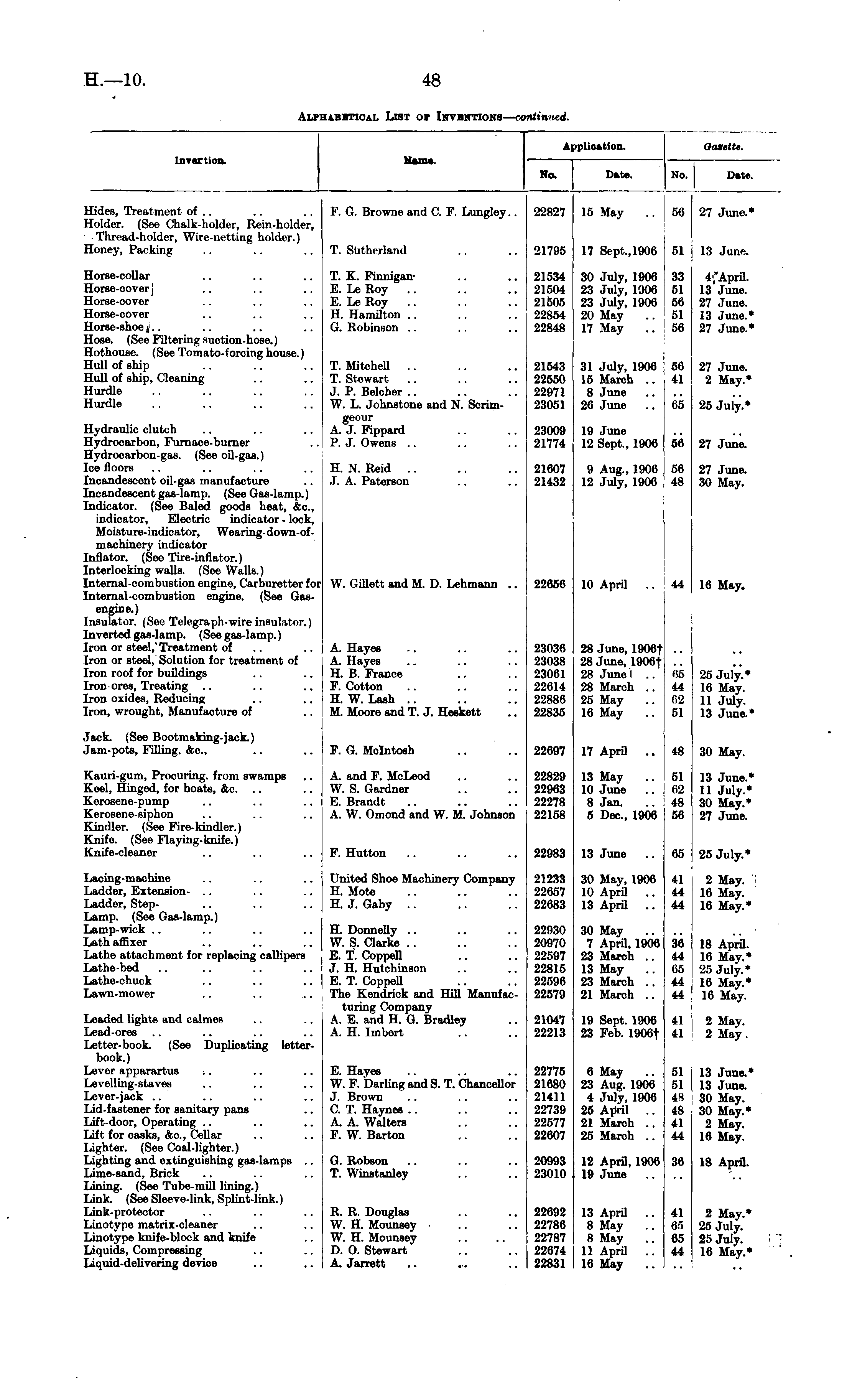Application. GatetU. Insertion. No. Data. No. Date. Hides, Treatment of .. Holder. (See Chalk-holder, Rein-holder, Thread-holder, Wire-netting holder.) Honey, Packing F. G. Browne and C. F. Lungley.. 22827 15 May 56 27 June.* T. Sutherland 21795 17 Sept.,1906 51 13 June. Horse-collar Horse-cover Horse-cover Horse-cover Horse-shoe t.. Hose. (See Filtering suction-hose.) Hothouse. (See Tomato-forcing house.) Hull of ship Hull of ship, Cleaning Hurdle Hurdle T. K. FinniganE. Le Roy E. Le Roy H. Hamilton .. G. Robinson .. 21534 21504 21505 22854 22848 30 July, 1906 23 July, 1906 23 July, 1906 20 May 17 May 33 51 56 51 56 4; April. 13 June. 27 June. 13 June.* 27 June* T. Mitchell .. T. Stewart J. P. Belcher .. W. L. Johnstone and N. Scrimgeour A. J. Fippard P. J. Owens 21543 22550 22971 23051 31 July, 1906 15 March .. 8 June 26 June 66 41 66 27 June. 2 May.* 25 July.* Hydraulic clutch Hydrocarbon, Furnace-burner Hydrocarbon-gas. (See oil-gas.) [ce floors Incandescent oil-gas manufacture Incandescent gas-lamp. (See Gas-lamp.) Indicator. (See Baled goods heat, Ac, indicator, Electric indicator - lock, Moisture-indicator, Wearingdown-of-machinery indicator [nflator. (See Tire-inflator.) Interlocking walls. (See Walls.) [nternal-combustion engine, Carburetter for [nternal-combustion engine. (See Gasengine.) Insulator. (See Telegraph-wire insulator.) Inverted gas-lamp. (See gas-lamp.) [ron or steel,' Treatment of Iron or steel, Solution for treatment of Iron roof for buildings Iron ores, Treating [ron oxides, Reducing [ron, wrought, Manufacture of H. N. Reid J. A. Paterson W. Gillett and M. D. Lehmann .. 23009 21774 21607 21432 19 June 12 Sept., 1906 9 Aug., 1906 12 July, 1906 56 56 48 27 June. 27 June. 30 May. 22056 10 April .. 16 May. A. Hayes A. Hayes H. B. France F. Cotton H. W. Lash M. Moore and T. J. Heskett 23036 23038 23061 22614 22886 22835 28 June, 1906+ 28 June, 1906f 28 June I 28 March .. 25 May 16 May (15 44 62 51 25 July.* 16 May. 11 July. 13 June.* rack. (See Bootmaknng-jack.) lam-pots, Filling. Ac, F. G. Mcintosh 22697 17 April .. 30 May. 48 Kauri-gum, Procuring, from swamps Keel, Hinged, for boats, Ac Kerosene-pump Kerosene-siphon Kindler. (See Fire-kindler.) Knife. (See Flaying-knife.) Knife-cleaner A. and F. McLecd W. S. Gardner E. Brandt A. W. Omond and W. M. Johnson 22829 22963 22278 22158 13 May 10 June 8 Jan. 5 Dec, 1906 51 62 48 56 13 June.* 11 July.* 30 May.* 27 June. F. Hutton 22983 13 June 65 25 July.* Lacing-machine Ladder, ExtensionLadder, StepLamp. (See Gas-lamp.) Lamp-wick Lath affixer Lathe attachment for replacing callipers Lathe-bed Lathe-chuck Lawn-mower United Shoe Machinery Company H. Mote H. J. Gaby 21233 22657 22683 30 May, 1906 10 April .. 13 April .. 41 44 44 2 May. 16 May. 16 May.* H. Donnelly .. W. S. Clarke .. E. T. Coppell J. H. Hutchinson E. T. Coppell The Kendrick and Hill Manufacturing Company A. E. and H. G. Bradley A. H. Imbert 22930 20970 22597 22815 22596 22579 30 May 7 April, 1906 23 March .. 13 May 23 March .. 21 March .. 36 44 (i5 44 44 18 April. 16 May.* 25 July.* 16 May.* 16 May. Leaded lights and calmes Lead-ores Letter-book. (See Duplicating letterbook. ) Lever apparartus Levelling-staves Lever-jack Lid-fastener for sanitary pans Lift-door, Operating Lift for casks, Ac, Cellar Lighter. (See Coal-lighter.) Lighting and extinguishing gas-lamps .. Lime-sand, Brick .. .. Lining. (See Tube-mill lining.) Link. (See Sleeve-link, Splint-link.) Link-protector Linotype matrix-cleaner Linotype knife-block and knife Liquids, Compressing .. Liquid-delivering device .. .. E. Hayes W. F. Darling and S. T. Chancellor J. Brown C. T. Haynes A. A. Walters F. W. Barton 21047 22213 22775 21680 21411 22739 22577 22607 19 Sept. 1906 23 Feb. 1906+ 6 May 23 Aug. 1906 4 July, 1906 25 April .. 21 March .. 25 March .. 41 41 51 51 4S 4.S 41 44 2 May. 2 May. 13 June.* 13 June. 30 May. 30 May.* 2 May. 16 May. G. Robson T. Winstanley 20993 23010 12 April, 1906 19 June 36 18 April. R. R. Douglas W. H. Mounsey - W. H. Mounsey D. 0. Stewart A. Jarrett 22692 22786 22787 22674 22831 13 April 8 May 8 May 11 April 16 May .. 41 66 65 44 2 May.* 25 July. 25 July. 16 May.*
