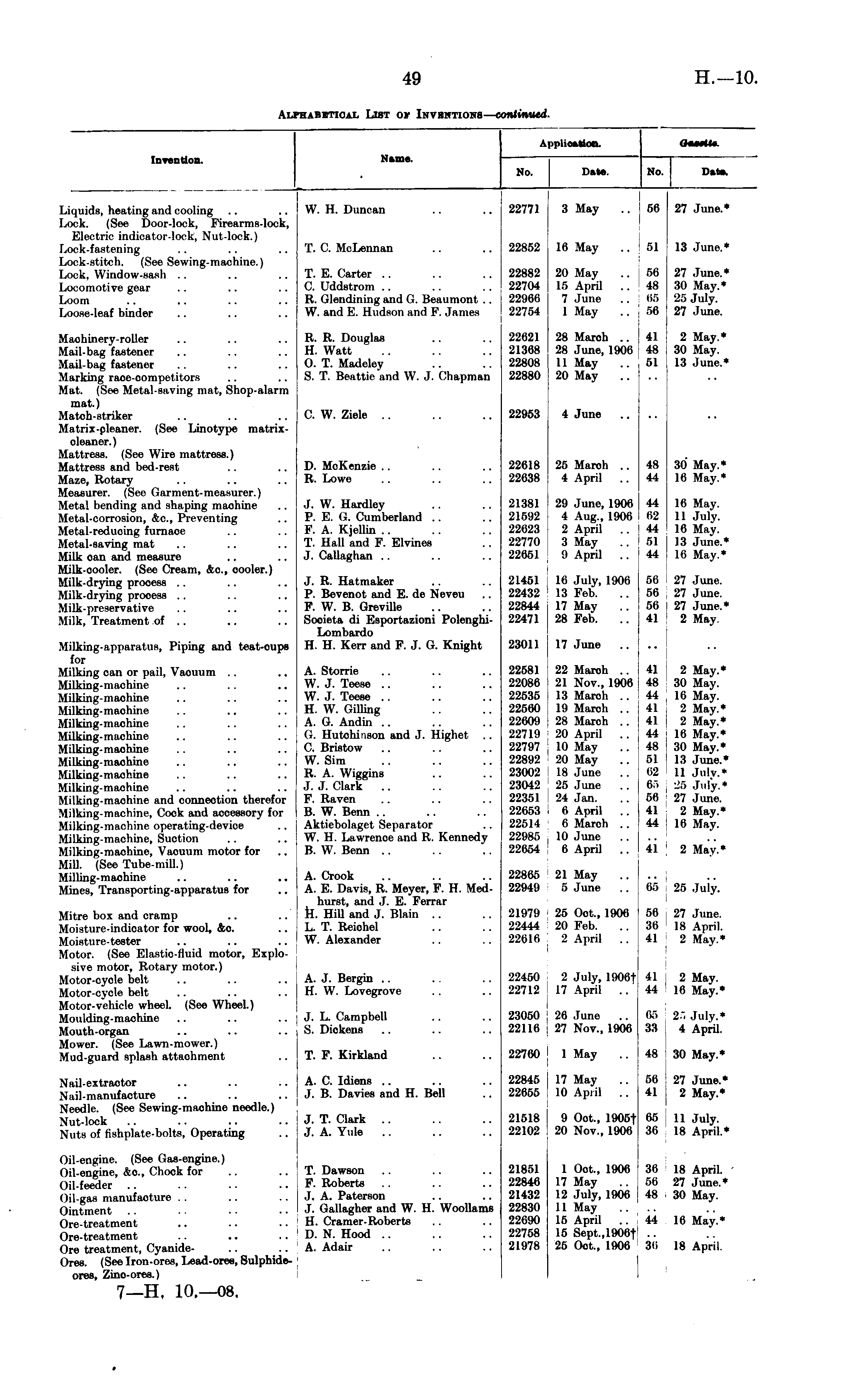 Application. Invention. Name. No. Date. No. Data. Liquids, heating and cooling Lock. (See Door-lock, Firearms-lock, Electric indicator-lock, Nut-lock.) Lock-fastening Look-ititoh. (See Sewing-machine.) Look, Window-sash .. Locomotive gear Loom Loose-leaf binder W. H. Duncan 22771 3 May Sβ 56 27 June.* T. C. McLennan 22852 Iβ May 61 51 13 June.* T. K. (!arter C. Uddstrom .. R. Glendining and G. Beaumont .. W. and E. Hudson and F. JttmM 22882 22704 22960 22754 20 May 15 April .. 7 June 1 May .. 66 48 66 66 56 48 65 56 27 June.* 30 May.* SiS July. 27 June. Machinery-roller Mail-bag fastener Mail-bag fastener Marking raoe-oompetitors Mat. (See Metal-saving mat, Shop-alarm mat.) Match-striker Matrix-pleaner. (See Linotype matrixoleaner.) Mattress. (See Wire mattress.) Mattress and bed-rest Maze, Rotary Measurer. (See Garment-measurer.) Metal bending and shaping maohine Metal-corrosion, &c, Preventing Metal-reducing furnace Metal-saving mat Milk cm and measure Milk-cooler. (See Cream, &c, cooler.) Milk-drying process Milk-drying process Milk-preservative Milk, Treatment of .. R. R. Douglas H. Watt O. T. Madeley S. T. Beattie and W. J. Chapman 22621 21368 22808 22880 28 March .. 28 June, 1906 11 May .. 20 May 41 4S SI 41 48 51 2 May.* 30 May. 13 June.* C. W. Ziele 22953 4 June D. MoKenzie .. R. Lowe 22618 22638 25 Maroh .. 4 April .. 4S 44 48 44 30 May.* Iβ May.* J. W. Hardley P. E. Q. Cumberland .. F. A. Kjellin T. Hall and F. Elvines J. Callaghan 21381 21592 22623 22770 22651 29 June, 1906 4 Aug., 1906 2 April 3 May 9 April .. 44 62 44 51 44 44 62 44 51 44 16 May. 11 July. 16 May. 13 June.* 16 May.* J. R. Hatmaker P. Bevenot and E. de Neveu K. W. B. Greville Societa di Esportazioni PolenghiLombardo H. H. Kerr and F. J. G. Knight 21451 22432 22844 22471 Id July, 1906 13 Feb. 17 May .. 28 Feb. 56 56 56 41 Sβ 66 56 41 27 June. 27 June. 27 June.* 2 May. Milking-apparatus, Piping and teat-cups for Milking can or pail, Vaouum Milking-machine Milking-machine Milking-machine Milking-machine Milking-machine Milking-machine Milking-machine Milking-machine Milking-machine Milking-machine and connection therefor Milking-machine, Cock and accessory for Milking-machine operating-device Milking-machine, Suction Milking-machine, Vacuum motor for Mill. (See Tube-mill.) Milling-maohine Mines, Transporting-apparatus for 23011 17 June A. Storrie W. J. Teese W. J. Teese II. W. Gilling A. G. Andin .. G. Hutohinson and J. Highet C. Bristow W. Sim R. A. Wiggins J. J. Clark F. Raven B. W. Benn Aktiebolaget Separator W. H. Lawrenoe and R. Kennedy B. W. Benn 22581 22086 22535 22560 22609 22719 22797 22892 23002 23042 22351 22653 22514 22985 22654 22 Maroh .. 21 Nov., 1906 13 March .. 19 March .. 28 Maroh .. 20 April 10 May 20 May 18 June 25 June 24 Jan. 6 April 6 March .. 10 June .. 6 April .. I] 4K 44 41 41 44 4S r>1 62 66 Sβ 41 44 41 48 44 41 41 44 48 51 02 6.-. 56 41 44 2 May.* 30 May. 16 May. 2 May.* 2 May.* 16 May.* 30 May.* 13 June.* 11 July.* 28 July.* 27 June. 2 May.* 16 May. ii 41 2 May.* A. Crook A. E. Davis, R. Meyer, F. H. Medhurst, and J. E. Ferrar b. Hill and J. Blain .. L. T. Reichel W. Alexander 22865 22949 21 May 5 June 65 66 25 Juiy. Mitre box and cramp Moisture-indioator for wool, &o. Moisture-tester Motor. (See Elastic-fluid motor, Explosive motor, Rotary motor.) Motor-cycle belt Motor-cycle belt Motor-vehicle wheel. (See Wheel.) Moulding-maohine Mouth-organ Mower. (See Lawn-mower.) Mud-guard splash attachment 21979 22444 22616 25 Oot., 1906 20 Feb. 2 April Sβ lit; 41 56 36 41 27 June. 18 April. 2 May.* A. J. Bergin H. W. Lovegrove 22450 22712 2 July, 19061 17 April .. 41 44 41 44 2 May. 16 May.* J. L. Campbell S. Dickens 23050 22116 26 June 27 Nov., 1906 66 n 66 33 2S July.* 4 April. T. F. Kirkland 22760 1 May .. 4S 48 30 May.* Nail-extractor Nail-manufacture Needle. (See Sewing-machine needle.) Nut-lock Nuts of fishplate-bolts, Operating A. C. Idiens .. J. B. Davies and H. Bell 22845 22655 17 May .. 10 April .. 56 41 66 41 27 June.* 2 May.* J. T. Clark .. J. A. Yule .. 21518 22102 9 Oot., 1905| 20 Nov., 1906 65 36 66 86 11 July. 18 April.* Oil-engine. (See Gas-engine.) Oil-engine, &c, Chock for Oil-feeder .. Oil-gas manufacture Ointment Ore-treatment Ore-treatment Ore treatment, CyanideOres. (See Iron-ores, Lead-oree, Sulphideores, Zino-ores.) T. Dawson .. F. Roberts .. J. A. Paterson J. Gallagher and W. H. Woollams H. Cramer-Roberts D. N. Hood A. Ada ir 21851 22846 21432 22830 22690 22758 21978 1 Oct., 1906 17 May 12 July, 1906 11 May 15 April .. 15 Sept.,1906t 25 Oct., 1906 36 56 48 44 18 April. 27 June.* 30 May. 16 May.* Bβ 18 April.
