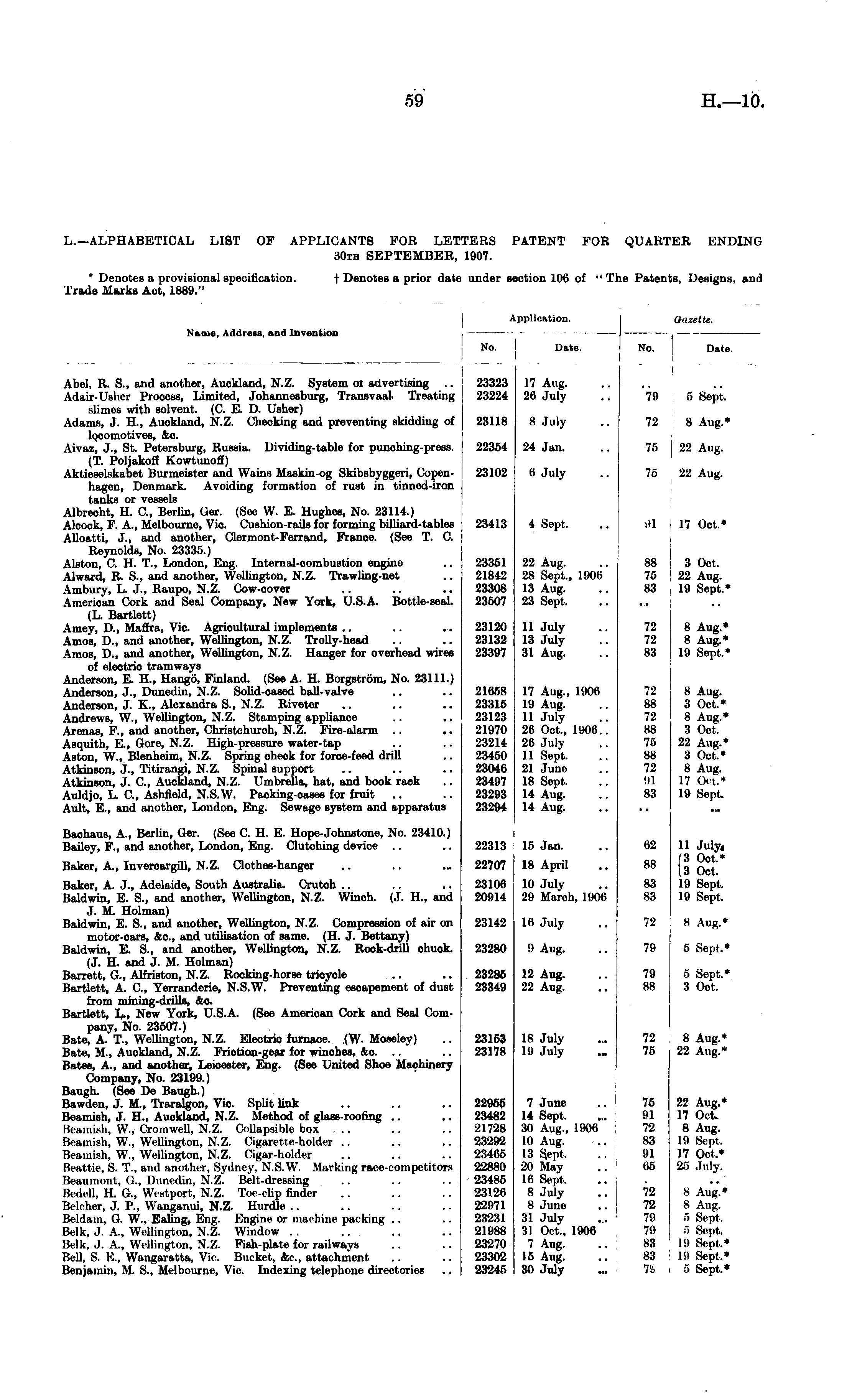 L.—ALPHABETICAL LIST OF APPLICANTS FOR LETTERS PATENT FOR QUARTER ENDING 30th SEPTEMBER, 1907.