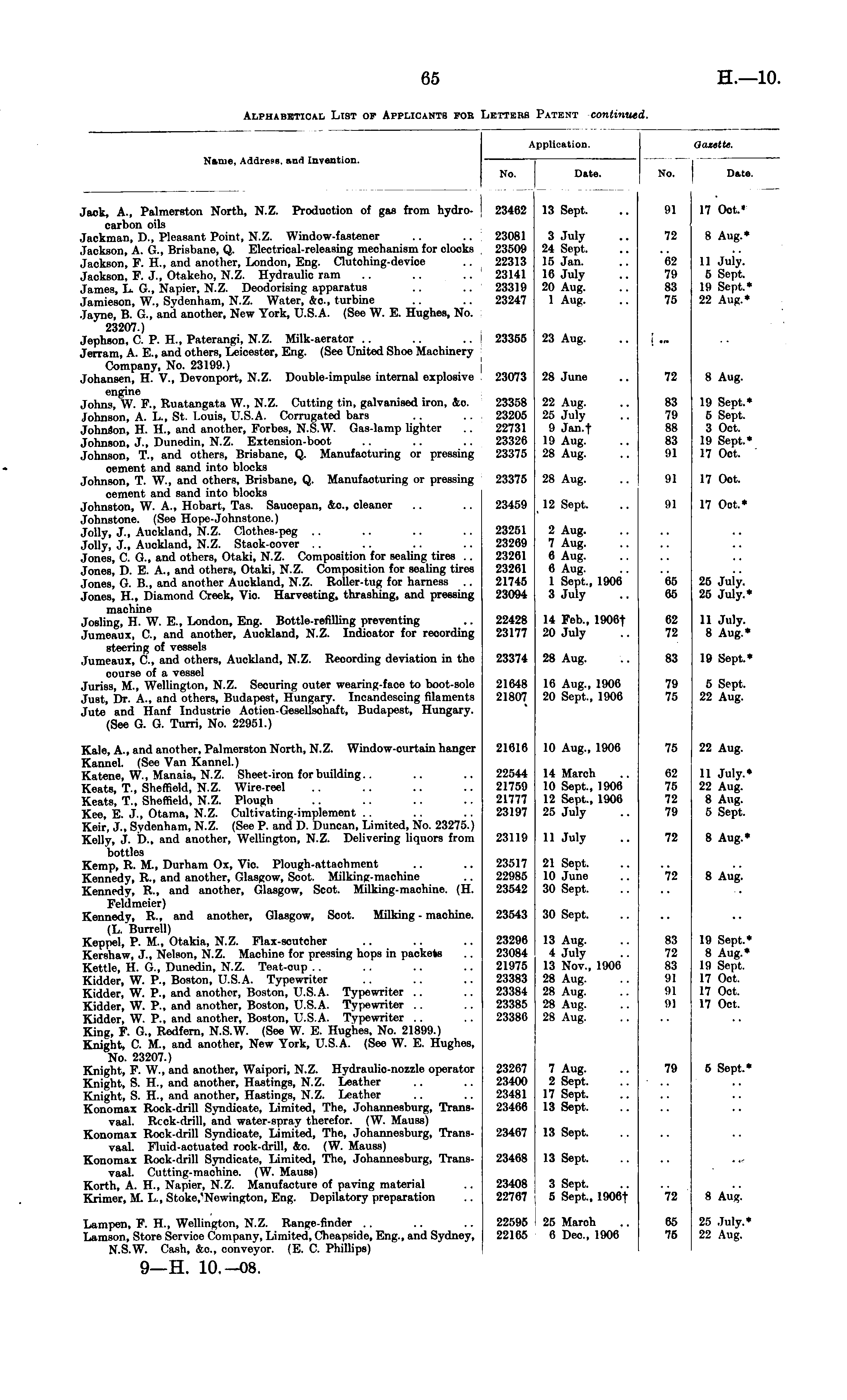 ■Pl'l Uoai lion. Name, Address, and Invention. Date. No. Date. No. Jack, A., Palmerston North, N.Z. Production of gas from hydro- 23462 carbon oils Jackman, D., Pleasant Point, N.Z. Window-fastener .. .. 23081 Jackson, A. G., Brisbane, Q. Electrical-releasing mechanism for clocks 23509 Jackson, F. H., and another, London, Eng. Clutohing-device . . 22313 Jackson, F. J., Otakeho, N.Z. Hydraulic ram .. .. .. 23141 James, L. G., Napier, N.Z. Deodorising apparatus .. .. 23319 Jamieson, W., Sydenham, N.Z. Water, &c, turbine .. .. 23247 Jayne, B. G., and another, New York, U.S.A. (See W. E. Hughes, No. 23207.) Jephson, C. P. H., Paterangi, N.Z. Milk-aerator .. .. .. 23355 Jerram, A. E., and others, Leicester, Eng. (See United Shoe Machinery Company, No. 23199.) Johansen, H. V., Devonport, N.Z. Double-impulse internal explosive 23073 engine Johns, W. F., Ruatangata W., N.Z. Cutting tin, galvanised iron, &c. 23358 Johnson, A. L., St. l.ouis, U.S.A. Corrugated bars .. .. 23205 Johnson, H. H., and another, Forbes, N.S.W. Gas-lamp lighter .. 22731 Johnson, J., Dunedin, N.Z. Extension-boot .. .. .. 23326 Johnson, T., and others, Brisbane, Q. Manufacturing or pressing 23375 cement and sand into blocks Johnson, T. W., and others, Brisbane, Q. Manufacturing or pressing 23375 cement and sand into blocks Johnston, W. A., Hobart, Tas. Sauoepan, &c, cleaner .. .. 23459 Johnstone. (See Hope-Johnstone.) Jolly, J., Auckland, N.Z. Clothes-peg .. .. .. .. 23251 Jolly, J., Auckland, N.Z. Stack-cover .. .. .. .. 23269 Jones, C. G., and others, Otaki, N.Z. Composition for sealing tires .. 23261 Jones, D. E. A., and others, Otaki, N.Z. Composition for sealing tires 23261 Jones, G. B., and another Auckland, N.Z. Roller-tug for harness .. 21745 Jones, H., Diamond Creek, Vic Harvesting, thrashing, and pressing 23094 machine Josling, H. W. E., London, Eng. Bottle-refilling preventing .. 22428 Jumeaux, C, and another, Auckland, N.Z. Indicator for recording 23177 steering of vessels Jumeaux, C, and others, Auckland, N.Z. Recording deviation in the 23374 course of a vessel Juries, M., Wellington, N.Z. Securing outer wearing-face to boot-sole 21648 Just, Dr. A., and others, Budapest, Hungary. Incandescing filaments 21807 Jute and Hanf Industrie Actien-Gesellsohaft, Budapest, Hungary. (See G. G. Turri, No. 22951.) 13 Sept. 91 17 Oot. , 3 July 24 Sept. 15 Jan. 16 July 20 Aug. 1 Aug. 72 8 Aug.* 62 79 83 75 11 July. 5 Sept. 19 Sept.* 22 Aug.* 23 Aug. 28 June 72 8 Aug. 22 Aug. 25 July 9 Jan.f 19 Aug. 28 Aug. 83 79 88 83 ill 19 Sept.* 5 Sept. 3 Oct. 19 Sept.* 17 Oct. 28 Aug. 111 17 Oot. 12 Sept. 91 17 Oot.* 2 Aug. 7 Aug. 6 Aug. 6 Aug. 1 Sept., 1906 3 July 65 65 25 July. 25 July.* 14 Feb., 1906f 20 July 62 72 11 July. 8 Aug.* 28 Aug. 83 19 Sept.* 16 Aug., 1906 20 Sept., 1906 79 75 5 Sept. 22 Aug. Kale, A., and another, Palmerston North, N.Z. Window-curtain hanger 21616 Kannel. (See Van Kannel.) Katene, W., Manaia, N.Z. Sheet-iron for building.. .. .. 22544 Keats, T., Sheffield, N.Z. Wire-reel .. .. .. .. 21759 Keats, T., Sheffield, N.Z. Plough .. .. .. .. 21777 Kee, E. J., Otama, N.Z. Cultivating-implement .. .. .. 23197 Keir, J., Sydenham, N.Z. (See P. and D. Duncan, Limited, No. 23275.) Kelly, J. D., and another, Wellington, N.Z. Delivering liquors from 23119 bottles Kemp, R. M., Durham Ox, Vic Plough-attachment .. .. 23517 Kennedy, R., and another, Glasgow, Scot. Milking-machine .. 22985 Kennedy, R., and another, Glasgow, Scot. Milking-machine. (H. 23542 Feldmeier) Kennedy, R., and another, Glasgow, Scot. Milking - machine. 23543 (L.Burrell) Keppel, P. M., Otakia, N.Z. Flax-scutcher .. .. .. 23296 Kershaw, J., Nelson, N.Z. Machine for pressing hops in packets .. 23084 Kettle, H. G., Dunedin, N.Z. Teat-cup .. .. .. .. 21975 Kidder, W. P., Boston, U.S.A. Typewriter .. .. .. 23383 Kidder, W. P., and another, Boston, U.S.A. Typewriter .. .. 23384 Kidder, W. P., and another, Boston, U.S.A. Typewriter .. .. 23385 Kidder, W. P., and another, Boston, U.S.A. Typewriter .. .. 23386 King, F. G., Redfern, N.S.W. (See W. E. Hughes, No. 21899.) Knight, C. M., and another, New York, U.S.A. (See W. E. Hughes, No. 23207.) Knight, F. W., and another, Waipori, N.Z. Hydraulio-nozzle operator 23267 Knight, S. H., and another, Hastings, N.Z. Leather .. .. 23400 Knight, S. H., nnd another, Hastings, N.Z. Leather .. .. 23481 Konomax Rock-drill Syndicate, Limited, The, Johannesburg, Trans- 23466 vaal. Reek-drill, and water-spray therefor. (W. Mauss) Konomax Rock-drill Syndicate, Limited, The, Johannesburg, Trans- 23467 il. Fluid-actuated rock-drill, &c. (W. Mauss) Konomax Rock-drill Syndicate, Limited, The, Johannesburg, Trans- 23468 vaal. Cutting-machine. (W. Mauss) Korth, A. H., Napier, N.Z. Manufacture of paving material .. 23408 Krimer, M. L., Stoke.'Newington, Eng. Depilatory preparation .. 22767 10 Aug., 1906 75 22 Aug. 14 March 10 Sept., 1906 12 Sept., 1906 25 July 62 75 72 79 11 July.* 22 Aug. 8 Aug. 5 Sept. 11 July 72 8 Aug.* 21 Sept. 10 June 30 Sept. 72 8 Aug. 30 Sept. 13 Aug. 4 July 13 Nov., 1906 28 Aug. 28 Aug. 28 Aug. 28 Aug. 83 72 83 91 1)1 0] 19 Sept.* 8 Aug.* 19 Sept. 17 Oct. 17 Oct. 17 Oct. 7 Aug. 2 Sept. 17 Sept. 13 Sept. 79 5 Sept.* 13 Sept. 13 Sept. 3 Sept. 5 Sept., 1906f 72 8 Au2. Lampen, F. H., Wellington, N.Z. Range-finder .. .. .. 22595 Lamson, Store Service Company, Limited, Cheapside, Eng., and Sydney, 22165 N.S.W. Cash, Ao., conveyor. (E. C. Phillips) 25 March 6 Dec, 1906 65 75 25 July.* 22 Aug.