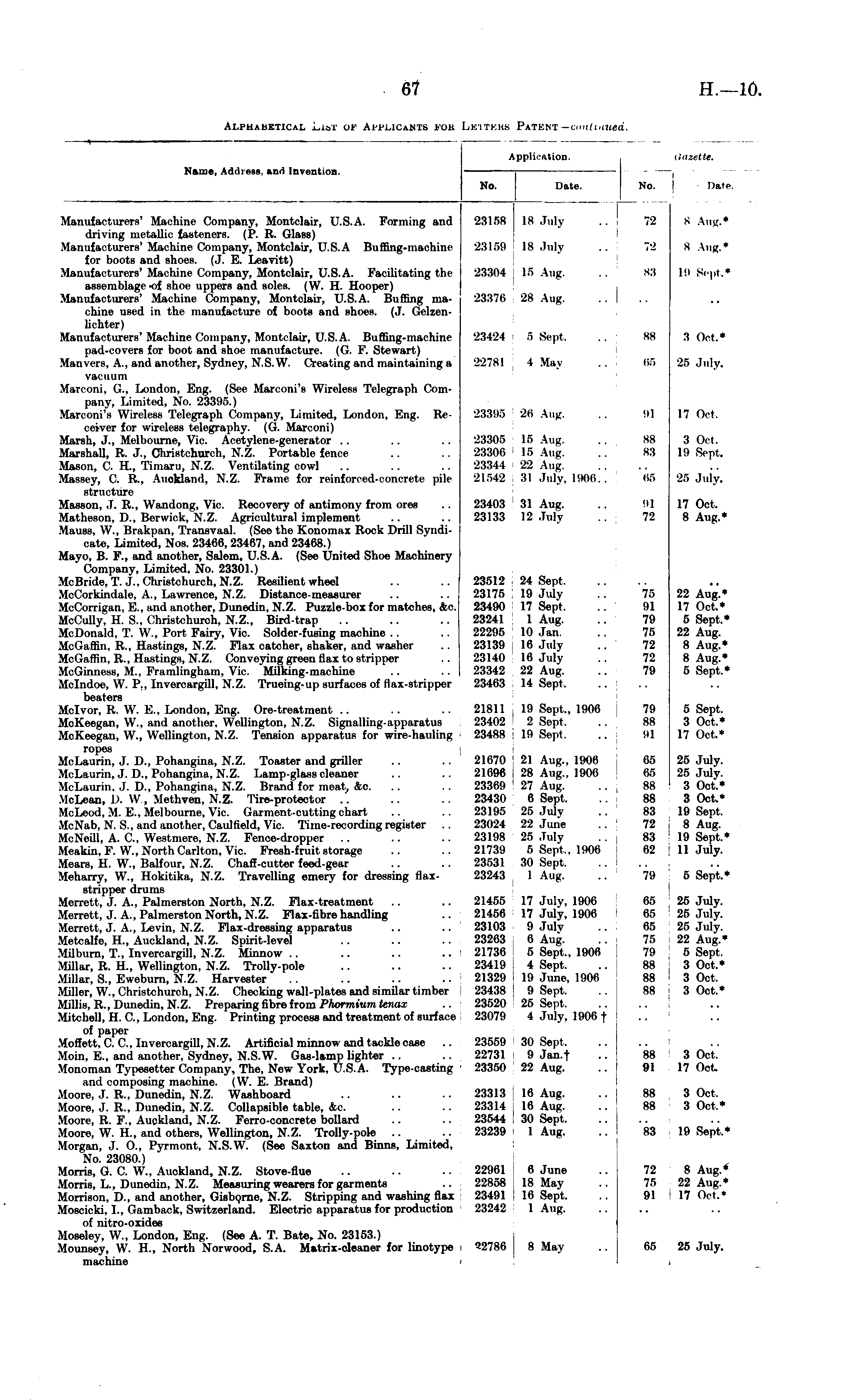 Application. >I>1>1 lical I oil ■ Ite. No. NmuA. AririrARR. and Invention. - Name, Address, and Invention. n&iue, Address, and invention. - No. I No. Date. Date. No. n»te Manufacturers' Machine Company, Montclair, U.S.A. Forming and 23158 18 July driving metallic fasteners. (P. R. Glass) Manufacturers' Machine Company, Montclair, U.S.A Buffing-machine "23150 18 July for boots and shoes. (J. E. Leavitt) Manufacturers'Machine Company, Montclair, U.S.A. Facilitating the 23304 l"> Aug. assemblage-of shoe uppers and soles. (W. H. Hooper) Manufacturers' Machine Company, Montclair, U.S.A. Buffing ma- 23370 28 Aug. chine used in the manufacture of boots and shoeR. (J. Gelzenlichter) Manufacturers'Machine Company, Montclair, U.S.A. Buffing-machine '234-24 5 Sept. pad-covers for boot and shoe manufacture. (G. F. Stewart) Minivers. A., and another, Sydney, N.S.W. Creating and maintaining a - 2'27HI 4 May vacuum Marconi, G., London, Eng. (See Marconi's Wireless Telegraph Company, [united, No. 23395.) Marconi's Wireless Telegraph Company, Limited, London, Eng. Re- 23398 2<> Aug. ceiver for wireless telegraphy. (G. Marconi) Marsh, J., Melbourne, Vic. Acetylene-generator .. .. .. 23305 10 Aim. Marshall, R. J., Christchurch, N.Z. Portable fence .. .. 23306 > 15 Aug. Mason, C. H., Timaru, N.Z. Ventilating cowl .. .. .. 28844 22 Aug. Massey, C. R., Auokland, N.Z. Frame for reinforced-concrete pile 21542 81 July, 1906., structure Masson, J. R., Wandong, Vic. Recovery of antimony from ores .. 23403 31 Aug. Matheson, D., Berwick, N.Z. Agricultural implement .. .. 23133 12 July Mauss, W., Brakpan, Transvaal. (See the Konomax Rock Drill Syndicate, Limited, Nos. 23466, 23467, and 23468.) Mayo, B. F., and another, Salem, U.S.A. (See United Shoe Machinery Company, Limited, No. 23301.) McBride, T. J.. Christchurch, N.Z. Resilient wheel .. .. 23512 24 Sept. MoCorkindale, A., Lawrence, N.Z. Distance-measurer .. 23175 19 July McCorrigan, E., and another, Dunedin, N.Z. Puzzle-box for matches, &c. 23490 17 Sej)t. McCully, H. S., Christchurch, N.Z., Bird-trap .. .. .. 23241 1 Aug. McDonald, T. W., Port Fairy, Vic. Solder-fusing machine .. .. 22295 10 Jan. McGaffin, R., Hastings, N.Z. Flax catcher, shaker, and washer .. 23139 16 July McGaffin, R., Hastings, N.Z. Conveying green flax to stripper .. 23140 16 July McGinness, M., Framlingham, Vic. Milking-machine .. .. 23342 22 Aug. Mclndoe, W. P., Invercargill, N.Z. Trueing-up surfaces of flax-stripper 23463 14 Sept. beaters Mclvor, R. W. E., London, Eng. Ore-treatment.. .. .. 21811 19 Sept., 1906 McKeegan, W., and another, Wellington, N.Z. Signalling-apparatus 23402 2 Sept. McKeegan, W., Wellington, N.Z. Tension apparatus for wire-hauling 23488 19 Sept. ropes McLaurin, J. D., Pohangina, N.Z. Toaster and griller .. .. 21670 21 Aug., 1906 McLaurin, J. D., Pohangina, N.Z. Lamp-glass cleaner .. .. 21696 28 Aug., 1906 McLaurin. J. D., Pohangina, N.Z. Brand for meat, &c. .. .. 23369 ; 27 Aug. McLean, I >. W, Methven, X.Z. Tire-protector .. .. .. 23430 6 Sept. McLeod, M. E., Melbourne, Vic. Garment-cutting chart .. .. 23195 25 July McNab, N. S., and another, Caulfield, Vic. Time-recording register .. 23024 22 June Me Will, A. C, Westmere, N.Z. Fence-dropper .. .. .. 23198 25 July Meakiii. F. W. North Carlton, Vic. Fresh-fruit storage .. .. 21739 5 Sept.. 1906 Mears, H. W., Balfour, N.Z. Chaff-cutter feed-gear .. .. 23531 30 Sept. Meharry, W., Hokitika, N.Z. Travelling emery for dressing flax- 23243 1 Aug. stripper drums Merrett, J. A., Palmerston North, N.Z. Flax-treatment .. .. 21455 17 July, 1906 Merrett, J. A., PalmerstonNorth, N.Z. Flax-fibre handling .. 21456 17 July, 1906 Merrett, J. A., Levin, N.Z. Flax-dressing apparatus .. .. 23103 9 July Metcalfe, H., Auckland, N.Z. Spirit-level .. .. .. 23263 6 Aug. Milburn, T., Invercargill, N.Z. Minnow .. .. .. .. ' 21736 ! 5 Sept., 1906 Millar, R. H., Wellington, N.Z. Trolly-pole .. .. .. 23419 i 4 Sept. Millar, S., Eweburn, N.Z. Harvester .. .. .. .. 21329 lfl June, 1906 Miller, W., Christchurch, N.Z. Checking wall-plates and similar timber 23438 9 Sept. Millis, R., Dunedin, N.Z. Preparing fibre from Phormium tenax .. 23520 25 Sβ]4. Mitchell, H. C, London, Eng. Printing process and treatment of surface 23079 4 July, 1906 f of paper Moffett, C. C, Invercargill, N.Z. Artificial minnow and tackle case .. 23559 30 Sept. Moin, E., and another, Sydney, N.S.W. Gas-lam]) lighter .. .. 22731 9 Jan.f Monoman Typesetter Company, The, New York, U.S.A. Type-casting 23350 22 Aug. and composing machine. (W. E. Brand) Moore, J. R.. Dunedin, N.Z. Washboard .. .. .. 23313 16 Aug. Moore, J. R., Dunedin, N.Z. Collapsible table, &c. .. .. 23314 16 Aug. Moore, R. F., Auckland, N.Z. Ferro-concrete bollard .. .. 23544 30 Sept. Moore, W. H., and others, Wellington, N.Z. Trolly-pole .. .. 23239 1 Aug. Morgan, J. O., Pyrmont, N.S.W. (See Saxton and Binns, Limited, No. 23080.) Morris, G. C. W., Auckland, N.Z. Stove-flue .. .. .. 22961 6 June Morris, L., Dunedin, N.Z. Measuring wearers for garments .. 22858 18 May Morrison, D., and another, GisbQrne, N.Z. Stripping and washing flax 23491 ! 16 Sept. Moscicki, L, Gamback, Switzerland. Electric apparatus for production 23242 1 Aug. of nitro-oxides Most-ley, W., London, Eng. (See A. T. Bate, No. 23153.) Mounsey, W. H., North Norwood, S.A. Matrix-cleaner for linotype 92786 8 May 72 8 Aug.* -:> 8 Aug.* 83 1(1 Sept.* 88 3 ()et.» o.~> 25 .Inly. '.il 17 Oct. 88 3 Oct. 88 19 Sept ii."> 25 July. !>] 17 Oct. 72 8 Aug.* 75 22 Aug.* 91 17 Oct.* 79 5 Sept.* 75 22 Aug. 72 8 Aug.* 72 8 Aug.* 79 5 Sept.* 79 5 Sept. 88 3 Oct.* !tl 17 Oct.* 65 25 July. 65 25 July. 88 3 Oct.* 88 3 Oct.* 83 19 Sept, 72 8 Aug. 83 19 Sept.* 62 11 July. 79 5 Sept.* 65 25 July. 65 ! 25 July. 65 25 July. 75 i 22 Aug.* 79 5 Sept. 88 I 3 Oct.* 88 3 Oct. 88 3 Oct.* 88 3 Oct. 91 17 Oct. 88 3 Oct. 88 3 Oct.* 83 19 Sept.* 72 8 Aug.* 75 22 Aug.* 91 17 Oct.* 65 25 July. machine '