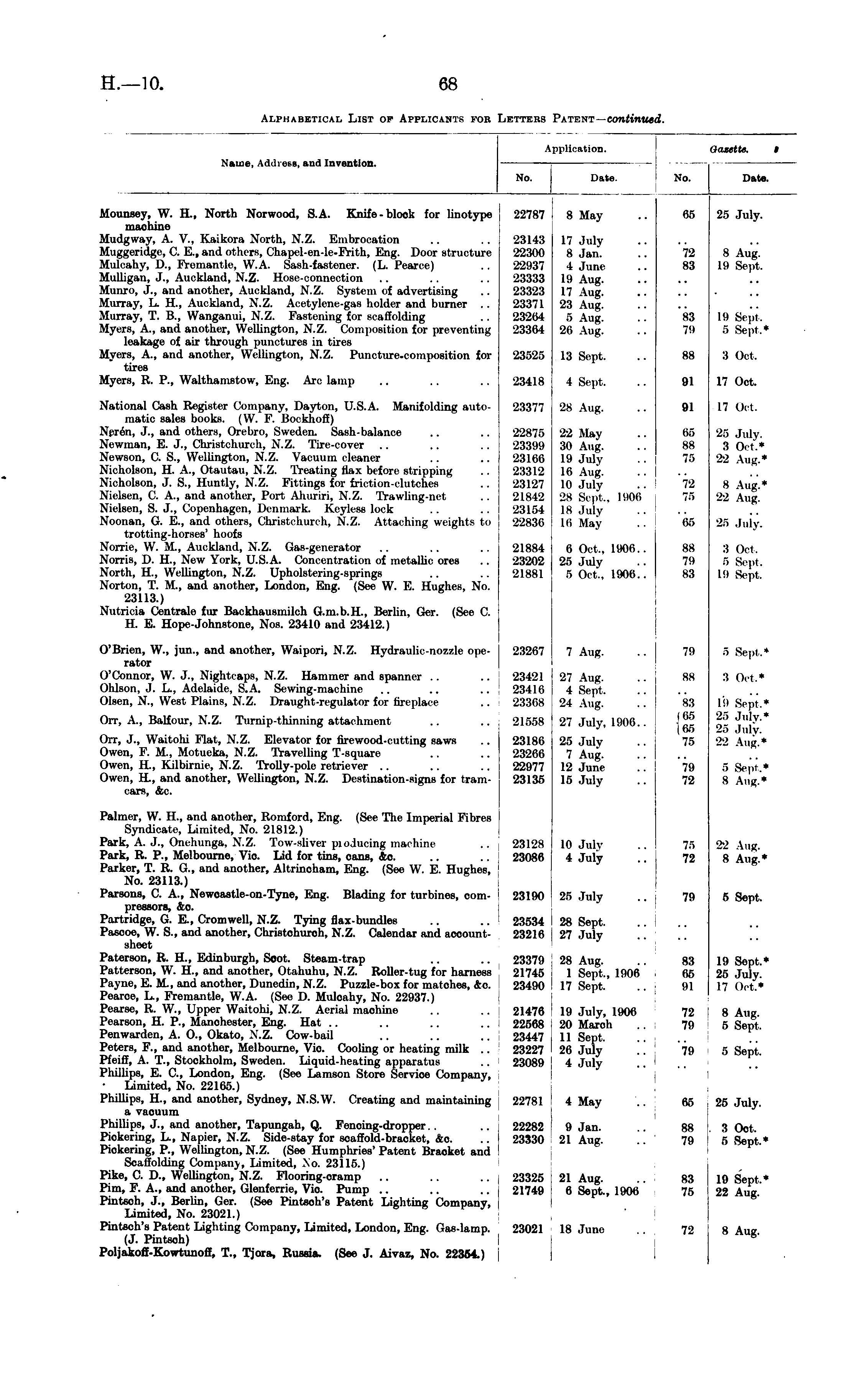 ipp] Leal ;ion. Name, Addrese, and Invention. No. Date. No. Date. Mounsey, W. H. t North Norwood, S.A. Knife - blook for linotype 22787 machine Mudgway, A. V., Kaikora North, N.Z. Embrocation .. .. 23143 Muggeridge, C. E., and others, Chapel-en-le-Frith, Eng. Door structure 22300 Mulcahy, D., Fremantle, W.A. Sash-fastener. (L. Pearce) .. 22937 Mulligan, J., Auckland, N.Z. Hose-connection .. .. .. 23333 Munro, J., and another, Auckland, N.Z. System of advertising .. 23323 Murray, L. H., Auckland, N.Z. Acetylene-gas holder and burner .. 23371 Murray, T. B., Wanganui, N.Z. Fastening for scaffolding .. 23264 Myers, A., and another, Wellington, N.Z. Composition for preventing 23364 leakage of air through punctures in tires Myers, A., and another, Wellington, N.Z. Puncture-composition for 23525 tires Myers, R. P., Walthamstow, Eng. Arc lamp .. .. .. 23418 22787 8 May 65 25 July. 23143 22300 22937 23333 23323 23371 23264 23364 17 July 8 Jan. 4 June lit Aug. 17 Aug. 23 Aug. 5 Aug. 26 Aug. 72 s:i 8 Aug. 19 Sept. 's:t 7'.i 19 Sept. 6 Sept.* 23525 13 Sept. ss 3 Oct. 23418 4 Sept, 91 17 Oct. National Cash Register Company, Dayton, U.S.A. Manifolding auto- 23377 matic sales books. (W. F. Bockhoff) Neren, J., and others, Orebro, Sweden. Sash-balance .. .. 22875 Newman, E. J., Christchurch, N.Z. Tire-cover .. .. .. 23399 Newson.C.S., Wellington, N.Z. Vacuum cleaner .. .. 23166 Nicholson, H. A., Otautau, N.Z. Treating rlax before stripping .. 23312 Nicholson, J. S., Huntly, N.Z. Fittings for friction-dutches .. 23127 Nielsen, C. A., and another, Port Ahuriri, N.Z. Trawling-net .. 21842 Nielsen, S. J., Copenhagen, Denmark. Keyless lock .. .. 23164 Noonan, G. E., and others, Christchurch, N.Z. Attaching weights to 22836 trotting-horses' hoofs Norrie, W. M., Auckland, N.Z. Gas-generator .. .. .. 21884 Norris, D. H., New York, U.S.A. Concentration of metallic ores .. 23202 North, H., Wellington, N.Z. Upholstering-springs .. .. 21881 Norton, T. M., and another, London, Eng. (See W. E. Hughes, No. 23113.) Nutricia Centralc fur Backhausmilch G.m.b.H., Berlin, Ger. (See C. H. E. Hope-Johnstone, Nos. 23410 and 23412.) 23377 28 Aug. 01 17 Oct. 22875 23399 23166 23312 ■23127 21842 23164 22836 22 May 30 Aug. l<1 July Iβ big. 10 July 28 Sept., L90fl IS July 10 May 66 88 7.-. 1-2 7--> •25 July. 3 Oct.* 22 Aug.* 8 Aug.* 22 Auk. C,.-, 'if) July. 21884 23202 21881 (i Oct.. 1906. . 25 July 5 Oct.. I not... SS 79 88 3 Oct. r> Sept. l<) Sept O'Brien, W., jun., and another, Waipori, N.Z. Hydraulic-nozzle ope- 23267 rator O'Connor, W. J., Nightcaps, N.Z. Hammer and spanner . . . . 23421 Ohlson, J. L., Adelaide, S.A. Sewing-machine .. .. .. 23416 Olsen, N., West Plains, N.Z. Draught-regulator for fireplace .. 23368 7 Aug. 5 Sc,,t.* 23267 7!) 23421 23416 23368 27 Aug. 4 Sept. 24 Aug. ss 3 Oct.* Orr, A., Balfour, N.Z. Turnip-thinning attachment .. .. 21558 21558 27 July. 1906.. 83 |65 , 66 75 1!) Sept.* ■2.~, July.* 26 July. 22 Aug.* Orr, J., Waitohi Flat, N.Z. Elevator for firewood-cutting saws .. 23186 Owen, F. M., Motueka, N.Z. Travelling T-square .. . . 23266 Owen, 11., Kilbirnio, N.Z. Trolly-pole retriever .. .. .. I 22977 Owen, H., and another, Wellington, N.Z. Destination-signs for tram- , 23135 cars, &c. 23186 23266 22977 23135 26 July 7 Aug. 12 June 15 July 79 72 5 Kc,',;.* S Aug.* Palmer, W. H., and another, Romford, Eng. (See The Imperial Fibres Syndicate, Limited, No. 21812.) Park, A. J., Onehungft, N.Z. Tow-sliver pioducing machine . . 23128 Park, R. P., Melbourne, Vic lid for tins, oans, &c. .. .. 23086 Parker, T. R. G., and another, Altrincham, Eng. (See W. E. Hughes, No. 23113.) Parsons, C. A., Newoastle-on-Tyne, Eng. Blading for turbines, com- 23190 pressors, &o. Partridge, G. E., Cromwell, N.Z. Tying flax-bundles .. .. 23534 Pascoe, W. S., and another, Christchuroh, N.Z. Calendar and account- 23216 sheet Paterson, R. H., Edinburgh, Soot. Steam-trap .. .. 23379 Patterson, W. H., and another, Otahuhu, N.Z. Roller-tug for harness 21745 Payne, E. M., and another, Dunedin, N.Z. Puzzle-box for matches, &c. 23490 Pearoe, L., Fremantle, W.A. (See D. Mulcahy, No. 22937.) Pearse, R. W., Upper Waitohi, N.Z. Aerial machine .. .. 21476 Pearson, H. P., Manchester, Eng. Hat .. .. .. . . 22568 Penwarden, A. 0., Okato, X.Z. Cow-bail .. .. .. 23447 Peters, F., and another, Melbourne, Vic Cooling or heating milk .. 23227 Pfeiff, A. T., Stockholm, Sweden. Liquid-heating apparatus .. 23089 Phillips, E. C, London, Eng. (See Lamson Store Servioe Company, • Limited, No. 22165.) Phillips, H., and another, Sydney, N.S.W. Creating and maintaining 22781 a vacuum Phillips, J., and another, Tapungah, Q. Fencing-dropper.. .. 22282 Pickering, L., Napier, N.Z. Side-stay for scaffold-bracket, &o. .. 23330 Piokering, P., Wellington, N.Z. (See Humphries' Patent Bracket and Scaffolding Company, Limited, .\o. 23115.) Pike, C. D., Wellington, N.Z. Flooring-cramp .. .. . . 23325 Pim, F. A., and another, Glenferrie, Vic Pump .. .. . . 21749 Pintsch, J., Berlin, Ger. (See Pintsoh's Patent Lighting Company, Limited, No. 23021.) Pintsch's Patent Lighting Company, Limited, London, Eng. Gas-lamp. 23021 (J. Pintsch) Poljakoff-Kowtunoff, T., Tjora, Russia. (See J. Aivaz, No. 22364.) 10 July 4 July 25 July 28 Sept. 27 July 28 Aug. 1 Sept., 1906 17 Sept. 19 July, 1906 20 March 11 Sept. 26 July 4 July 75 72 79 83 65 91 72 79 ■2-2 Auk. 8 Aug.* 5 Sept. 19 Sept.* 25 July. 17 Oct.* 8 Aug. 5 Sept. 79 5 Sept. 4 May 66 25 July. 9 Jan. 21 Aug. 88 79 . 3 Oct. 5 Sept.* 21 Aug. 6 Sept., 1906 83 75 19 Sept.* 22 Aug. 18 June 72 8 Aug.