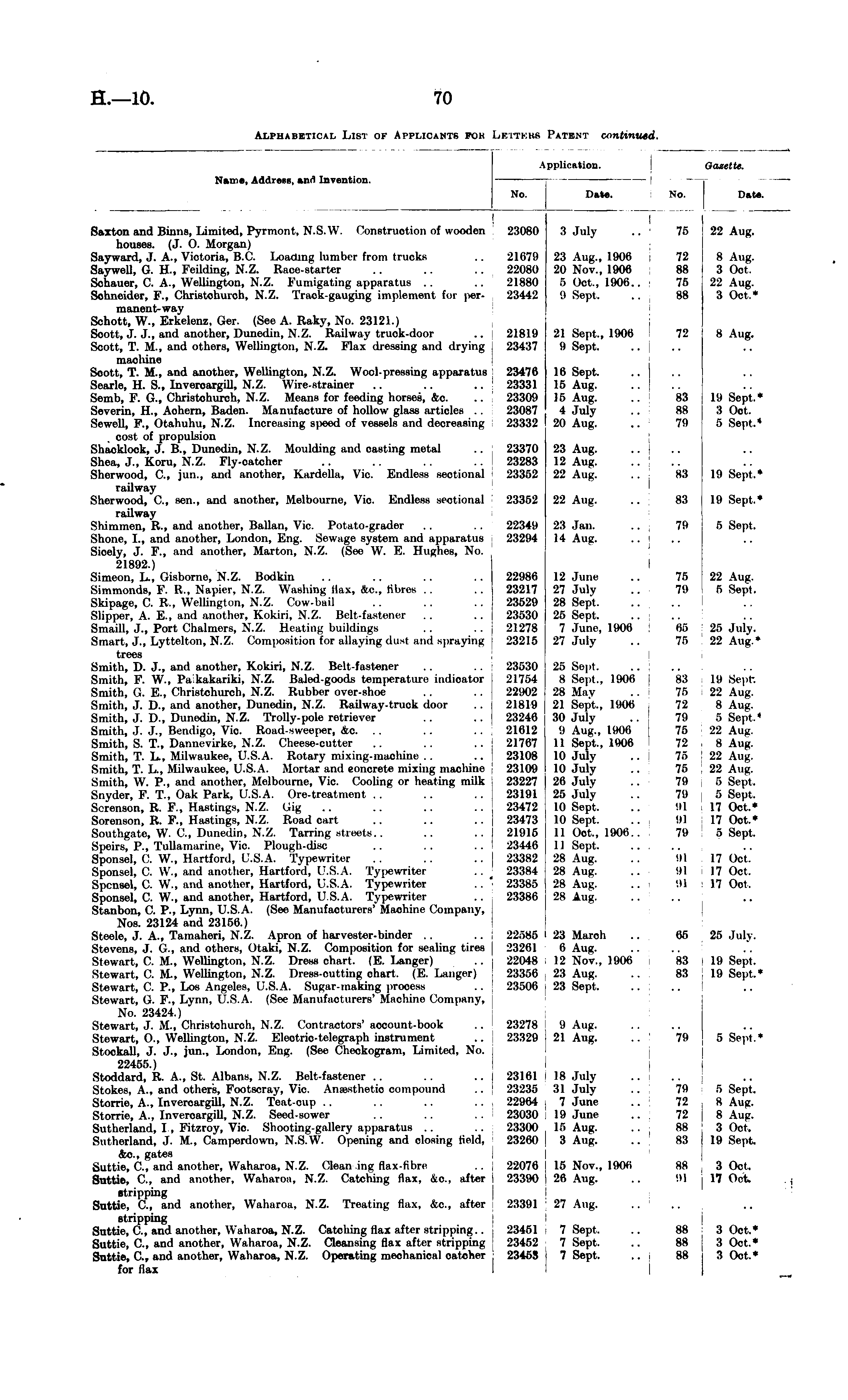 Name, Address, and Invention. No. No. Al Application. iplication. Date. QaxetU. No. Date. Date. I Saxton and Binns, Limited, Pyrmont, N.S.W. Construction of wooden 23080 houses. (J. 0. Morgan) Sayward, J. A., Victoria, B.C. Loading lumber from trucks .. 21679 Saywell, G. H., Feilding, N.Z. Race-starter .. .. .. 22080 Schauer, C. A., Wellington, N.Z. Fumigating apparatus .. .. 21880 Schneider, F., Christchurch, N.Z. Track-gauging implement for i>er- 23442 manent-way Schott, W., Erkelenz. Ger. (See A. Raky, No. 23121.) Soott, J. J., and another, Dunedin, N.Z. Railway truck-door .. 21819 Scott, T. M., and others, Wellington, N.Z. Flax dressing and drying i 23437 machine Soott, T. M., and another, Wellington, N.Z. Wool-pressing apparatus 23476 Searle, H. S., Inveroargill, N.Z. Wire-strainer .. .. .. 23331 Semb, F. G., Christohurch, N.Z. Means for feeding horses, &c. .. 23309 Severin, H., Aohern, Baden. Manufacture of hollow glass articles .. 23087 Sewell, F., Otahuhu, N.Z. Increasing speed of vessels and decreasing 23332 cost of propulsion Shacklock, J. B., Dunedin, N.Z. Moulding and casting metal .. 23370 Shea, J., Koru, N.Z. Fly-catcher .. .. .. . . 23283 Sherwood, C, jun., and another, Kardella, Vic. Endless seotional 23352 railway Sherwood, C, sen., and another, Melbourne, Vic Endless sectional 23352 railway Shimmen, R., and another, Ballan, Vic. Potato-grader .. .. 22349 Shone, I., and another, London, Eng. Sewage system and apparatus 23294 Sioely, J. F., and another, Marton, N.Z. (See W. E. Hughes, No. 21892.) Simeon, L., Gisborne, N.Z. Bodkin .. .. .. .. 22986 Simmonds, P. R., Napier, N.Z. Washing flax, &c, fibres .. .. 23217 Skipage, C. R., Wellington, N.Z. Cow-bail .. .. .. 23529 Slipper, A. E., and another, Kokiri, N.Z. Belt-fastener .. .. 23530 Smaill, J., Port Chalmers, N.Z. Heating buildings .. .. 21278 Smart, J., Lyttelton, N.Z. Composition for allaying dust and spraying 23215 trees Smith, D. J., and another, Kokiri, N.Z. Belt-fastener .. .. | 23530 Smith, F. \V\, Pa kiikariki. N'.Z. Baled-goods temperature iiulioator 21754 Smith, G. E., Christchurch, N.Z. Rubber over-shoe .. .. 22902 Smith, J. D., and another, Dunedin, N.Z. Railway-truck door .. j 21819 Smith, J. D., Dunedin, N.Z. Trolly-pole retriever .. .. 23246 Smith, J. J., Bendigo, Vic. Road-sweeper, Ac. .. .. .. 21612 Smith, S. T., Dannevirke, N.Z. Cheese-cutter .. .. .. 21767 Smith, T. L., Milwaukee, U.S.A. Rotary mixing-machine .. .. ! 23108 Smith, T. L., Milwaukee, U.S.A. Mortar and eoncrete mixing machine 23109 Smith, W. P., and another, Melbourne, Vic. Cooling or heatinc milk 23227 Snyder, F. T., Oak Park, U.S.A. Ore-treatment .. .. .. 23191 Screnson, R. F., Hastings, N.Z. Gig .. .. .. 23472 Sorenson, R. F., Hastings, N.Z. Road cart .. .. .. 23473 Southgate, W. C, Dunedin, N.Z. Tarring streets. . .. .. 21915 Spcirs, P., TuUamarine, Vic. Plough-disc .. .. .. 23446 Sponsel, C. W., Hartford, U.S.A. Typewriter .. .. .. 23382 Sponsel, C. \Y., and another. Hartford, U.S.A. Typewriter .. 23384 Spcnsel, C. W., and another, Hartford, U.S.A. Typewriter .. ' 23385 Sponsel, C. W., and another, Hartford, U.S.A. Typewriter .. 23386 Stanbon, C. P., Lynn, U.S.A. (See Manufacturers' Machine Company, Nos. 23124 and 23156.) Steele, J. A., Tamaheri, N.Z. Apron of harvester-binder .. .. 22588 Stevens, J. G., and others, Otaki, N.Z. Composition for sealing tires | 23261 Stewart, 0. M., Wellington, N.Z. DnH ehttrt (E. Langer) .. 22048 Stewart, C. M., Wellington, N.Z. Dress-cutting chart. (E. Langer) 23356 Stewart, C. P., Los Angeles, U.S.A. Sugar-making process .. 23506 Stewart, G. F., Lynn, U.S.A. (See Manufacturers' Machine Company, No. 23424.) Stewart, J. M., Christchurch, N.Z. Contractors' account-book . . 23278 Stewart, O., Wellington, N.Z. Electric-telegraph instrument .. 23329 Stockall, J. J., jun., London, Eng. (See Checkogram, Limited, No. 22455.) Stoddard, R. A., St. Albans, N.Z. Belt-fastener.. .. .. 23161 Stokes, A., and others, Footscray, Vic. Anaesthetic compound .. 23235 Storrie, A., Inveroargill, N.Z. Teat-cup .. .. .. .. 22964 Storrie, A., Inveroargill, N.Z. Seed-sower .. .. .. 23030 Sutherland, I , Fitzroy, Vic. Shooting-gallery apparatus .. .. 23300 Sutherland, J. M., Camperdown, N.S.W. Opening and closing Held, 23260 <fec, gates Suttie, C., and another, Waharoa, N.Z. Clean ing flax-fibre .. 22076 Suttie, C, and another. Waharoa, N.Z. Catching flax, &c, after I 23390 stripping Suttie, C, and another, Waharoa, N.Z. Treating flax, &c, after 23391 stripping Suttie, C, and another, Waharoa, N.Z. Catching Hax after stripping.. . 23451 Suttie, C, and another, Waharoa, N.Z. Cleansing flax after stripping 23452 Suttie, C, and another, Waharoa, N.Z. Operating mechanical oatcher 23458 3 July 75 22 Aug. 23 Aug., 1906 20 Nov., 1906 5 Oct., 1906.. '.i Sept. 72 8 Aug. 88 3 Oct. 75 22 Aug. 88 3 Oct.* 21 Sept., 1906 9 Sept. 72 8 Aug. 16 Sept. 15 Aug. 15 Aug. .. I 4 July 20 Aug. 83 19 Sept.* 88 3 Oct. 79 5 Sept.' 23 Aug. 12 Aug. 22 Aug. .. J 83 19 Sept.* 22 Aug. 88 lit Sept.* 23 Jan. 14 Aug. 79 S Sept. 12 June 27 July 28 Sept. 25 Sept. 7 June, 1906 27 July 75 22 Aug. 79 6 Sept. 86 25 July. 78 22 Aug.* 25 Sept. 8 Sept., 1906 28 May 21 Sept., 1906 30 July !i Aug., 1906 11 Sept., UKJ6 10 July 10 July 2(> July 25 July 10 Sept. 10 Sept. 11 Oct., 1906.. 11 Sept. 28 Aug. 28 Aug. 28 Aug. 28 Aug. 83 in Sept: 75 22 Aug. 72 8 Aug. 79 5 Sept. 11 75 -1-1 Aug. 72 8 Aug. 7."> 22 Aug. 75 ; 22 Aug. 78 5 Sept. 79 5 Sept 91 17 Oct.* Bl 17 Oct.* 79 5 Sept. 91 17 Oct. i<1 17 Oct. 91 17 Oot, ■S.I Mmroh 6 Aug. 12 Nov., 1906 88 Aug. 23 Sept 65 25 July. 83 L9 Sept 83 , 19 Sept.* 9 Aug. 21 Aug. 79 5 Sept.* 18 July 31 July 7 June 19 June 15 Aug. .. ■ 3 Aug. 79 5 Sept. 72 , 8 Aug. 72 J 8 Aug. 88 3 Oct. 83 19 Sept. 15 Nov., 1906 26 Aug. 88 3 Oct. 91 17 Oot 27 Aug. 7 Sept. 7 Sept. 7 Sept. 88 3 Oct.* 88 3 Oct.* 88 3 Oct.*