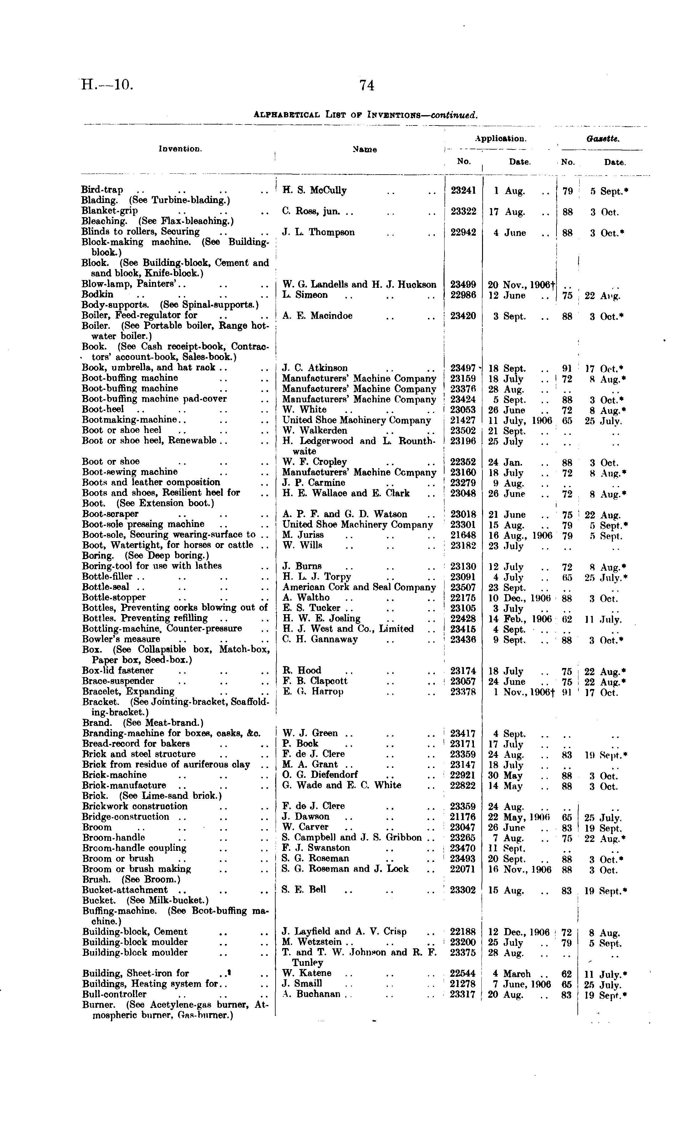 Application. Invention. Name No. Date. Date. No. Date Bird-trap .. .. .. .. ! H. S. MoCully .. .. 23241 Blading. (See Turbine-blading.) Blanket-grip .. .. .. C. Ross, jun. .. .. .. 23322 Bleaching. (See Flax-bleaching.) Blinds to rollers, Securing .. .. J. L. Thompson .. 22942 Block-making machine. (See Buildingblook.) Block. (See Building-block, Cement and sand block, Knife-block.) Blow-lamp, Painters'.. .. .. W. G. Landells and H. J. Huckson 23499 Bodkin .. .. .. .. L. Simeon .. .. .. 22986 Body-supportH. (See Spinal-supports.) Boiler, Feed-regulator for .. . . A. E. Macindoe .. .. 23420 Boiler. (See Portable boiler, Range hotwater boiler.) Book. (See Cash receipt-book, Contrac- • tors' acoount-book, Sales-book.) Book, umbrella, and hat rack .. .. i J. C. Atkinson .. .. 234117 Boot-buffing machine .. .. Manufacturers' Machine Company 23109 Boot-buffing machine .. .. Manufacturers' Machine Company 2387A Boot-buffing machine pad-cover .. Manufacturers' Machine Company 23421 Boot-heel .. .. .. .. W. White .. .. .. 23053 Bootmaking-machine.. .. .. United Shoe Machinery Company 21427 Boot or shoe heel .. .. .. W. Walkerden .. . . 23502 Boot or shoe heel, Renewable .. .. H. Ledgerwood and L. Rounth- 28196 waite Boot or shoe .. .. .. W. F. Cropley .. . . 22352 Boot-sewing machine .. .. Manufacturers' Machine Company 23160 Boots and leather composition .. | J. P. Carmine .. . . 232711 Boots and shoes, Resilient heel for .. H. E. Wallace ami K. Clark . . 28048 Boot. (See Extension boot.) Boot-soraper .. .. .. A. P. F. and G. D. Watson .. 23018 Boot-sole pressing machine .. .. United Shoe Machinery Company 23301 Boot-sole, Securing wearing-surface to .. ! M. Juries .. .. .. 211>48 Boot, Watertight, for horses or cattle .. I W. Wills .. .. .. 23182 Boring. (See Deep boring.) Boring-tool for use with lathes .. J.Burns .. .. .. 2313(1 Bottle.fUler .. .. .. .. H. T,. J. Torpy .. .. 23091 Bottle-seal .. .. .. .. American Cork and Seal Company 23507 Bottle-stopper .. .. .. A. Waltho .. .. .. I 22175 Bottles, Preventing oorks blowing out of E. S. Tucker .. .. . . 23105 Bottles. Preventing refilling .. .. H. W. K. Josling .. .. 22428 Bottling-machine, Counter-pressure .. H. J. West and Co., Limited .. 23415 Bowler's measure .. .. ..CM. Gannaway .. .. 23436 Box. (See Collapsible box, Match-box, Paper box, Seed-box.) Box-lid fastener .. .. .. R. Hood .. .. .. 23174 Brace-susponder .. .. .. F. B. Clapcott .. .. 23057 Bracelet, Expanding .. .. K. < i. Harrop .. .. 23:(7S Bracket. (See Jointing-bracket, Scaffold-ing-bracket. ) Brand. (See Meat-brand.) Branding-machine for boxes, casks, &o. j W. J. Green .. .. .. 23417 Bread-record for bakers .. ..P. Bock .. .. .. 23171 Brick and steel structure .. .. i F. de J. Clere .. .. 23359 Brick from residue of auriferous clay . . M. A. Grant .. .. .. 23147 Brick-machine .. .. .. O. (J. Diefendorf .. .. 22921 Brick-manufacture .. .. .. G. Wade and E. C. White .. 22822 Brick. (See Lime-sand briok.) Brickwork construction .. .. F. de J. Clere .. .. 23359 Bridge-construction .. .. .. J. Dawson .. .. .. 21176 Broom .. .. .. .. W. Carver .. .. .. 23047 Broom-handle .. .. . . S. Campbell and J. S. Gribhon .. 23266 Brcom-handle coupling .. .. F. J. Swanston .. .. 2:t47n Broom or brush .. .. .. S. G. Roseman .. .. 23493 Broom or brush making .. .. S. G. Roseman and J. Lock .. 22(171 Brush. (See Broom.) Bucket-attachment .. .. .. S. E. Bell .. .. .. 23302 Bucket. (See Milk-bucket.) Buffing-machine. (See Bcot-buffing machine.) Building-block, Cement .. J. Layfield and A. V. Crisp .. 22188 Building-block moulder .. .. M. Wetzstein .. .. .. 232(Ki Building-blook moulder .. .. T. and T. W. Johnson and R. F. 23870 Tunley Building, Sheet-iron for . .< .. W. Katene .. .. . . 22544 Buildings, Heating system for.. .. J. Smaill .. .. . . 21278 Bull-controller .. .. ..A. Buchanan. .. . 23317 Burner. (See Acetylene-gas burner, Atmospheric burner, Gas-burner.) 23241 23322 22942 23499 22980 23420 1 Aug. ..79 5 Sept.* 17 Aug. ..88 3 Oct. 4 June ..88 3 Oct.* 20 Nov., 1906t .. 12 June . . 7.". 22 Ai'g. 3 Sept. .. 88 3 Oct.* 18 Sept. .. 01 17 Oct.* IS .Inly .. 72 8 Aug.* 28 Aug 5 Sept. .. 88 .", Oct.* 26 June ..72 8 Aug.* II July, 1906 66 25 July. 21 Sep"t 25 July .... 24 Jan. .. 88 3 Oct. 18 July ..72 8 Aug.* 9 Aug 26 June ..72 S Aug.* 21 June .. 75 22 Aug. 15 Aug. .. 79 5 Sept.* 16 Aug.. 1906 79 B Sept. 23 July .... 12 July ..72 8 Aug.* 4 July .. 60 20 .Inly.* 23 Sept 10 Dec., 1906 H8 3 Oct. 3 .Inly .... 14 !•>!>.. 1906 Ii2 11 July. 4 Sept. .... 9 Sept . . 88 3 Oct.* IS July .. 76 22 Aug.* 24 June .. 75 22 Aug.* 1 No\.. I'.MMit 111 17 Oct. 4 Sept 17 July .... 24 Vug. .. 88 19 Sept.* 18 July .... 30 May .. 88 8 Oct. 14 May ..88 3 Oct. 24 Aug 22 May, 1906 60 26 July. 26 Juno . . 83 19 Sept. 7 Aug. .. 70 22 Aug.* 11 Sept, 20 Sept. .. 88 3 Oct.* Iβ N'ov., 1906 88 8 on. 15 Aug. .. 83 111 Sept.* 12 Dec, 1906 72 8 Aug. 25 July ..79 f> Sept 28 Aug 4 March .. 62 11 July* 7 June, 1906 65 25 July. 20 Aug. .. 83 19 Sept.*