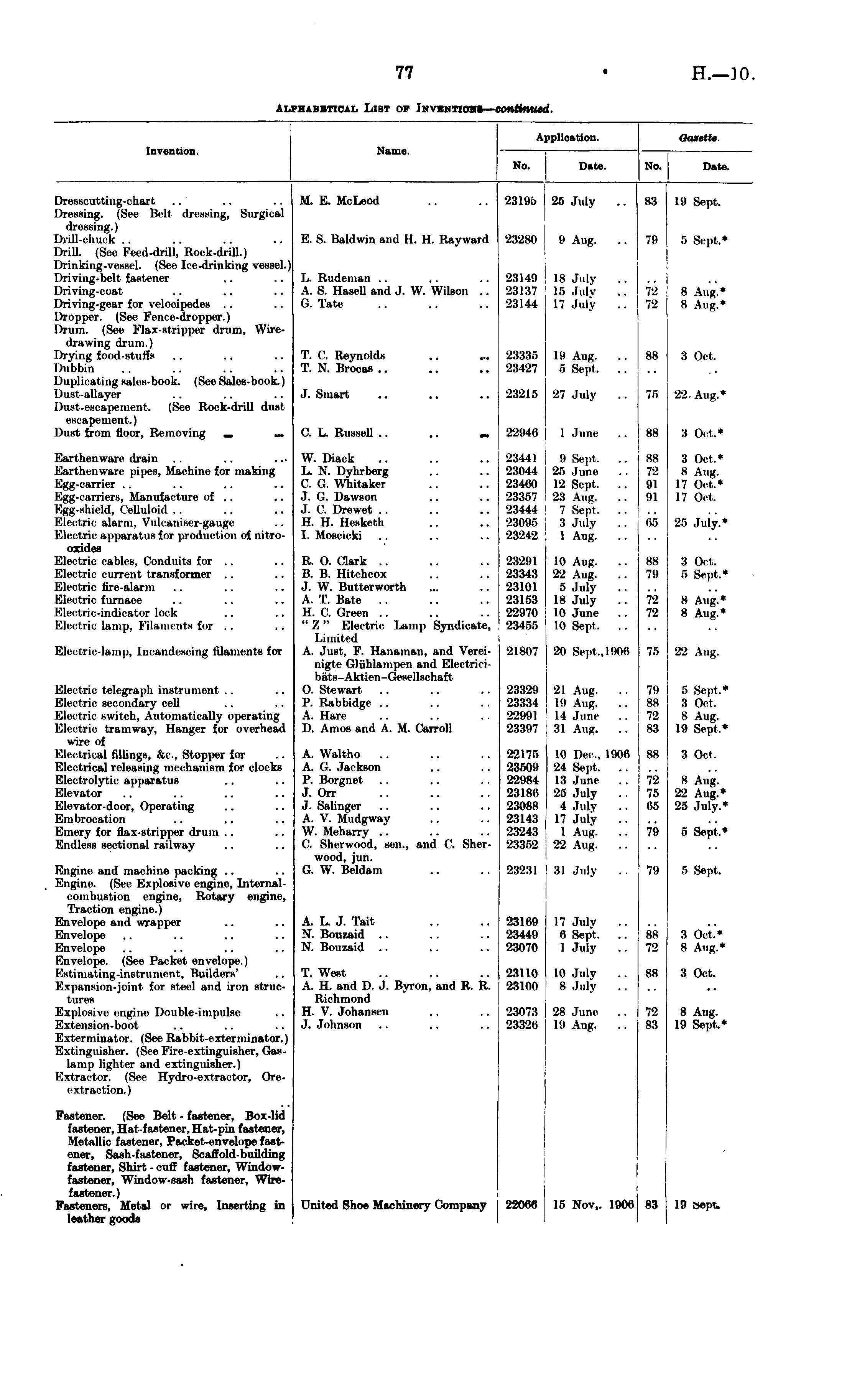 a>l>] ical ion. Invention. Name. No. Date. No. Date. Dresscutting-ehart Dressing. (See Belt dressing, Surgical dressing.) Drill-chuck Drill. (See Feed-drill, Rook-drffl.) Drinking-vesxel. (Sec [oe-drinking vessel.) I )ri v i ng- belt fastener Driving-coat Driving-gear for velocipedes Dropper. (See Kence-dropper.) Drum. (See Flax-stripper drum, Wiredrawing drum.) Drying food-stuffs Dubbin Duplicating sales-book. (See Sales-book.) Dust-allayer Dust-escapement. (See Rock-drill dust eeoapement.) Dust from floor, Removing _ .- M. E. McLeod 23195 25 July B3 111 Sept. E. S. Baldwin and H. H. Rayward 28280 9 Aug. .. 79 .-. Sept.* l>. Rudeman A. S. Ha.soll and J. W. Wilson .. 0. Tate 28149 28187 23144 IS July 18 July 17 July 7-' 72 8 Aug.* 8 Aug.* T. ('. Reynolds T. X. Brocas .. •i:mr, 28427 1« Aug. .. "> Sept. ss 8 Oct. J. Stuart 23215 27 July .. 78 aa Aug.* C. L. Russell .. .. . 22946 1 June ss 8 Oct.* Karthenware drain Earthenware pipes, Machine for making Egg-oarrier .. Egg-oarriere, Manufacture of .. Egg-shield, Celluloid .. Baectrio alarm, Vuloanuer-gauge Electric apparatus for production of nitrooxides Electric cables. Conduits for Klcclric current Iransformer .. Electric tire-alarm Electric furnace Electric-indicator lock Electric lamp, Filaments for W. Diack L X. Dyhrberg C. G. Whitaker J. G. Dawson J. C. Drewet H. H. Hesketh I. Moscicki 23441 23044 23460 23357 23444 23095 23242 9 Sept. .. 25 June 12 Sept. 23 Aug. 7 Sept. . . :i July .. 1 Aug. .. ss 72 III 91 3 Oct.* 8 Aug. 17 (Id.* 17 Ocl. ii.-> •-'.-> .luiy.* R. O. Clark .. B. B. Hitohcox J. W. Bntterworth A. T. Bate H. C. Green .. "Z" Electric Lamp Syndicate, Limited A. Just, F. Hanaman, and Vereinigte Glfihlampen and Electrici-Iiiits-Aktien-Gesellschaft 0. Stewart P. Rabbidgc A. Hare I). Amos and A. M. Carroll 23291 23343 28161 23153 22970 28468 l(> Aug. 22 Aug. .. 5 July IS July 10 June 10 Sept. .. ss 79 :( Oct. r> Sept.* 72 72 s Aug.* 8 Aug.* Electric-lamp, Incandescing filaments for 21807 20 Scpt.,1906 7.-. 22 Aug. Electric telegraph instrument Electric secondary cell Klci trie switch, Automatically operating Klectric tramway, Hanger for overhead wire of Klectrical fillings, &c, Stopper for Electrical releasing mechanism for clocks Electrolytic apparatus Elevator Elevator-door, Operating Km brocation Kmery for Bax-etripper drum .. Endless sectional railway 23329 23334 22! MM 23397 21 Aug. .. 1(1 Aug. 14 June 31 Aug. .. 79 ss 72 s:i 5 Sept.* :> Oct. 8 Aug. 19 Sept.* A. Waltho A. G. Jackson P. Borgnet J. Orr J. Salinger A. V. Mudgway W. Meharry C. Sherwood, sen., and C Sherwood, fun. G. W. Beldam 22175 23509 22984 23186 23088 23143 23243 23352 iii lie-.. v.m\ 21 Sept. . . 13 June 25 July 4 July 17 July .. 1 Aug. 22 Aug. ss 72 75 68 79 3 Oct. 8 Aug. 22 Aug.* 25 July.* 5 Sept.* Engine and machine packing Engine. (See Kxplosive engine, Internalcombustion engine, Rotary engine, Traction engine.) Envelope and wrapper Envelope Envelope Envelope. (See Packet envelope.) Bstimating-initniment, Builders' Expansion-joint for steel and iron structures Explosive engine Double-impulse Extension-boot Exterminator. (See Rabbit-exterminator.) Extinguisher. (See Fire-extinguisher, Gaslamp lighter and extinguisher.) Extractor. (See Hydro-extractor, Oreextraction.) A. L. J. Tait N. Bouzaid N. Bouzaid T. West A. H. and I). J. Byron, and R. R. Richmond H. V. Johanscn J. Johnson 23231 23169 23449 23070 23110 23100 31 July 17 July « Sept. .. 1 July .. 10 July 8 July 79 ss 72 ss 8 Sept. 3 Oct.'* 8 Aug.* 3 Oct. 23073 23326 28 June l<.) Aug. .. 72 83 8 Aug. 19 Sept.* Fastener. (See Belt - fastener, Box-lid fastener, Hat-fastener, Hat-pin faetener, Metallic fastener. Packet-envelope fastener, Sash-fastener, Scaffold-building fastener, Shirt - cuff fastener, Windowfastener, Window-sash fastener, Wirefastener. ) Fasteners, Metal or wire, Inserting in leather Roods United Shoe Machinery Company 15 Nov.. 1906 M 19 sepu