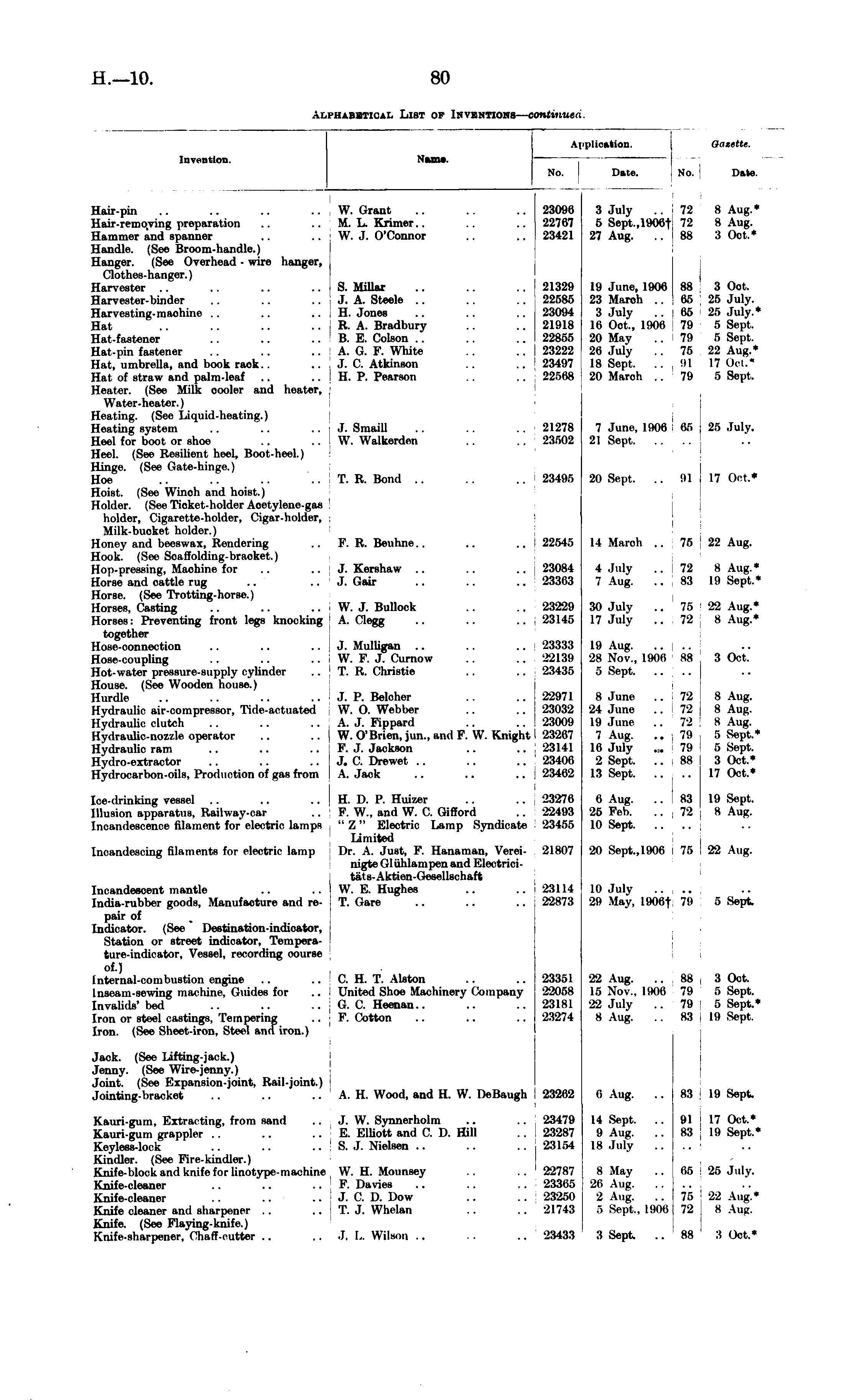 Invention. Nun*. No. At Application. No. J OOMtt*. Date. Date. Hair-pin .. .. .. .. W. Grant .. .. .. 23096 Hair-remo.ving preparation .. .. M. L. Krimer.. .. .. 22767 Hammer and spanner .. . . W. J. O'Connor .. .. 23421 Handle. (See Broom-handle.) Hanger. (See Overhead - wire hanger, Clothes-hanger.) Harvester .. .. .. .. S. Millar .. .. .. 21329 Harvester-binder .. .. .. j J. A. Steele .. .. .. 22585 Harvesting-maohine .. .. .. i H. Jones .. .. .. 23094 Hat .. .. .. .. R. A. Bradbury .. .. 21918 Hat-fastener .. .. .. ' B. E. Colson .. .. .. 22855 Hat-pin fastener .. .. .. A. G. F. White .. .. I 23222 Hat, umbrella, and book rack.. . . J. C. Atkinson .. .. 23497 Hat of straw and palm-leaf .. .. I H. P. Pearson .. .. 22. r >68 Heater. (See Milk oooler and heater, Water-heater.) Heating. (See Liquid-heating.) Heating system .. .. .. J. Smaill .. .. .. 21278 Heel for boot or shoe .. .. W. Walkerden .. . . 23502 Heel. (See Resilient heel, Boot-heel.) Hinge. (See Gate-hinge.) Hoe .. .. .. .. I T. R. Bond .. .. .. 23495 Hoist. (See Winch and hoist.) Holder. (See Tioket- holder Aoetylene-gas holder, Cigarette-holder, Cigar-holder, Milk-buoket holder.) Honey and beeswax, Rendering .. F. R. Beuhne.. .. .. 22545 Hook. (See Soaffolding-brnoket.) Hop-pressing, Maohine for .. J. Kershaw .. .. .. j 23084 Horse and oattle rug .. .. J. Gair .. .. .. 23303 Horse. (See Trotting-horse.) Horses, Casting .. .. .. W. J. Bullock .. .. 23229 Horses: Preventing front legs knocking A. Clegg .. .. .. 2814S together Hose-connection .. .. .. I J. Mulligan .. .. .. | 23333 Hose-coupling .. .. ,. | W.P.J, Curnow .. .. 22139 Hot-water pressure-supply cylinder .. T. R. Christie .. .. 23435 House. (See Wooden house.) Hurdle .. .. .. .. I J. P. Beloher .. .. 22971 Hydraulic air-compressor, Tide-actuated W.O.Webber .. .. 23032 Hydraulic clutch .. .. .. A. J. Fippard .. .. 23009 Hydraulic-nozzle operator .. .. W. O'Brien, jun., and F. W. Knight 23267 Hydraulic ram .. .. .. F.J.Jackson .. .. '23141 Hydro-extractor .. .. .. J. C. Drewet .. .. .. 23406 Hydrocarbon-oils, Production of gas from A. Jack .. .. ,. 23462 3 July .. 72 8 Aug.* 5 Sept.,1906f 72 8 Aug. 27 Aug. .. 88 3 Oct.* 19 June, 1906 88 3 Oot. 23 March .. 65 25 July. 3 July .. 86 25 July.* 16 Oot., 1906 79 5 Sept. 20 May .. 79 5 Sept. 26 July .. 75 22 Aug.* 18 Sept. .. 91 17 Oot.* 1 20 Maroh .. 79 5 Sept. 7 June. 1906 66 25 July. 21 Sept 20 Sept. .. 91 17 Oot* 14 Maroh .. 75 22 Aug. 4 July .. 72 8 Aug.* 7 Aug. .. 83 19 Sept.* 30 July .. 75 22 Aug.* 17 July .. 72 8 Aug.* 19 Aug 28 Nov., 1906 SH B Oct. 5 Sept 8 June .. 72 8 Aug. 24 June .. 72 8 Aug. 19 June .. 72 8 Aug. 7 Aug. .. 79 . 5 Sept.* Lβ July ... 79 5 Sept. 2 Sept. .. , 88 3 Oct.* 13 Sept 17 Oct.* Ice-drinking vessel .. .. .. H. D. P. Huizer .. .. 23276 Illusion apparatus, Railway-car .. F. W., and W. C. Gifford .. 22493 Incandescence filament for electric lamps " Z " Electric Lamp Syndicate 23455 Limited Incandescing filaments for electric lamp Dr. A. Just, F. Hanaman, Verei- 21807 nigte Gluhlampen and Electrici-tats-Aktien-Gesellschaft Incandescent mantle .. .. W.E.Hughes .. .. 23114 India-rubber goods, Manufacture and re- T. Gare .. .. ., 22873 pair of Indicator. (See Destination-indicator, Station or street indicator, Tempera-ture-indicator, Vessel, recording course of.) Internal-combustion engine .. .. C. H. T. Alston .. .. 23351 Insrain-sewing machine, Guides for .. United Shoe Machinery Company 22058 Invalids' bed .. .. .. G. C. Heenan.. .. ..23181 Iron or steel castings, Tempering .. F. Cotton .. .. .. I 23274 Iron. (See Sheet-iron, Steel and iron.) 6 Aug. .. I 88 19 Sept. 25 Feb. .. 72 8 Aug. 10 Sept 20 Sept.,1906 75 22 Aug. 10 July .. .. 2!l May, 190t>t 79 5 Sept. 23351 22058 23181 23274 22 Aug. ..88 3 Oct. 15 Nov., 1906 79 r> Sept. 22 July .. 79 5 Sept.* 8 Aug. .. SI 19 Sept. Jack. (See Lifting-jack.) Jenny. (See Wire-jenny.) Joint. (See Expansion-joint, Rail-joint.) Jointing-bracket .. .. .. A. H. Wood, and H. W. DeBaugh 23262 23262 6 Aug. .. 83 19 Sept. Kauri-gum, Extracting, from sand .. J. W. Synnerholm .. .. 23479 Kauri-gum grappler .. .. .. E. Elliott and C. D. Hill .. 23287 Keyless-lock .. .. .. j S. J. Nielsen .. .. .. 28164 Kindler. (See Fire-kindler.) Knife-block and knife for linotype-machine W. H. Mounsey .. .. 22787 Knife-cleaner .. .. .. F. Davies .. .. . . 23365 Knife-cleaner .. .. .. J. C. D. Dow .. . . 23250 Knife cleaner and sharpener .. .. I T. J. Whelan .. .. 21743 Knife. (See Flaying-knife.) Knife-sharpener. Chaff-nutter .. .'. J, L Wilson .. . . .. 23433 23479 23287 231 ">4 14 Sept. .. 91 17 Oct.* 9 Aug. .. 83 19 Sept.* 18 July .. .. I 22787 23365 23260 21743 8 May .. 65 -if. July, 26 Aug 2 Aug. .. 75 22 Aug.* 5 Sept.. 1906 72 8 Aug. 3 Sept. .. 88 3 Oct.* 23433