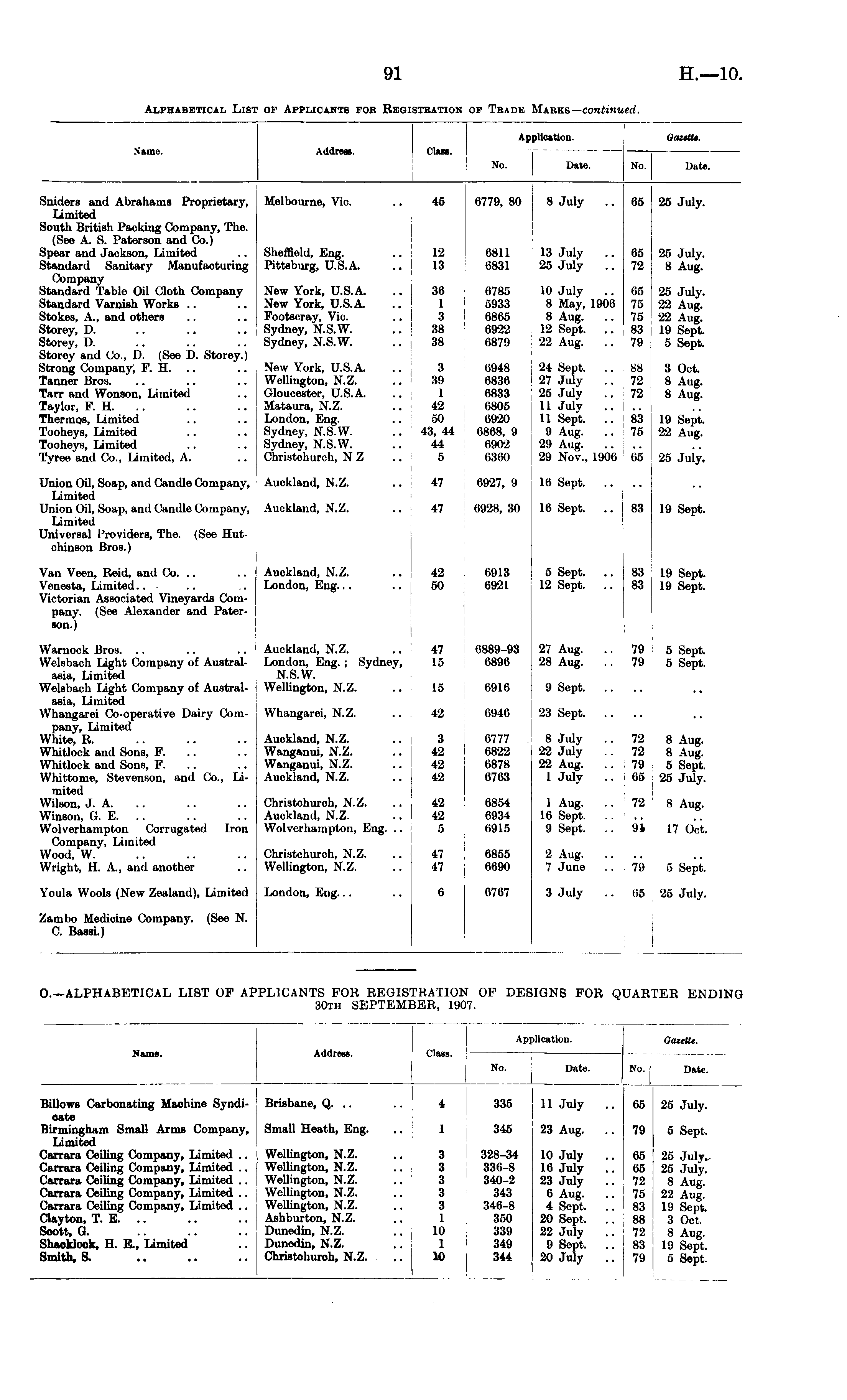 O.—ALPHABETICAL LIST OF APPLICANTS FOR REGISTRATION OF DESIGNS FOR QUARTER ENDING 30th SEPTEMBER, 1907.
