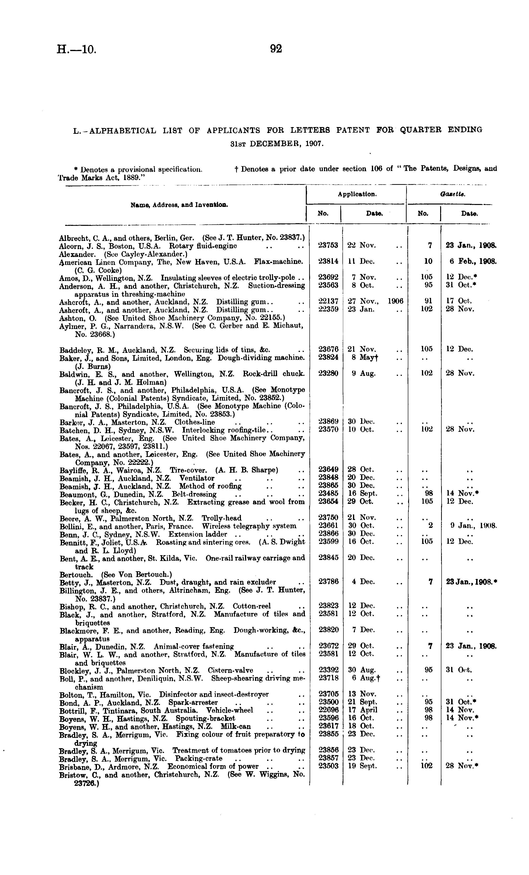 L.-ALPHABETICAL LIST OF APPLICANTS FOR LETTERS PATENT FOR QUARTER ENDING 31st DECEMBER, 1907.