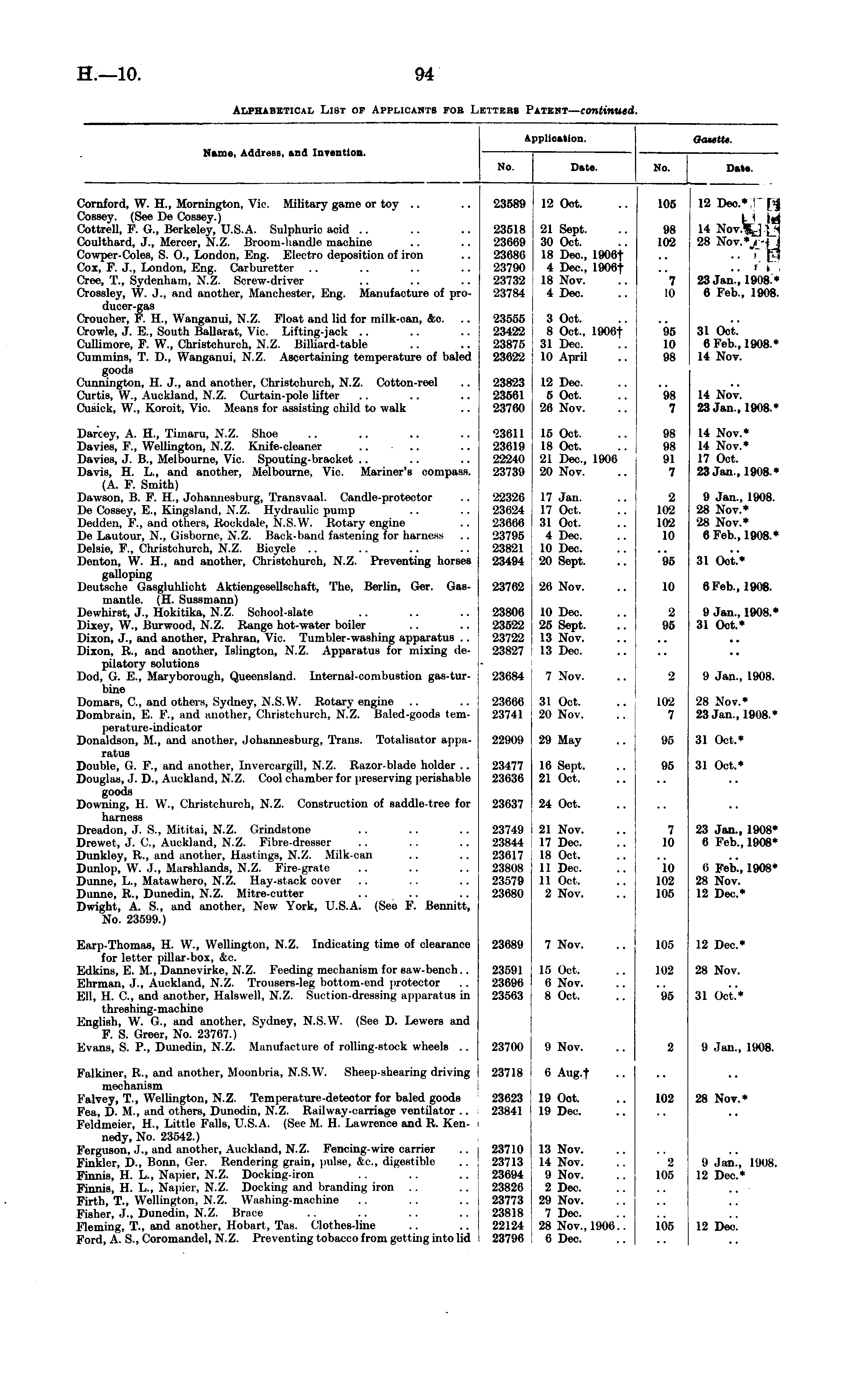 •l'l'l ical ion. ■Xte. Name, Address, and Invention. No Date. No. Date. Cornford, W. H., Mornington, Vic. Military game or toy Cossey. (See De Cossey.) Cottrell, F. G., Berkeley, U.S.A. Sulphuric acid Coulthard, J., Mercer, N.Z. Broom-handle machine Cowper-Coles, S. 0., London, Eng. Electro deposition of iron Cox, F. J., London, Eng. Carburetter Cree, T., Sydenham, N.Z. Screw-driver Crossley, W. J., and another, Manchester, Eng. Manufacture of pro-ducer-gas Croucher, F. H., Wanganui, N.Z. Float and lid for milk-can, &o. Crowle, J. E., South Ballarat, Vic. Lifting-jack Cullimore, F. W., Christchurch, N.Z. Billiard-table Cummins, T. D., Wanganui, N.Z. Ascertaining temperature of baled goods Cunnington, H. J., and another, Christchurch, N.Z. Cotton-reel Curtis, W., Auckland, N.Z. Curtain-pole lifter Cusick, W., Koroit, Vic. Means for assisting child to walk 23589 12 Oct. 105 12 Dec* I ] 14 Nov. 28 Nov.* I ' •• .. 23 Jan., 1908.* 6 Feb., 1908. 23518 23669 23686 23790 23732 23784 21 Sept. 30 Oct. 18 Dec, 1906f 4 Dec, 1906t 18 Nov. 4 Dec. 98 102 "n 10 23555 23422 23875 23622 3 Oct. 8 Oct., 190f>t 31 Dec. :. 10 April 95 10 98 31 Oct. 6 Feb., 1908.* 14 Nov. 23823 23561 23760 12 Dec 5 Oct. 26 Nov. 98 7 14 Nov. 23 Jan., 1908.* Darcey, A. H., Timaru, N.Z. Shoe Davies, F., Wellington, N.Z. Knife-cleaner .. Davies, J. B., Melbourne, Vic. Spouting-bracket Davis, H. L., and another, Melbourne, Vic. Mariner's compass. (A. F. Smith) Dawson, B. F. H., Johannesburg, Transvaal. Candle-protector De Cossey, E., Kingsland, N.Z. Hydraulic pump Dedden, F., and others, Rockdale, N.S.W. Rotary engine De Lautour, N., Gisborne, N.Z. Back-band fastening for harness Delsie, F., Christchurch, N.Z. Bicycle Denton, W. H., and another, Christchurch, N.Z. Preventing horses galloping Deutsche Gasgluhlicht Aktiengesellschaft, The, Berlin, Ger. Gasmantle. (H. Sussmann) Dewhirst, J., Hokitika, N.Z. School-slate Dixey, W., Burwood, N.Z. Eange hot-water boiler Dixon, J., and another, Prahran, Vic Tumbler-washing apparatus .. Dixon, B., and another, Islington, N.Z. Apparatus for mixing depilatory solutions Dod, G. E., Maryborough, Queensland. Internal-combustion gas-tur-bine Domars, C, and others, Sydney, N.S.W. Rotary engine Dombrain, E. F., and another, Christohuroh, N.Z. Baled-goods tem-perature-indicator Donaldson, M., and another, Johannesburg, Trans. Totalisator apparatus Double, G. F., and another, Invercargill, N.Z. Razor-blade holder .. Douglas, J. D., Auckland, N.Z. Cool chamber for preserving perishable goods Downing, H. W., Christchurch, N.Z. Construction of saddle-tree for harness Dreadon, J. S., Mititai, N.Z. Grindstone Drewet, J. C, Auckland, N.Z. Fibre-dresser Dunkley, R., and another, Hastings, N.Z. Milk-can Dunlop, W. .)., Marshlands, N.Z. Fire-grate Dunne, L., Matawhero, N.Z. Hay-stack cover Dunne, R., Dunedin, N.Z. Mitre-cutter Dwight, A. S., and another, New York, U.S.A. (See F. Bennitt, No. 23599.) "23611 23619 22240 23739 15 Oct. 18 Oct. 21 Dec, 1906 20 Nov. 98 98 91 7 14 Nov.* 14 Nov.* 17 Oct. 23 Jan., 1908.* 22326 23624 23666 23795 23821 23494 17 Jan. 17 Oct. 31 Oct. 4 Dec. 10 Dec. 20 Sept. 2 102 102 10 9 Jan., 1908. 28 Nov.* 28 Nov.* 6 Feb., 1908.* 95 31 Oct.* 23762 26 Nov. 10 6 Feb., 1908. 23806 23522 23722 23827 10 Dec. 25 Sept. 13 Nov. 13 Dec 2 95 9 Jan., 1908.* 31 Oct.* 23684 7 Nov. 2 9 Jan., 1908. 23666 23741 31 Oct. 20 Nov. 102 7 28 Nov.* 23 Jan., 1908.* 22909 29 May 95 31 Oct.* 23477 23636 16 Sept. 21 Oct. 95 31 Oct.* 23637 24 Oct. 23749 23844 23617 23808 23579 23680 21 Nov. 17 Dec. 18 Oct. 11 Dec. 11 Oct. 2 Nov. 7 10 23 Jan., 1908* 6 Feb., 1908* 10 102 105 8 Feb., 1908* 28 Nov. 12 Dec* Earp-Thomas, H. W., Wellington, N.Z. Indicating time of clearance for letter pillar-box, &c. Edkins, E. M., Dannevirke, N.Z. Feeding mechanism for saw-bench.. Klirman, J., Auckland, N.Z. Trousers-leg bottom-end protector Ell, H. C., and another, Halswell, N.Z. Suction-dressing apparatus in threshing-machine English, W. G., and another, Sydney, N.S.W. (See D. Lewers and F. S. Greer, No. 23767.) Evans, S. P., Dunedin, N.Z. Manufacture of rolling-stock wheels .. 23689 7 Nov. 105 12 Dec* 23591 23696 23563 15 Oct. 6 Nov. 8 Oct. 102 28 Nov. 95 31 Oct.* 23700 8 Nov. 2 8 .Jan., 1908. Falkiner, R., and another, Moonbria, N.S.W. Sheep-shearing driving mechanism Kalvey, T., Wellington, N.Z. Temperature-detector for baled goods Fea, D. M., and others, Dunedin, N.Z. Railway-carriage ventilator .. Feldmeier, H., Little Falls, U.S.A. (See M. H. Lawrence and R. Kennedy, No. 23542.) Ferguson, J., and another, Auckland, N.Z. Fencing-wire carrier Finkler, D., Bonn, Ger. Rendering grain, pulse, &c, digestible Finnis, H. L., Napier, N.Z. Docking-iron Finnis, H. L., Napier, N.Z. Docking and branding iron Firth, T., Wellington, X.Z. Washing-machine Fisher, J., Dunedin, N.Z. Brace Fleming, T., and another, Hobart, Tas. Clothes-line Ford, A. S., Coromandel, N.Z. Preventing tobacco from getting into lid 23718 6 Aug.f .. 23623 23841 19 Oct. 19 Dec 102 28 Nov.* 23710 23713 23694 23826 23773 23818 22124 23796 13 Nov. 14 Nov. 9 Nov. 2 Dec. 29 Nov. 7 Dec. 28 Nov., 1906.. 6 Dec. 2 105 it Jan., 1908. 12 Dec* 105 12 Dec!