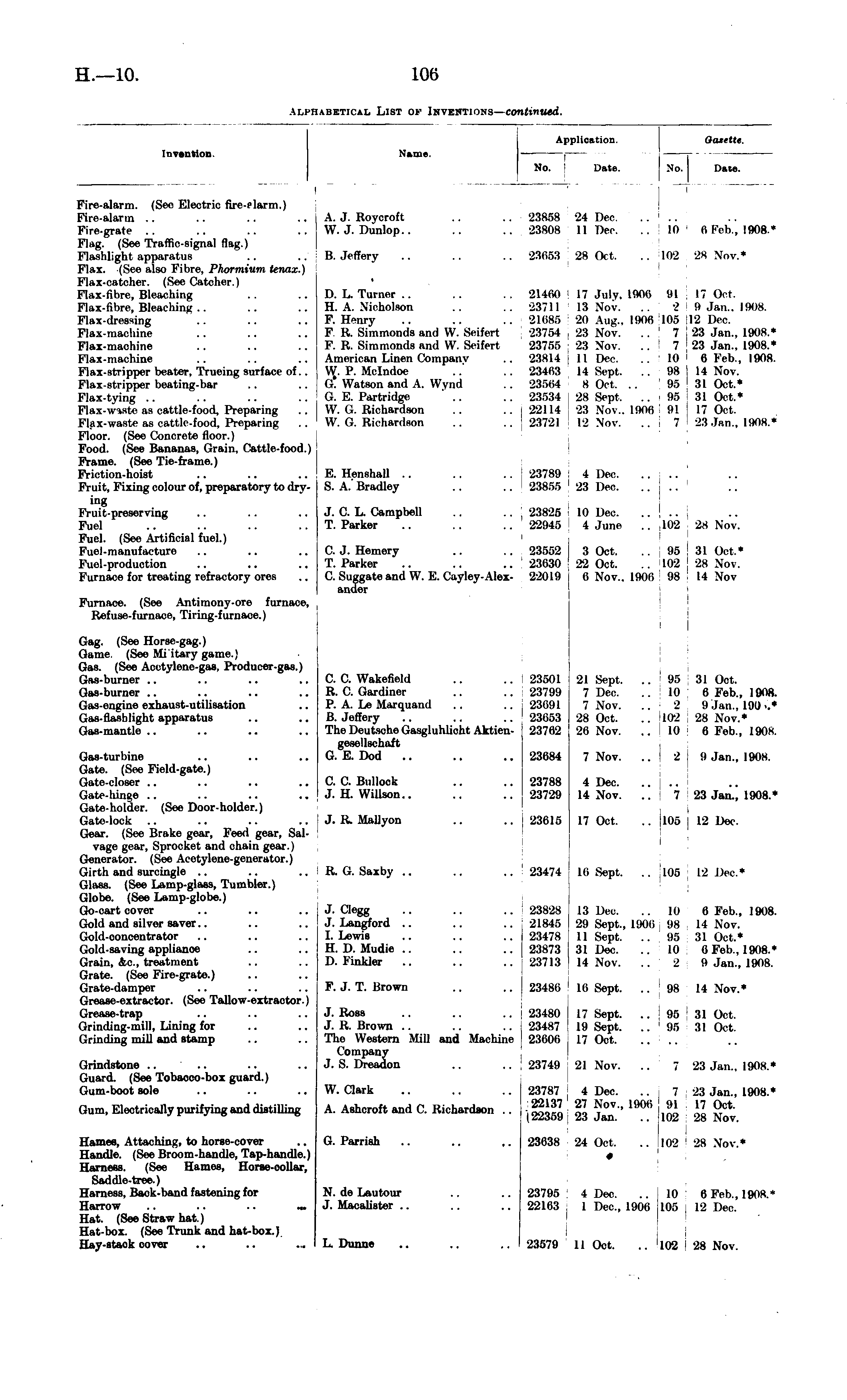 Application. Qaxettt. 'nun t<. Invention Name. ■ r No. Date. No. Date. Name. Fire-alarm. (See Electric fire-alarm.) Fire-alarm Fire-grate Flag. (See Traffic-signal flag.) Flashlight apparatus Flax. (See also Fibre, Phormium tenax.) Flax-catcher. (See Catcher.) Flax-fibre, Bleaching Flax-fibre, Bleaching Flax-dressing Flax-machine Flax-machine Flax-machine Flax-stripper beater. Trueing surface of.. Flax-stripper beating-bar Flax-tying .. Flax-wisto as cattle-food, Preparing .. : Flax-waste as cattle-food, Preparing Floor. (See Concrete floor.) Food. (See Bananas, Grain, Cattle-food.) Frame. (See Tie-frame.) Frirtion-hoist .. .. .. ! Fruit, Fixing colour of, preparatory to drying Fruit-preserving Fuel Fuel. (See Artificial fuel.) Fuel-manufacture Fuel-production Furnace for treating refractory ores A. J. Royoroft .. .. 23858 -24 Dec W. J. Dunlop.. .. .. 23808 11 Dec. .. 10 8Feb, IflOS. , U. .[offery .. .. .. '23<i5:i 28 Oct. .. 102 28 Nov.* • D. L. Tumor.. .. .. 21460 17 July, 1908 91 17 Oct. H. A. Nicholson .. .. -23711 13 Nov. .. 8 9 Jan., 1908. F.Henry .. .. .. 21686 20 Aug., 1906 108 [2 Dec. F. R. Simmonds and VV. Seiiert -23754 28 Nov. .. 7 23 Jan., 1908.* P. R. Simmonds and \V. Scifert 23755 23 Nov. .. 7 23 Jan.. 1908.* American Linen Company .. 28814 II Deo. .. Id 6 Feb., 1908. W. P. Mclndoe .. .. 23468 14 Kept. .. 98 It Nov. G. Watson and A. Wynd .. 28564 8 Out .. 98 31 Oct.* G. E. Partridge .. .. 23534 28 Sept. .. 98 31 Oct.* W.G.Richardson .. .. 22114 23 Nov., 1906 91 17 Oct. W. G. Richardson .. .. 23721 12 Nov. .. 7 23 Jan., 1908.* E. Henshall .. .. .. 23789 4 Dec S. A. - Bradley .. . . 23858 2.'! Dec \ J. C. L. Campbell .. .. 23825 10 Dec. .. .. T. Parker .. .. .. 22945 4 June .. 102 28 Nov. C. J. Hemery .. . . 23552 3 Oct. .. 95 31 Oct.* T.Parker .. .. .. 23030 22 Oct. .. 102 28 Nov. C. Suggate and W. E. Cayley-Alex- 22019 6 Nov.. 1906 98 : 14 Nov ander Furnace. (See Antimony-ore furnace, Refuse-furnace, Tiring-furnace.) Gag. (See Horse-gag.) Game. (See Mi itary game.) Gas. (See Acetylene-gas, Producer-gas.) Gas-burner Gas-burner Gas-engine exhaust-utilisation Gas-flashlight apparatus Gas-mantle C. C. Wakefield .. .. 23501 21 Sept. .. 95 31 Oct. R. C. Gardiner .. .. 23799 7 Deo. .. j 10 6 Feb., 1008. P. A. Le Marquand .. .. 23691 7 Nov. .. 2 9 Jan., 100 •.* B. Jeffery .. .. .. ! 23653 28 Oct. .. 102 28 Nov. , The Deutsche Gasgluhlicht Aktien- j 23762 26 Nov. .. 10 6 Feb., 1908. gesellschaft G. E. Dod .. .. .. 23684 7 Nov. ..2 9 Jan., 1908. 23001 23799 23G91 23053 23762 Gas-turbine Gate. (See Field-gate.) Gate-closer Gate-hinge .. .. .. .. Gate-holder. (See Door-holder.) Gate-lock Gear. (See Brake gear, Feed gear, Salvage gear, Sprocket and chain gear.) Generator. (See Acetylene-generator.) Girth and surcingle .. .. Glass. (See Lamp-glass, Tumbler.) Globe. (See Lamp-globe.) Go-cart cover Gold and silver saver.. Gold-concentrator Gold-saving appliance Grain, &c, treatment Grate. (See Fire-grate.) Grate-damper Grease-extractor. (See Tallow-extractor.) Grease-trap Grinding-mill, Lining for Grinding mill and stamp 23684 C. C. Bullock .. .. 23788 4 Dec J. H. Willson.. .. .. 23729 14 Nov. .. 7 23 Jan., 1908.* 23788 23729 J. R. Mallyon .. .. 23615 17 Oct. .. 105 12 Dec. 23615 R. G. Saxby .. .. .. 23474 16 Sept. .. L08 12 Dec.* 23474 J. Clegg .. .. .. 23828 13 Dec. .. 10 6 Feb., 1908. J. Langford .. .. .. 21845 29 Sept., 1906 98 14 Nov. I. Lewis .. .. .. 23478 11 Sept. .. 95 31 Oct.* H. D. Mudie .. .. .. 23873 31 Dec. .. 10 6 Feb., 1908.* D. Finkler .. .. .. 23713 14 Nov. .. 2 9 Jan., 1908. 23828 21845 23478 23873 23713 F. J. T. Brown .. .. 23486 16 Sept. .. 98 14 Nov.* 23486 J.Robs .. .. .. 23480 17 Sept. .. 95 31 Oct. J. R. Brown .. .. .. 23487 19 Sept. .. 98 31 Oct. The Western Mill and Machine 23006 17 Oct Company J. S. Dreadon .. .. 23749 -21 Nov. .. 7 28 Jan., 1908.* 23480 23487 23006 Grindstone Guard. (See Tobacco-box guard.) Gum-boot sole 23749 Gum, Electrically purifying and distilling W.Clark .. .. .. j 23787 4 Dec. .. 7 23 Jan., 1908.* A AshcroftandC Richardson : 22137 27 Nov - 190<i I 91 17 Oct - A. Asncroit and L. Richardson .. , - 23 Jan . .. ! 102 2 8 Nov. G. Parrish .. .. ,. 23638 24 Oct. .. 102 28 Nov.* 23787 22137 (22359 Hames, Attaching, to horse-cover Handle. (See Broom-handle, Tap-handle.) Harness. (See Hames, Horse-collar, Saddle-tree.) Harness, Back-band fastening for Harrow Hat. (See Straw hat.) Hat-box. (See Trunk and hat-box.) Hay-stack cover N. de Lautour .. .. 23795 4 Dec. .. 10 6 Feb., 19(18. * J. Macalister .. .. .. 22163J 1 Dec, 1906 105 19 Deo. 23638 23795 22163 L. Dunne .. .. .. 23579 11 Oct. .. 102 i 28 Nov. 23579