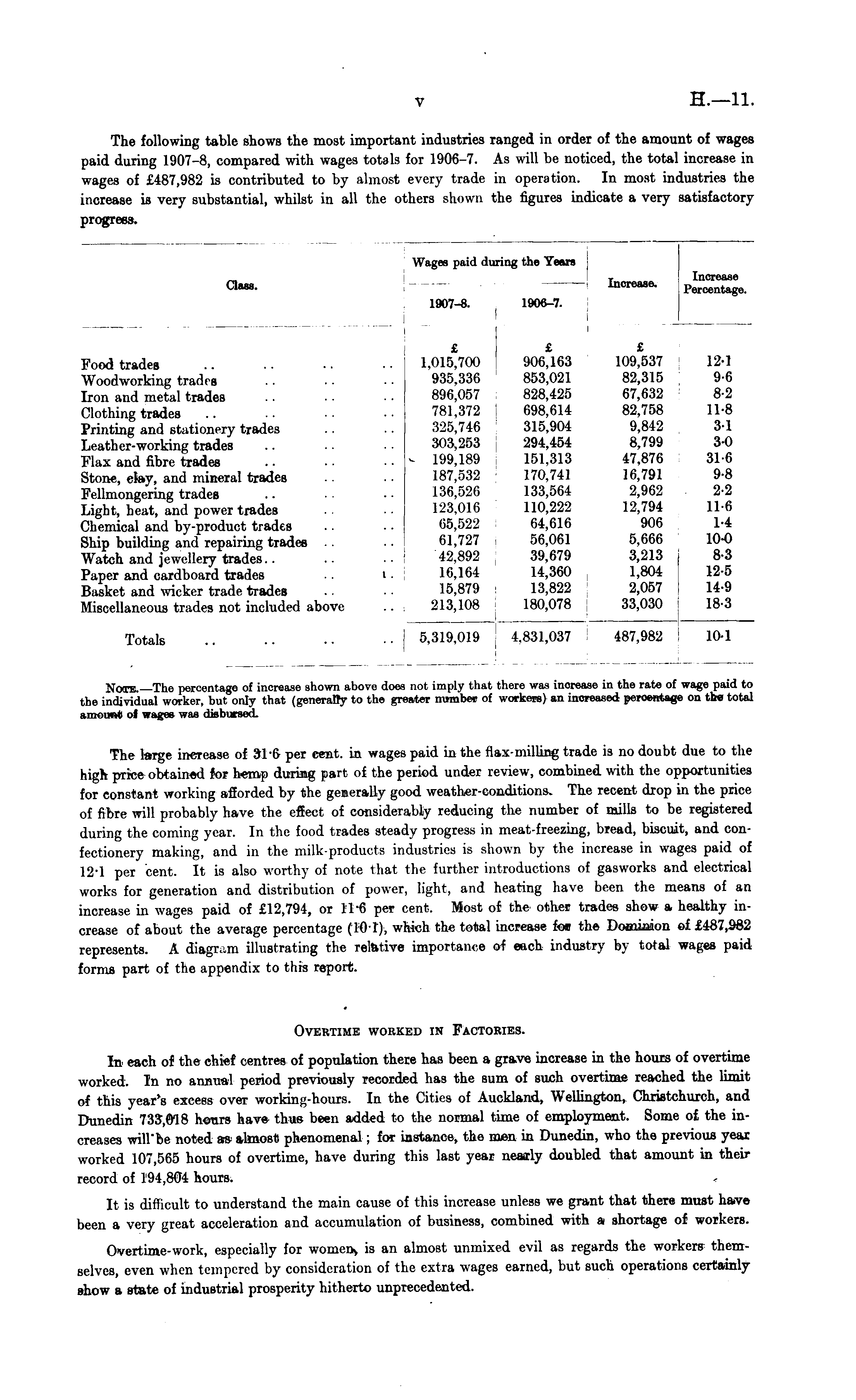 The large increase of 316 per cent, in wages paid in the flax-milling trade is no doubt due to the high price obtained for btmp during part <>f the period under review, combined with the opportunities for constant working afforded by the generally good weal tar-eoaditiana. The recent drop in the price of fibre will probably have the effect of considerably reAaeiog the number of mills to be registered during the coming year. In the food trades steady progress in meat-freezing, bread, biscuit, and confectionery making, and in the milk-products industries is shown by the increase in wages paid of 12-1 per cent. It is also worthy of note that the further introductions of gasworks and electrical works for generation and distribution of power, light, and heating have been the means of an increase in wages paid of £12,794, or 11-6 per cent. Most of the other trades show a healthy increase of about the average percentage (101), which the total increase for the Dominion of £487,982 represents. A diagram illustrating the relative importance of each industry by total wages paid forms part of the appendix to this report. Overtime worked in Factories. In each of the chief centres of population there has been a grave increase in the hours of overtime worked. In no annual period previously recorded has the sum of such overtime reached the limit of this year's excess over working-hours. In the Cities of Auckland, Wellington, Christchurch, and Dunedin 733,018 hours have thue been added to the normal time of employment. Some of the increases will'be noted as almost phenomenal; for instance, the men in Dunedin, who the previous year worked 107,565 hours of overtime, have during this last year nearly doubled that amount in their record of 194,804 hours. It is difficult to understand the main cause of this increase unless we grant that there must have been a very great acceleration and accumulation of business, combined with a shortage of workers. Overtime-work, especially for women* is an almost unmixed evil as regards the workers themselves, even when tempered by consideration of the extra wages earned, but such operations certainly show a state of industrial prosperity hitherto unprecedented.