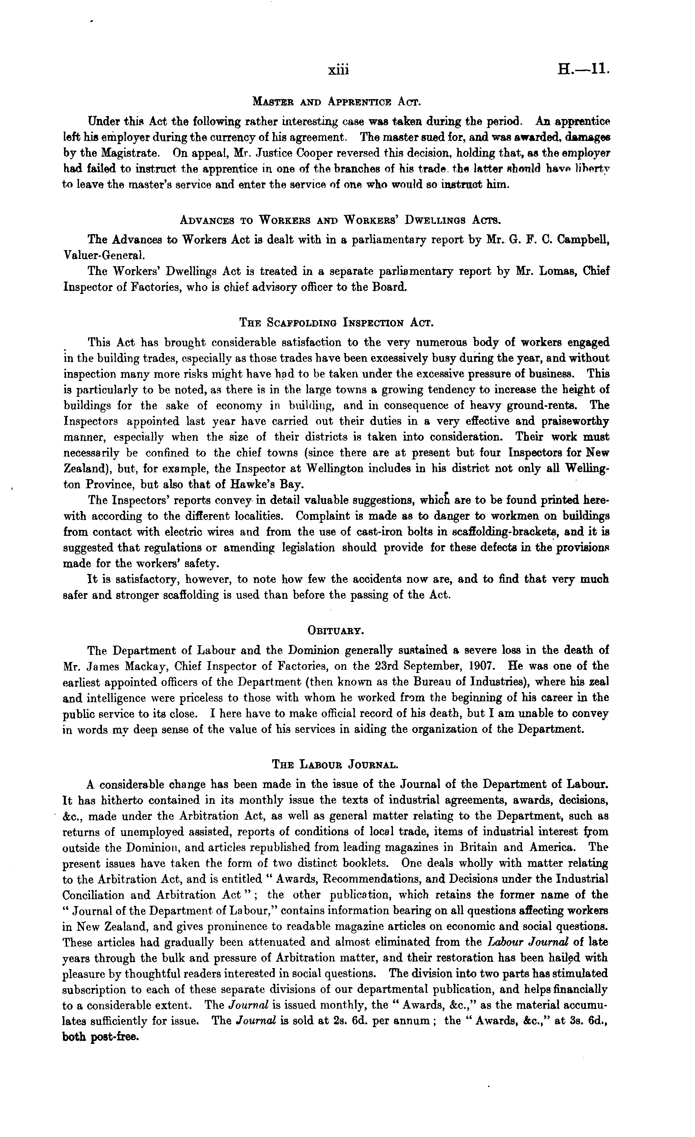 Master and Apprentice Act. Under this Act the following rather interesting ruse was taken during the period. An apprentice left his employer during the currency of his agreement. The master sued for. and was awarded, damages by the Magistrate. On appeal, Mr. Justice Cooper reversed this decision, holding that, as the employer had failed to instruct the apprentice in one of the branches of his traHc thfl latter Rhonld havp liberty to leave the master's service and enter the service of one who would so instruct him. Advances to Workers and Workers' Dwellings Acts. The Advances to Workers Act is dealt with in a parliamentary report by Mr. G. F. C. Campbell, Valuer-General. The Workers' Dwellings Act is treated in a separate parliamentary report by Mr. Lomas, Chief Inspector of Factories, who is chief advisory officer to the Board. The Scaffolding Inspection Act. This Act has brought considerable satisfaction to the very numerous body of workers engaged in (be building trades, especially as those trades have been excessively busy during the year, and without inspection many more risks might have had to be taken under the excessive pressure of business. This is particularly to be noted, as there is in the large towns a growing tendency to increase the height of buildings for the sake of economy in building, and in consequence of heavy ground-rents. The Inspectors appointed last year have carried out their duties in a very effective and praiseworthy manner, especially when the size of their districts is taken into consideration. Their work must necessarily be confined to the chief towns (since there are at present but four Inspectors for New Zealand), but, for example, the Inspector at Wellington includes in his district not only all Wellington Province, but also that of Hawke's Bay. The Inspectors' reports convey in detail valuable suggestions, which are to be found printed herewith according to the different localities. Complaint is made as to danger to workmen on buildings from contact with electric wires and from the use of cast-iron bolts in scaffolding-brackets, and it is suggested that regulations or amending legislation should provide for these defects in the provisions made for the workers' safety. It is satisfactory, however, to note how few the accidents now are, and to find that very much safer and stronger scaffolding is used than before the passing of the Act. Obituary. The Department of Labour and the Dominion generally sustained a severe loss in the death of Mr. James Mackay, Chief Inspector of Factories, on the 23rd September, 1907. He was one of the earliest appointed officers of the Department (then known as the Bureau of Industries), where his zeal and intelligence were priceless to those with whom he worked from the beginning of his career in the public service to its close. I here have to make official record of his death, but lam unable to convey in words my deep sense Of the value of his services in aiding the organization of the Department. The Labour Journal. A considerable change has been made in the issue of the Journal of the Department of Labour. It has hitherto contained in its monthly issue the texts of industrial agreements, awards, decisions, &c, made under the Arbitration Act, as well as general matter relating to the Department, such as returns of unemployed assisted, reports of conditions of local trade, items of industrial interest from outside the Dominion, and articles republished from leading magazines in Britain and America. The present issues have taken the form of two distinct booklets. One deals wholly with matter relating to the Arbitration Act, and is entitled " Awards, Eecommendations, and Decisions under the Industrial Conciliation and Arbitration Act" ; the other publication, which retains the former name of the " Journal of the Department of Labour," contains information bearing on all questions affecting workers in New Zealand, and gives prominence to readable magazine articles on economic and social questions. These articles had gradually been attenuated and almost eliminated from the Labour Journal of late years through the bulk and pressure of Arbitration matter, and their restoration has been hailed with pleasure by thoughtful readers interested in social questions. The division into two parts has stimulated subscription to each of these separate divisions of our departmental publication, and helps financially to a considerable extent. The Journal is issued monthly, the " Awards, &c," as the material accumulates sufficiently for issue. The Journal is sold at 2s. 6d. per annum ; the " Awards, &c," at 3s. 6d., both post-free.