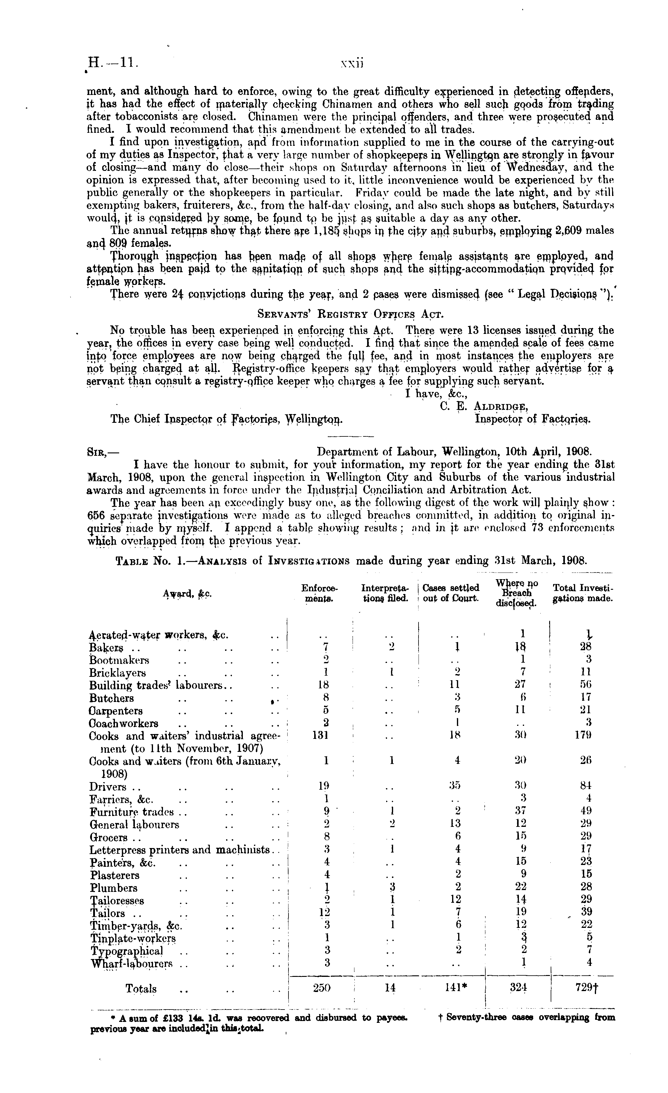 merit, and although hard to enforce, owing to the great difficulty experienced in detecting offenders, it has had the effect of materially checking Chinamen and others who sell such goods from trading after tobacconists are closed. Chinamen principal offenders, and three wen' prosecuted and lined. 1 would recommend thai this amendment be extended to all trai I find upon i ion supplied to me in the course of the carrying-out of my duties as Inspect ■ very large number of shopkeepers in Wollingtqn are strongly in favour of closing—and many do close—their shops on Saturday afternoons in lieu of Wei and the opinion is expressed that, after becoming used to it, little inconvenience would be experienced by the public generally or the shopkeepers in particular. Friday could be made the late night, and by still exempting bakers, fruiterers, &0., from the half-day closing, and also such shops as butchers, Saturdays would, it is cm me, be found I uitable a day as any other. The annual returns show that there arfi I. |.8Q simps in the city and suliurlis, employing 2,609 males and 809 females. Thorough inspection has been made of all shops where female assistants are employed, and attention has been paid to the sanitation of such -hops and the sitting-accommodation provided for female workers. There were 24 convictions during the year, and 2 cases were dismissed (see " Legal Decisions"'). Servants' Registry Okfkt.s Ait. No trouble has been experienced in enforcing this Act. There were 13 licenses issued during the year, the offices in every case being well conducted. I find that since the amended scale of fees came into force employees are now being charged the full fee, and in most, instances the employers are not being charged at all. keepers say that employers would rather advertise for a servant than consult a registrv-ollicc keeper who charges, a fee lor supplying such servant. I have, &c, ('. I , ]. AI.UIUDGE, The Chief Inspectqr of Factories, Welljngton. Inspector of Factories. Sir, — Department of Labour, Wellington. 10th April, 1908. I have the honour to submit, for your information, my repori tor the year ending the 31st March, 1908. upon the general inspection in Wellington City and Suburbs of the various industrial awards and agreements in force and sr tie [ndusj iliation and Arbitration Act. The year has bee] idijlgly busy as the following digest of the work will plainly show : 656 separate investigations to alleged breaches committed, in addition to original inquiries made : [. pp i.(i a i yble showing results; and in it ai i 73 enforcements which overlapped from the pri yious year.