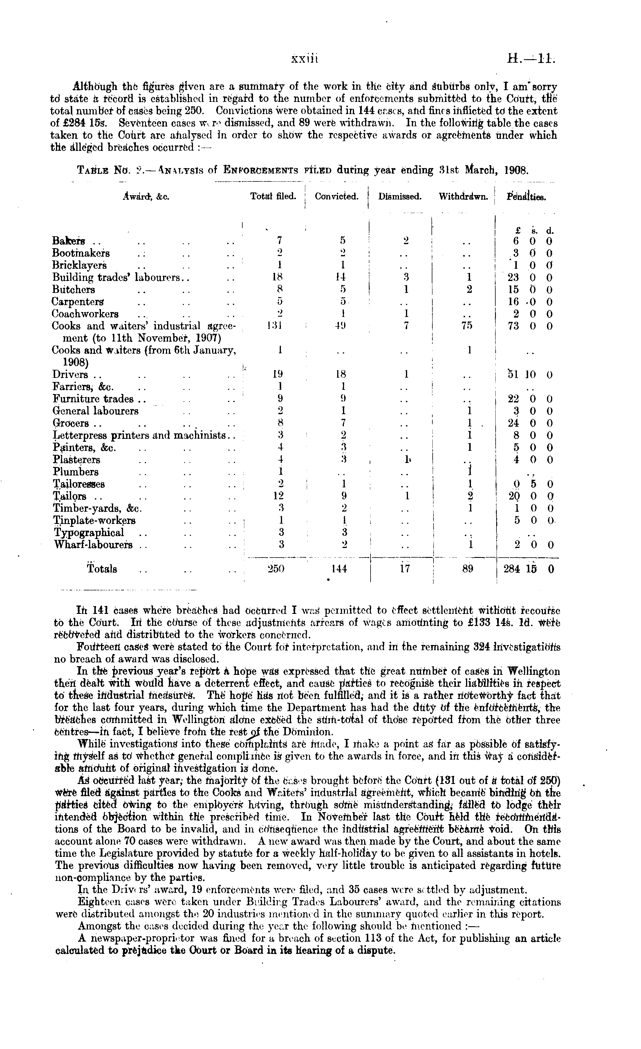 In 141 cases where bi d occurred I ttted to effect Sett! I fecotfttre to the Court. In the i these a'djudtm Hhtihg to £133 14s. Id. were •yd aid distributed to the workers e> Fourteen cas< i tore startx d to the Court ftii in: h.d in the remaining 324 ttfvestigi no breach of award was disclosed. In the previous year's report a hope was expressed fetal t!i imber of eases in Wellington then dealt with would h.iw a deterrent effect, and cognise' their liabilities in iespect to these industrial . The , hope .' •! it is ;; ratter notewoTthy fact that for the last four years, during which time the Department lias bad the duty of the I (tfi , the breaches committed in Wellington ::\ .'-total of those reported from the other three ceiitivs —in fact, I believe from the reitgjf the Dominion. While investigations' into these eomplarfrl lible of satisfying myself as to whether gcner.l eompliitt Iβ in force, and in ti able MiKiunt of original As occurred I. the majority of the fc» s 191 but of a fcotAtl of 250) wt'vo filed against parties to the Cooks and Waiters btt; which bi came binding on the parties cited owin;.' to the employ, rs having, through lle'6 to I6i intended objection within the prescfibe'd time. In November last th ■ Court held the reedrftihi i tions of the Board to be invalid, and in conseqnei .'id. On this account alone 70 cases were withdrawn. A new award was then made by the Court, and about the i time the Legislature provided by statute t( ly hulf-holiday to be given to all assistants in hotels. The previous difficulties now having been removed, very little trouble is anticipated regarding future non-compli.'ince by the parti Lithe 1) iv , 19 enforcements v . djuetifi Eight, ci . tions Iwtributed amongst the 20 i !ier in this report. Amongst the tded dining the year th< following should be mentioned : — A newspaper-proprietor was fined for a breach of section 113 of the Act, for publishing an article calculated to prejudice, tko (Jourt or Board in its hearing of a dispute.