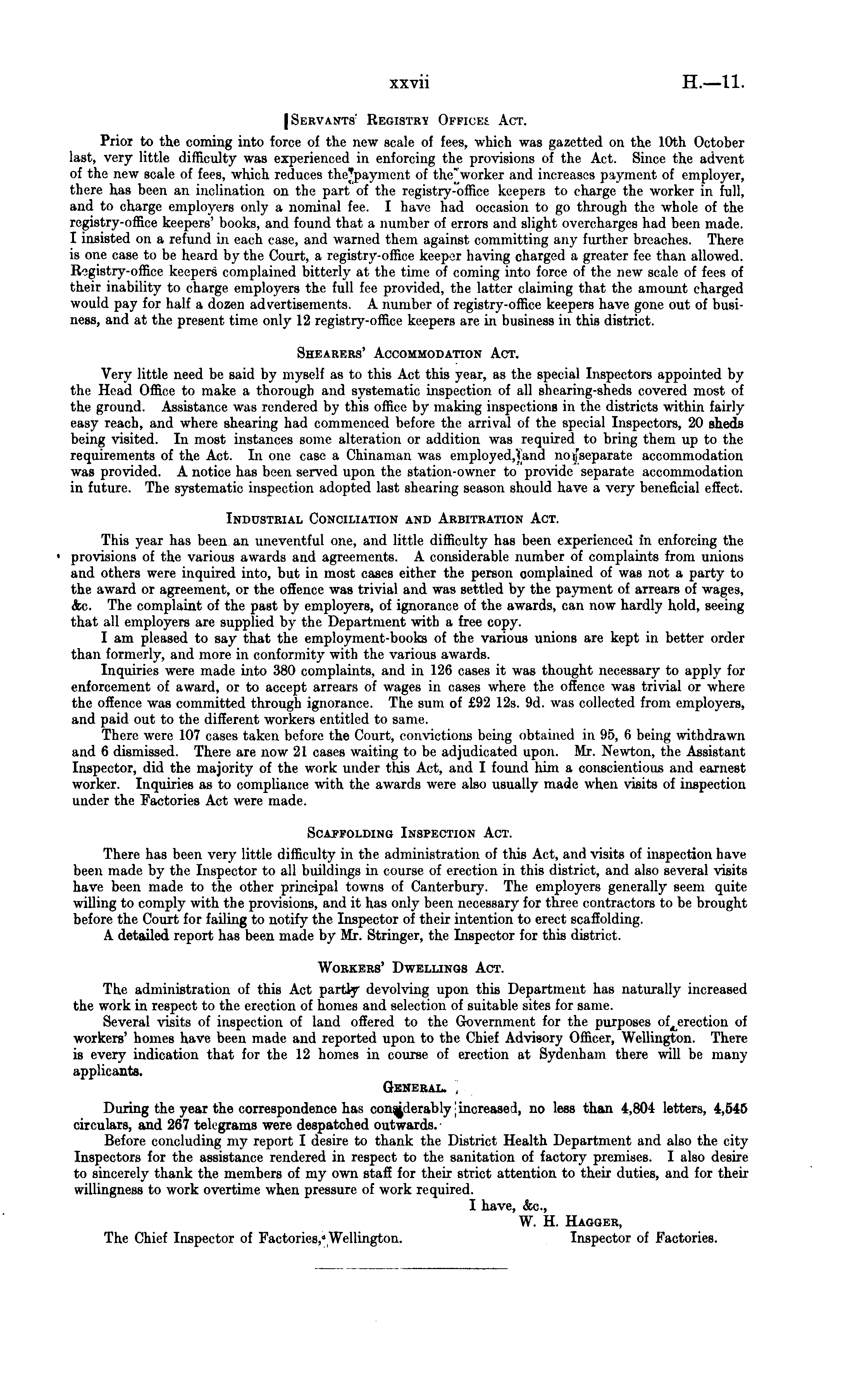 I Servants Registry Offices Act. Prior to the coming into force of the new scale of fees, which was gazetted on the 10th October last, very little difficulty was experienced in enforcing the provisions of the Act. Since the advent of the new scale of fees, which reduces thejpayment of the" worker and increases payment of employer, there has been an inclination on the part of the registry-office keepers to charge the worker in full. and to charge employers only a nominal fee. I have had occasion to go through the whole of the registry-office keepers' books, and found that a number of errors and slight overcharges had been made. I insisted on a refund in each case, and warned them against committing any further breaches. There is one case to be heard by the Court, a registry-office keeper having charged a greater fee than allowed. Rogistry-office keepers complained bitterly at the time of coming into force of the new scale of fees of their inability to charge employers the full fee provided, the latter claiming that the amount charged would pay for half a dozen advertisements. A number of registry-office keepers have gone out of business, and at the present time only 12 registry-office keepers are in business in this district. Shearers' Accommodation Act. Very little need be said by myself as to this Act this year, as the special Inspectors appointed by the Head Office to make a thorough and systematic inspection of all shearing-sheds covered most of the ground. Assistance was rendered by this office by making inspections in the districts within fairly easy reach, and where shearing had commenced before the arrival of the special Inspectors, 20 sheds being visited. In most instances some alteration or addition was required to bring them up to the requirements of the Act. In one case a Chinaman was employed.Vand not'separate accommodation was provided. A notice has been served upon the station-owner to provide separate accommodation in future. The systematic inspection adopted last shearing season should have a very beneficial effect. Industrial Conciliation and Arbitration Act. This year has been an uneventful one, and little difficulty has been experienced in enforcing the • provisions of the various awards and agreements. A considerable number of complaints from unions and others were inquired into, but in most cases either the person complained of was not a party to the award or agreement, or the offence was trivial and was settled by the payment of arrears of wages, &c. The complaint of the past by employers, of ignorance of the awards, can now hardly hold, seeing that all employers are supplied by the Department with a free copy. I am pleased to say that the employment-books of the various unions are kept in better order than formerly, and more in conformity with the various awards. Inquiries were made into 380 complaints, and in 126 cases it was thought necessary to apply for enforcement of award, or to accept arrears of wages in cases where the offence was trivial or where the offence was committed through ignorance. The sum of £92 12s. 9d. was collected from employers, and paid out to the different workers entitled to same. There were 107 cases taken before the Court, convictions being obtained in 95, 6 being withdrawn and 6 dismissed. There are now 21 cases waiting to be adjudicated upon. Mr. Newton, the Assistant Inspector, did the majority of the work under this Act, and I found him a conscientious and earnest worker. Inquiries as to compliance with the awards were also usually made when visits of inspection under the Factories Act were made. Scaffolding Inspection Act. There has been very little difficulty in the administration of this Act, and visits of inspection have been made by the Inspector to all buildings in course of erection in this district, and also several visits have been made to the other principal towns of Canterbury. The employers generally seem quite willing to comply with the provisions, and it has only been necessary for three contractors to be brought before the Court for failing to notify the Inspector of their intention to erect scaffolding. A detailed report has been made by Mr. Stringer, the Inspector for this district. Workers' Dwellings Act. The administration of this Act partly devolving upon this Department has naturally increased the work in respect to the erection of homes and selection of suitable sites for same. Several visits of inspection of land offered to the Government for the purposes of workers' homes have been made and reported upon to the Chief Advisory Officer, Wellington. There is every indication that for the 12 homes in course of erection at Sydenham there will be many applicants. General, j During the year the correspondence has considerably j increased, no less than 4,804 letters, 4,545 circulars, and 267 telegrams were despatched outwards. Before concluding my report I desire to thank the District Health Department and also the city Inspectors for the assistance rendered in respect to the sanitation of factory premises. I also desire to sincerely thank the members of my own staff for their strict attention to their duties, and for their willingness to work overtime when pressure of work required. I have, &c., W. H. Hagger, The Chief Inspector of Factories/Wellington. Inspector of Factories.