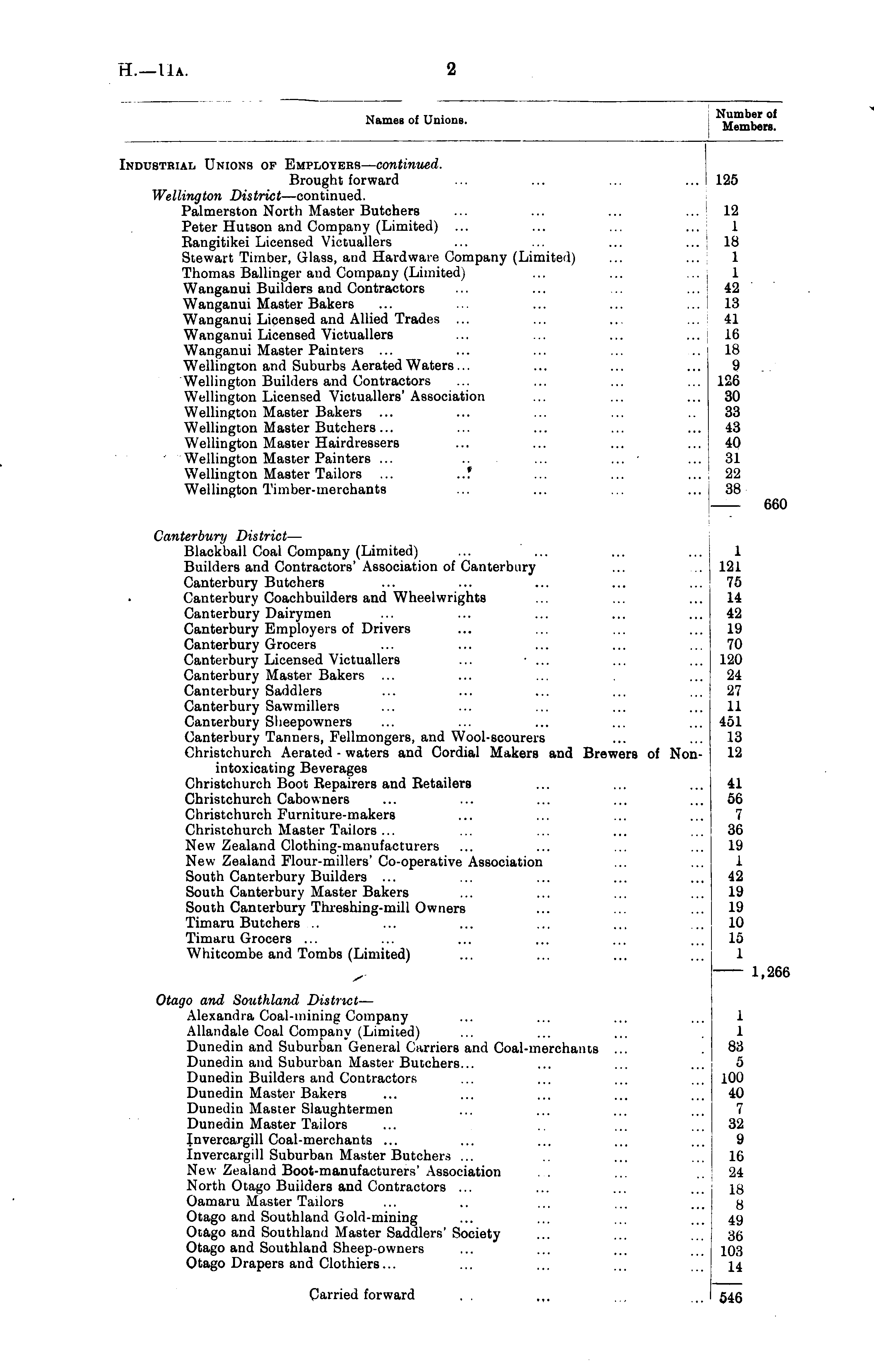 Names of Unions. Number of Members. Industrial Unions of Employers— continued. Brought forward Wellington District —continued. Palmerston North Master Butchers Peter Hutson and Company (Limited) Rangitikei Licensed Victuallers Stewart Timber, Glass, and Hardware Company (Limited) Thomas Ballinger aud Company (Limited) Wanganui Builders and Contractors Wanganui Master Bakers Wanganui Licensed and Allied Trades Wanganui Licensed Victuallers Wanganui Master Painters ... Wellington and Suburbs Aerated Waters... Wellington Builders and Contractors Wellington Licensed Victuallers' Association Wellington Master Bakers Wellington Master Butchers... Wellington Master Hairdressers Wellington Master Painters ... .. ... ... • Wellington Master Tailors Wellington Timber-merchants 125 12 1 18 1 1 42 13 41 16 18 9 126 30 33 43 40 31 22 38 660 Canterbury District — Blackball Coal Company (Limited) ... ... Builders and Contractors' Association of Canterbury Canterbury Butchers Canterbury Coachbuilders and Wheelwrights Canterbury Dairymen Canterbury Employers of Drivers Canterbury Grocers Canterbury Licensed Victuallers ... • ... Canterbury Master Bakers ... Canterbury Saddlers Canterbury Sawmillers Canterbury Slieepowners Canterbury Tanners, Fellmongers, and Wool-scourers Christchurch Aerated - waters and Cordial Makers and Brewers of Nonintoxicating Beverages Christchurch Boot Repairers and Retailers Christchurch Cabowners Christchurch Furniture-makers Christchurch Master Tailors ... New Zealand Clothing-manufacturers New Zealand Flour-millers' Co-operative Association South Canterbury Builders ... South Canterbury Master Bakers South Canterbury Threshing-mill Owners Timaru Butchers .. Timaru Grocers ... Whitcombe and Tombs (Limited) 1 121 75 14 42 19 70 120 24 27 11 451 13 12 41 56 7 36 19 1 42 19 19 10 15 1 y 1,266 Otago and Southland District — Alexandra Coal-mining Company Allandale Coal Company (Limited) Dunedin and Suburban General Carriers and Coal-merchants ... Dunedin and Suburban Master Butchers... Dunedin Builders and Contractors Dunedin Master Bakers Dunedin Master Slaughtermen Dunedin Master Tailors Invercargill Coal-merchants ... Invercargill Suburban Master Butchers ... New Zealand Boot-manufacturers' Association North Otago Builders and Contractors ... Oamaru Master Tailors Otago and Southland Gold-mining Otago and Southland Master Saddlers' Society Otago and Southland Sheep-owners Otago Drapers and Clothiers... 1 1 83 5 100 40 7 32 9 16 24 18 8 49 36 103 14 Carried forward 546