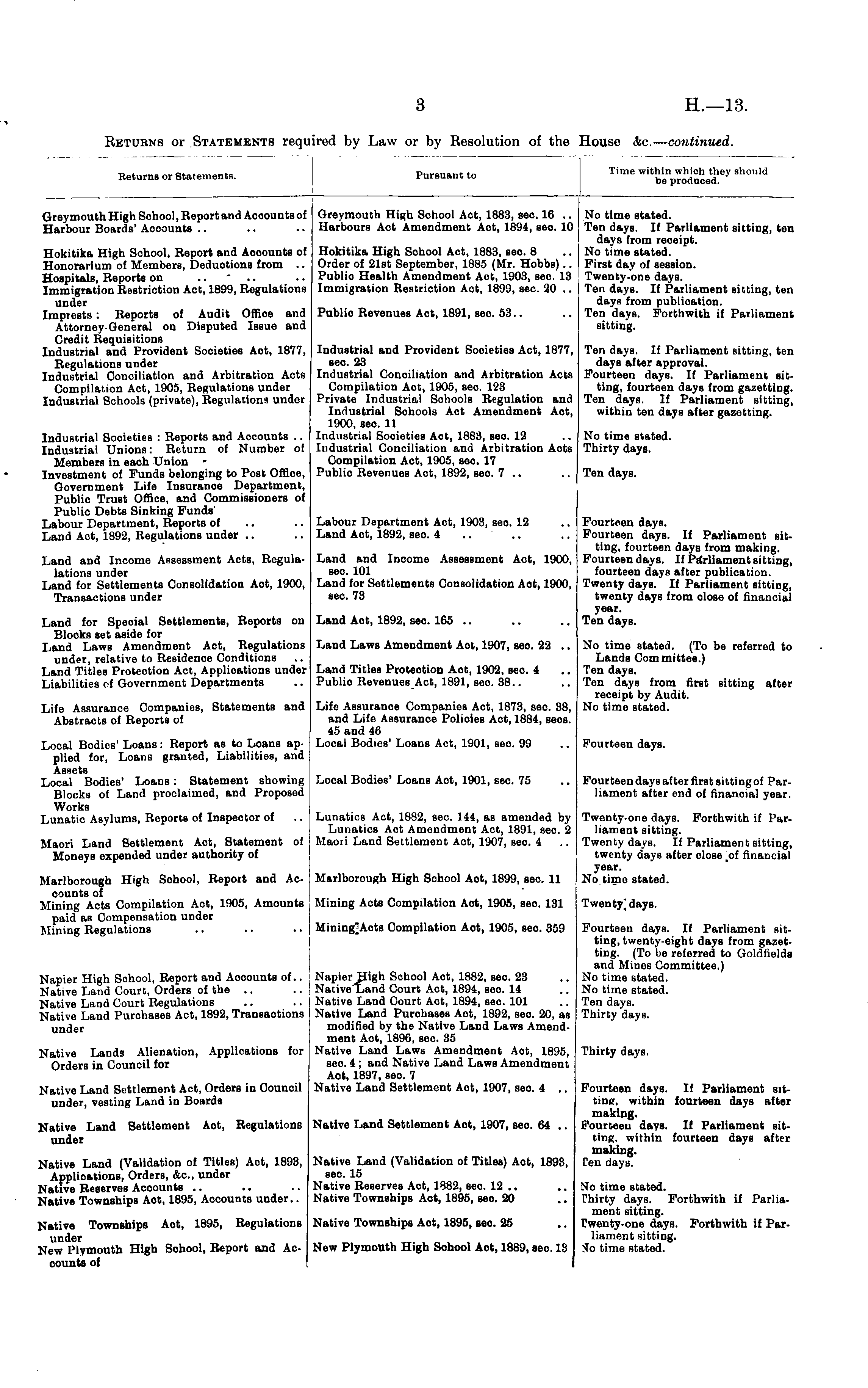 Pursuant to 'ime within which they s! be produced. lion Returns or Statements. GreymouthHigh School, Report and Acoountsof Harbour Boards' Aooounts Greymouth High School Aot, 1883, sec. 16 .. Harbours Act Amendment Act, 1894, seo. 10 No time stated. Ten days. If Parliament sitting, ten days from receipt. No time stated. First day of session. Twenty-one days. Ten days. If Parliament Bitting, ten days from publication. Ten days. Forthwith if Parliament sitting. Hokitika High School, Report and Aooounts of Honorarium of Members, Deductions from .. Hospitals, Reports on Immigration Restriction Act, 1899, Regulations under Imprests : Reports of Audit Office and Attorney-General on Disputed Issue and Credit Requisitions Industrial and Provident Societies Aot, 1877, Regulations under Industrial Conciliation and Arbitration Acts Compilation Act, 1905, Regulations under Industrial Schools (private), Regulations under Hokitika High School Act, 1883, seo. 8 Order of 21st September, 1885 (Mr. Hobbs) .. Publio Health Amendment Aot, 1903, sec. 13 Immigration Restriction Act, 1899, sec. 20 .. Publio Revenues Act, 1891, sec. 53.. Industrial and Provident Societies Act, 1877, sec. 23 Industrial Conciliation and Arbitration Acts Compilation Act, 1905, seo. 123 Private Industrial Schools Regulation and Industrial Schools Act Amendment Act, 1900, seo. 11 Industrial Societies Aot, 1883, seo. 12 Industrial Conciliation and Arbitration Acts Compilation Act, 1905, seo. 17 Publio Revenues Act, 1892, seo. 7 .. Ten days. If Parliament sitting, ten days after approval. Fourteen days. If Parliament sitting, fourteen days from gazetting. Ten days. If Parliament sitting, within ten days after gazetting. Industrial Societies : Reports and Accounts .. Industrial Unions: Return of Number of Members in each Union • Investment of Funds belonging to Post Office, Government Life Insurance Department, Public Trust Office, and Commissioners of Public Debts Sinking Funds' Labour Department, Reports of Land Act, 1892, Regulations under No time stated. Thirty days. Ten days. Land and Income Assessment Acts, Regulalations under Land for Settlements Consolidation Aot, 1900, Transactions under Labour Department Act, 1903, seo. 12 Land Act, 1892, seo. 4 Land and Income Assessment Act, 1900, sec. 101 Land for Settlements Consolidation Aot, 1900, sec. 73 Fourteen days. Fourteen days. If Parliament sitting, fourteen days from making. Fourteen days. If Parliament sitting, fourteen days after publication. Twenty days. If Parliament sitting, twenty days from olose of financial year. Ten days. Land for Special Settlements, Reports on Blooks set aside for Land Laws Amendment Aot, Regulations under, relative to Residence Conditions Land Titles Protection Act, Applications under Liabilities rf Government Departments Land Act, 1892, sec. 165 .. Land Laws Amendment Aot, 1907, seo. 22 .. No time stated. (To be referred to Lands Committee.) Ten days. Ten days from first sitting after receipt by Audit. No time stated. Land Titles Protection Act, 1902, seo. 4 Publio Revenues Act, 1891, seo. 88.. Life Assurance Companies, Statements and Abstracts of Reports of Life Assurance Companies Act, 1873, seo. 38, and Life Assurance Policies Act, 1884, sees. 45 and 46 Local Bodies' Loans Act, 1901, see. 99 Local Bodies' Loans: Report as to Loans applied for, Loans granted, Liabilities, and Assets Local Bodies' Loans : Statement showing Blocks of Land proclaimed, and Proposed Works Lunatic Asylums, Reports of Inspector of Fourteen days. Local Bodies' Loans Aot, 1901, seo. 75 Fourteen days after first sitting of Parliament after end of financial year. Lunatics Act, 1882, sec. 144, as amended by Lunatics Act Amendment Act, 1891, seo. 2 Maori Land Settlement Act, 1907, seo. 4 Twenty-one days. Forthwith if Parliament sitting. Twenty days. If Parliament sitting, twenty days after close ,of financial year. No time stated. Maori Land Settlement Act, Statement of Moneys expended under authority of Marlborough High Sohool, Report and Accounts of Mining Acts Compilation Act, 1905, Amounts paid as Compensation under Mining Regulations Marlborough High Sohool Aot, 1899, seo. 11 Mining Acts Compilation Aot, 1905, seo. 131 Twenty] days. Napier High School, Report and Acoounts of.. Native Land Court, Orders of the .. Native Land Court Regulations Native Land Purohases Act, 1892, Transactions under Mining]Acts Compilation Aot, 1905, sec. 359 Napier High Sohool Aot, 1882, sec. 23 Native Land Court Aot, 1894, seo. 14 Native Land Court Act, 1894, sec. 101 Native Land Purchases Act, 1892, seo. 20, as modified by the Native Land Laws Amendment Aot, 1896, sec. 35 Native Land Laws Amendment Aot, 1895, seo. 4; and Native Land Laws Amendment Act, 1897, seo. 7 Native Land Settlement Act, 1907, seo. 4 .. Fourteen days. If Parliament sitting, twenty-eight days from gazetting. (To be referred to Goldfiolds and Mines Committee.) No time stated. No time stated. Ten days. Thirty days. Native Lands Alienation, Applications for Orders in Council for Thirty days. Native Land Settlement Act, Orders in Council under, vesting Land in Boards Native Land Settlement Aot, Regulations under Native Land Settlement Aot, 1907, seo. 64 .. Fourteen days. If Parliament sitting, within fourteen days after making. Fourteen days. If Parliament sitting, within fourteen days after making. Ten days. Native Land (Validation of Titles) Act, 1893, Applications, Orders, &c, under Native Reserves Accounts Native Townships Aot, 1895, Accounts under.. Native Land (Validation of Titles) Aot, 1893, seo. 15 Native Reserves Act, 1882, sec. 12 .. Native Townships Aot, 1895, seo. 20 No time stated. Thirty days. Forthwith if Parliament sitting. Twenty-one days. Forthwith if Parliament sitting. So time stated. Native Townships Aot, 1895, Regulations under New Plymouth High Sohool, Report and Accounts of Native Townships Act, 1895, see. 25 New Plymouth High School Aot, 1889, seo. 13