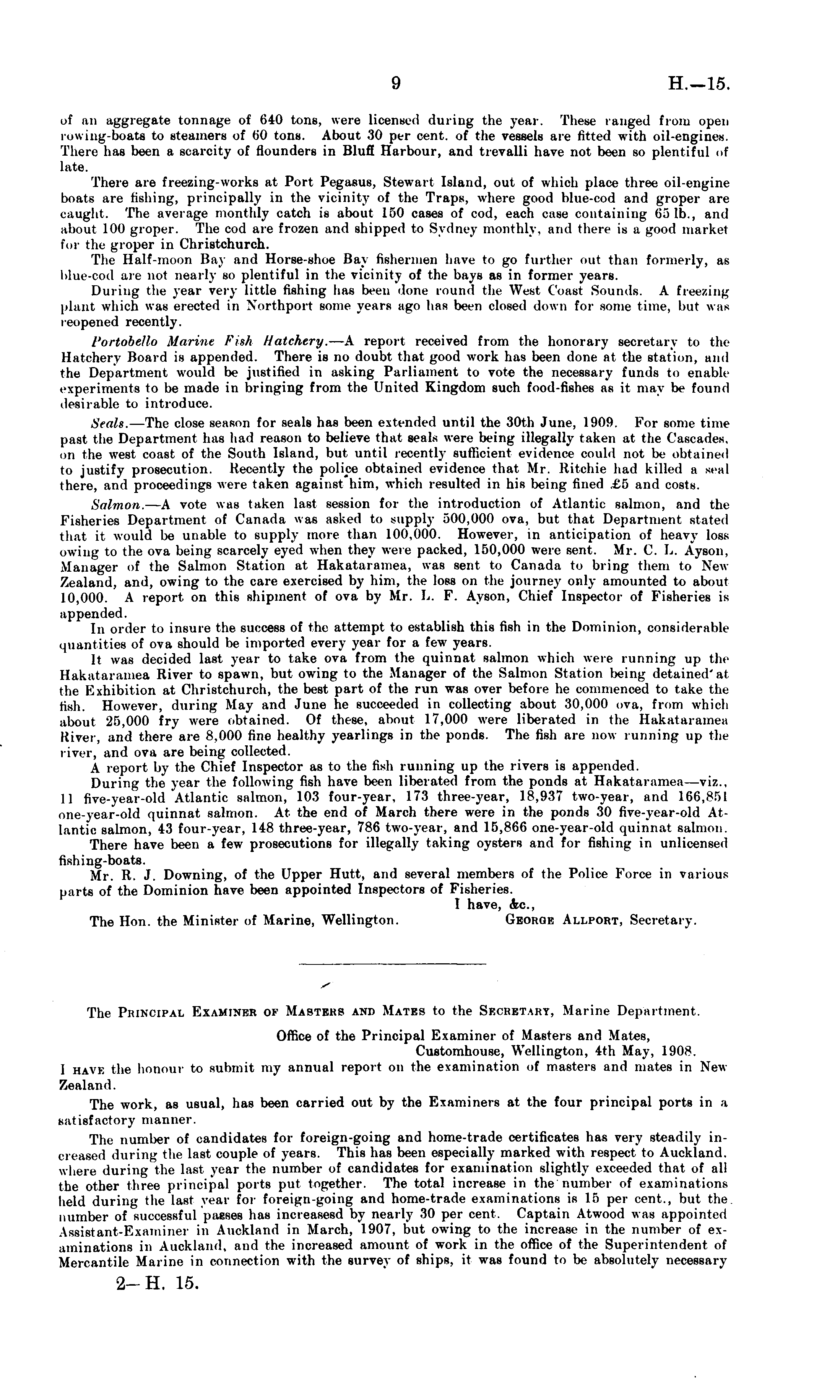 The Principal Examiner ok Masters ANn Mates to the Secretary, Marine Department. Office of the Principal Examiner of Masters and Mates, Customhouse, Wellington, 4th May, 190S. I have the honour to submit my annual report on the examination of masters and mates in New Zealand. The work, as usual, has been carried out by the Examiners at the four principal ports in a satisfactory manner. The number of candidates for foreign-going and home-trade certificates has very steadily increased dining the last couple of years. This has been especially marked with respect to Auckland. where during the last vear the number of candidates for examination slightly exceeded that of all the other three principal ports put together. The total increase in the number of examinations held during the last year for foreign-going and home-trade examinations is 15 per cent., but the number of successful paeses has inereasesd by nearly 30 per cent. Captain Atwood was appointed Assistant-Examiner in Auckland in March, 1907, but owing to the increase in the number of examinations in Auckland, and the increased amount of work in the office of the Superintendent of Mercantile Marine in connection with the survey of ships, it was found to be absolutely necessary