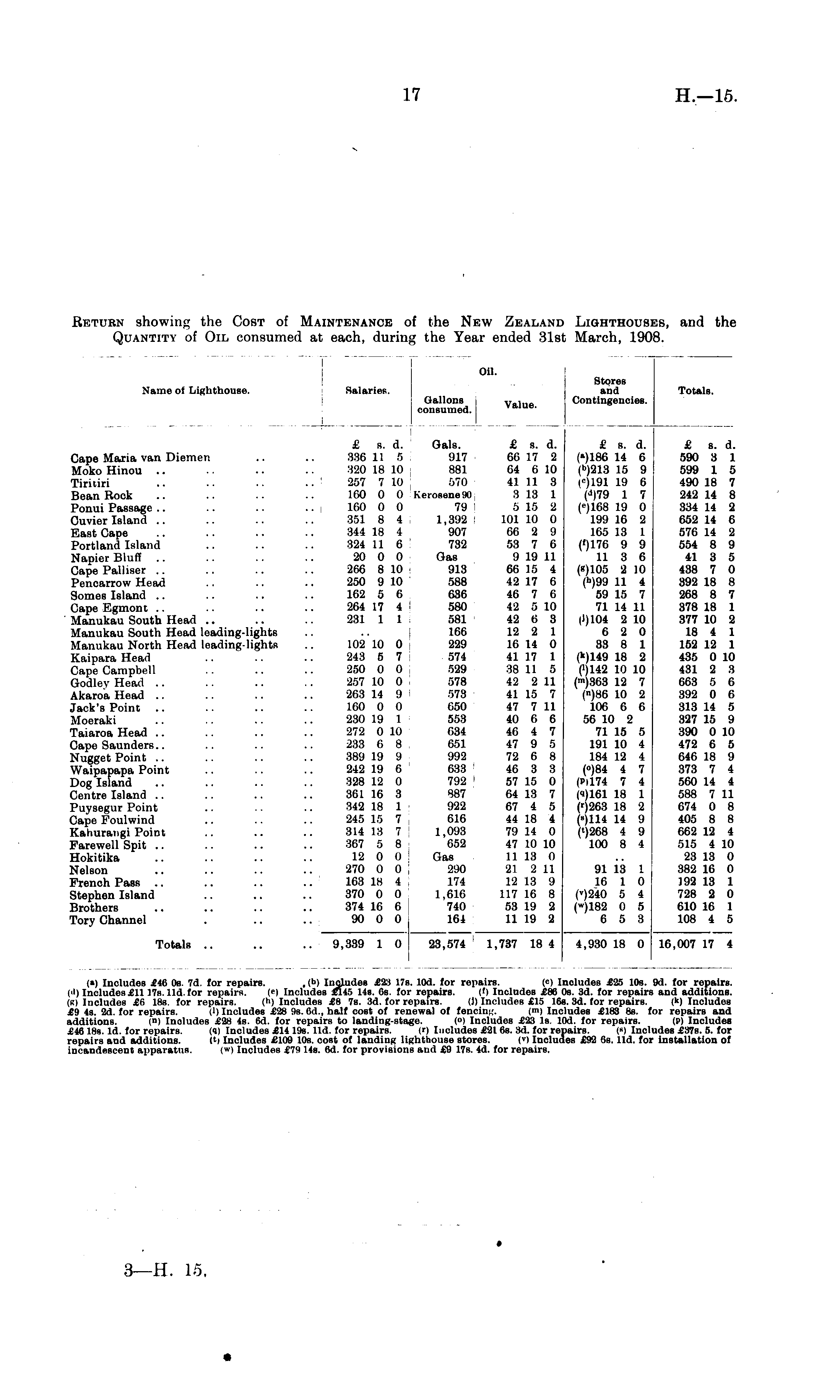 Return showing the Cost of Maintenance of the New Zealand Lighthouses, and the Quantity of Oil consumed at each, during the Year ended 31st March, 1908.