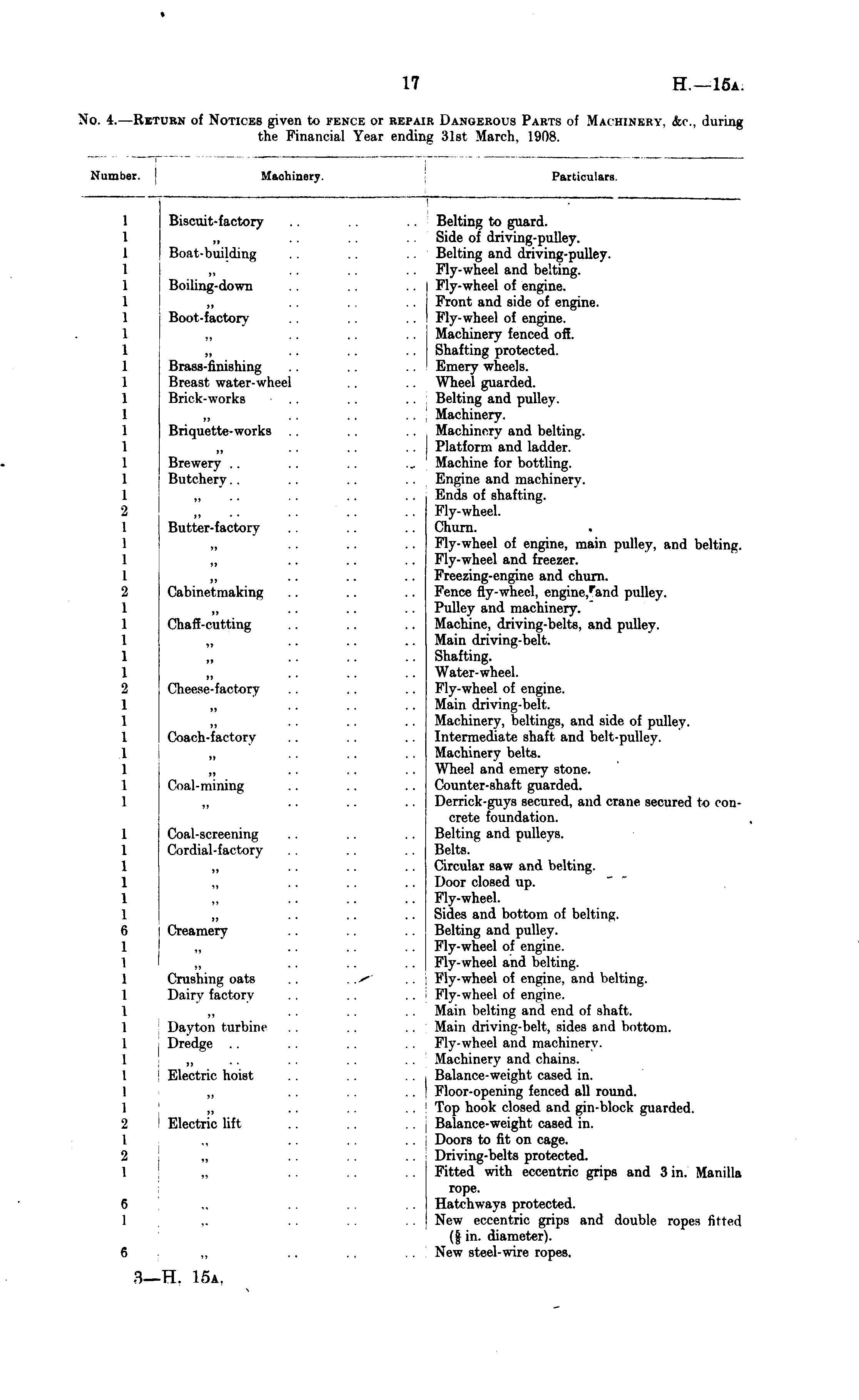 No. 4.—Return of Notices given to fence or repair Dangerous Parts of Machinery. &c., during the Financial Year ending 31st March, 1908.