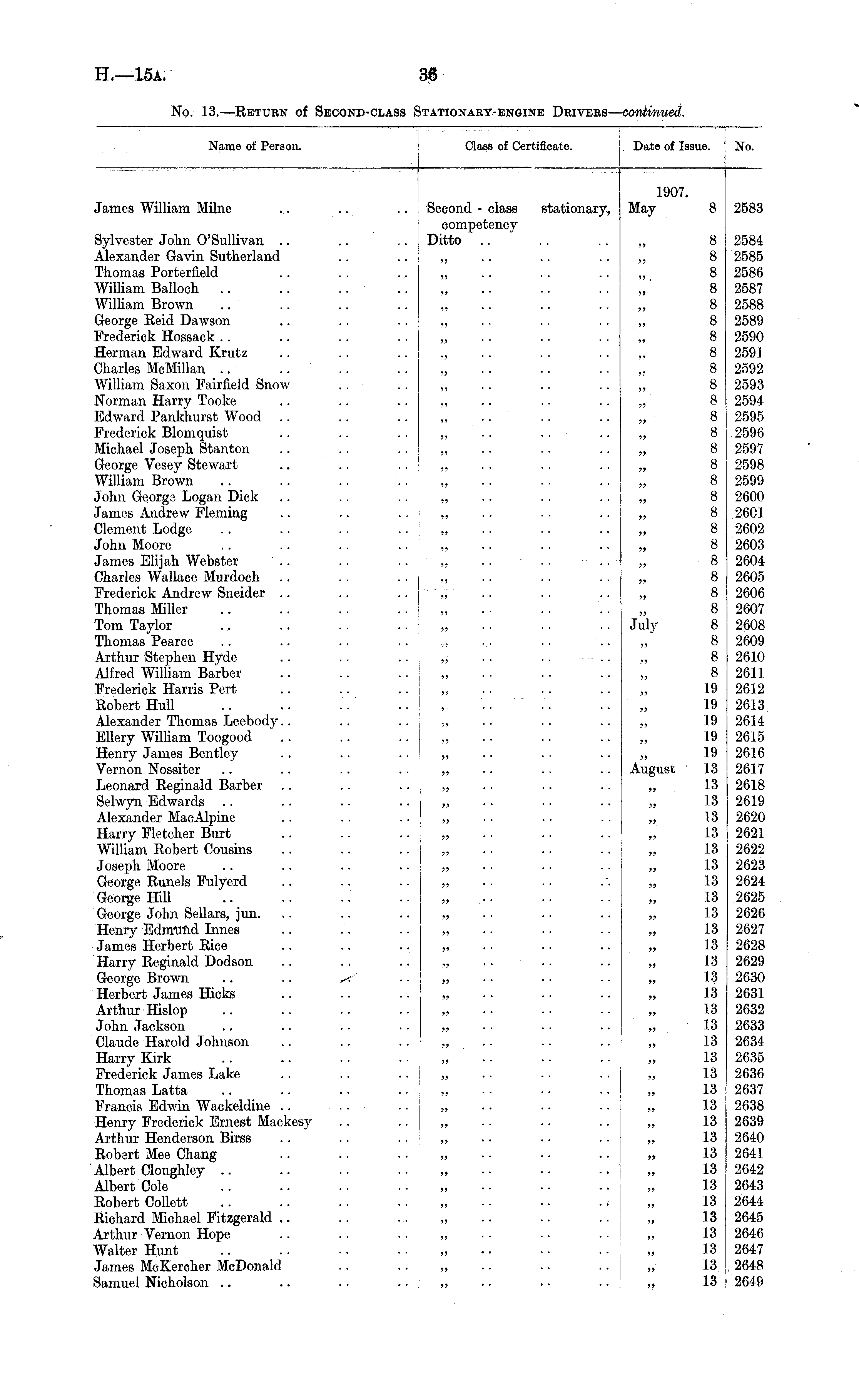 Name of Person. Class of Certificate. Date of Issue. No. James William Milne 1907. Second - class stationary, May 8 2583 Sylvester John O'Sullivan .. Alexander Gavin Sutherland Thomas Porterfield William Balloch William Brown George Reid Dawson Frederick Hossack Herman Edward Krutz Charles McMillan William Saxon Pairfield Snow Norman Harry Tooke Edward Pankhurst Wood Frederick Blomquist Michael Joseph Stanton George Vesey Stewart William Brown John George Logan Dick James Andrew Fleming Clement Lodge John Moore James Elijah Webster Charles Wallace Murdoch Frederick Andrew Sneider .. Thomas Miller Tom Taylor Thomas Pearce Arthur Stephen Hyde Alfred William Barber Frederick Harris Pert Robert Hull Alexander Thomas Leebody.. Ellery William Toogood Henry James Bentley Vernon Nossiter Leonard Reginald Barber Selwyn Edwards Alexander MacAlpine Harry Fletcher Burt William Robert Cousins Joseph Moore George Runels Fulyerd George Hill George John Sellars, jun. Henry Edmund Innes James Herbert Rice Harry Reginald Dodson George Brown Herbert James Hicks Arthur Hislop John Jackson Claude Harold Johnson Harry Kirk Frederick James Lake Thomas Latta Francis Edwin Wackeldine .. Henry Frederick Ernest Mackesy Arthur Henderson Birss Robert Mee Chang Albert Cloughley Albert Cole Robert Collett Richard Michael Fitzgerald .. Arthur Vernon Hope Walter Hunt James McKercher McDonald Samuel Nicholson .. ,»?' competency Ditto .. ?> j> J? ?> ?> J? >> »j >» 5> >> j> )» )> July ?) »? 55 ?S >> J? >7 August ?? >> >> j? >> >> *> » »> ?> ?J >> >J >» JJ )> 7) j> >> >J J? ») >» j> 5> >J )> >» 8 8 8 8 8 8 8 8 8 8 8 8 8 8 8 8 8 8 8 8 8 8 8 8 8 8 8 8 19 19 19 19 19 13 13 13 13 13 13 13 13 13 13 13 13 13 13 13 13 13 13 13 13 13 13 13 13 13 13 13 13 13 13 13 13 13 2584 2585 2586 2587 2588 2589 2590 2591 2592 2593 2594 2595 2596 2597 2598 2599 2600 26C1 2602 2603 2604 2605 2606 2607 2608 2609 2610 2611 2612 2613 2614 2615 2616 2617 2618 2619 2620 2621 2622 2623 2624 2625 2626 2627 2628 2629 2630 2631 2632 2633 2634 2635 2636 2637 2638 2639 2640 2641 2642 2643 2644 2645 2646 2647 2648 2649 ?> • " >7 • • >> ' ' 71 • • ?y • • j> ■ • r>? • " ;? • • ?> • ' >? • • >5 " ' ;? " • 77 ' * ») • • 77 • • 1? ' ' 71 • • 77 • ' 75 * * j> " ' ;■? 77 ' m •)■) ' • •> • • j, • ■ ?? ' ' )> ' * >> * ' >> ■ ■ >> * * j> ■ * i> • ' J? ■ ' ;> ■ • ;j • ■ 77 ' • 79 • • ?> • ■ >? • ■ 77 • ' »> • * »> ■ ' >J • * 7> • ' •> * "