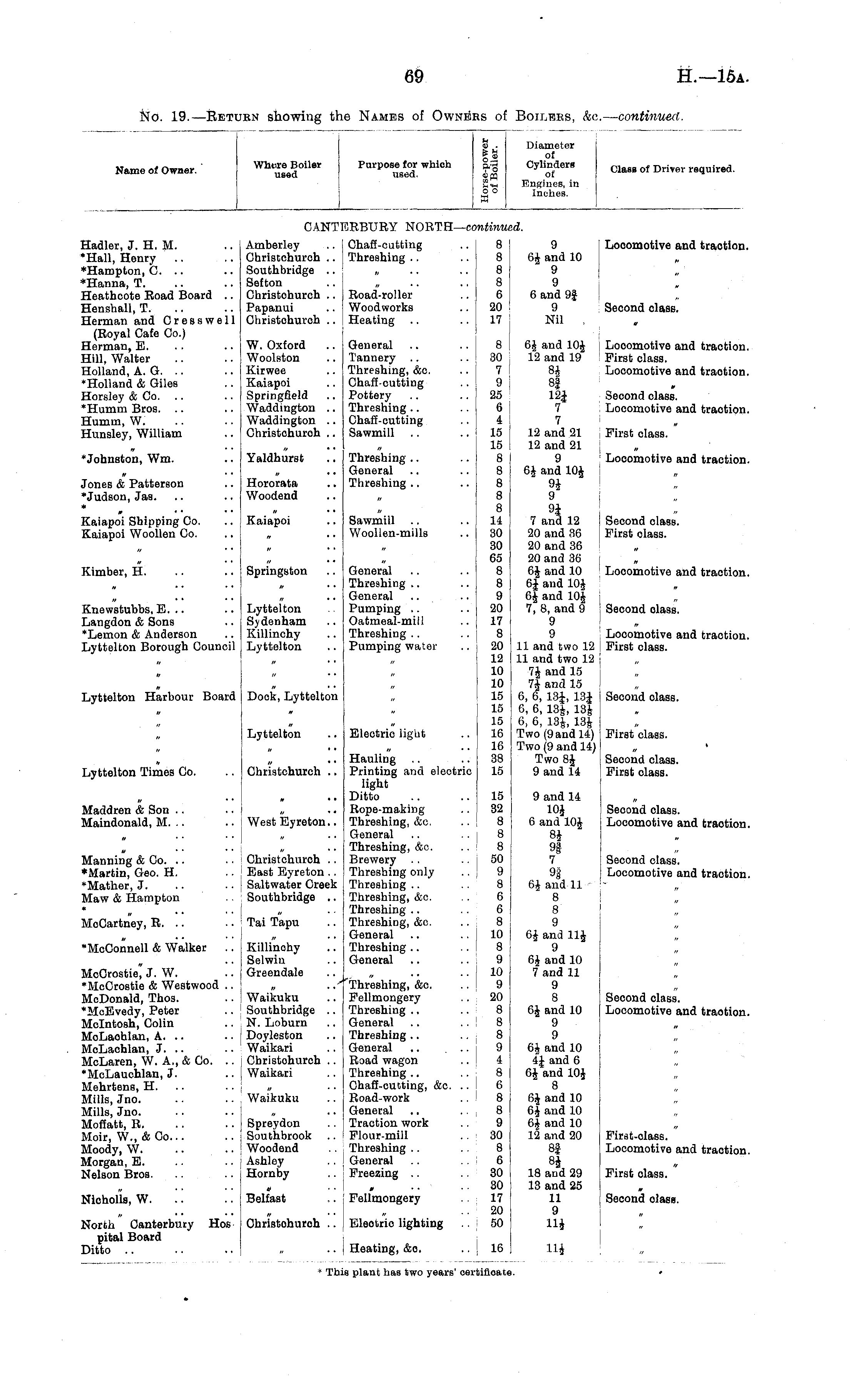 Name of Owner. Whore Boiler used Purpose for which used. u II «?q o"o X Diameter of Cylinders of Engines, in Inches. Class of Driver required. CANT! [5RBURY NORTH— continui id. Hadler, J. H. M. ♦Hall, Henry ♦Hampton, C. .. *Hanna, T. Heathcote Road Board .. Henshall, T. Herman and Cress well (Royal Cafe Co.) Herman, E. Hill, Walter Holland, A. G. .. •Holland & Giles Horsley & Co. .. "Hurnm Bros. Humm, W. Hunsley, William Amberley Ghristchuroh .. Southbridge .. Sefton Christchurch .. Papanui Christehuroh .. I Chaff-cutting .. [ 8 | I Threshing .. .. 8 „ .. .. 8 8 Road-roller .. 6 Woodworks .. 20 Heating .. .. 17 9 Looomotive and traction 6J and 10 9 9 6 and 9| 9 Second class. Nil •Johnston, Wm. Jones & Patterson •Judson, Jas. id * Kaiapoi Shipping Co. Kaiapoi Woollen Co. W. Oxford Woolston Kirwee Kaiapoi Springfield Waddington .. Waddington .. Christohuroh .. Yaldhurst Hororata Woodend Kaiapoi Springston General .. .. 8 Tannery .. .. 30 Threshing, &c. .. 7 Chaff-cutting .. 9 Pottery .. .. '■■ 25 Threshing.. .. 6 Chaff-cutting .. 4 Sawmill .. .. 15 15 Threshing .. .. 8 General .. .. 8 Threshing .. .. 8 8 8 Sawmill .. .. 14 Woollen-mills .. 30 30 65 General .. .. 8 Threshing .. .. 8 General .. .. 9 Pumping .. .. 20 Oatmeal-mill .. j 17 Threshing .. .. | 8 Pumping water ... 20 12 10 10 15 i 15 15 Electric light .. 16 ..16 Hauling .. .. 38 Printing and electric 15 light Ditto .. .. 15 Rope-making .. 32 Threshing, &c. ... 8 General .. .. 8 Threshing, &c. .. 8 Brewery .. .. j 50 Threshing only .. 9 Threshing .. .. 8 Threshing, &c. . . 6 Threshing .. .. 6 Threshing, &c. .. 8 General .. .. ! 10 Threshing .. .. 8 General .. .. 9 i 10 ' Threshing, &c. .. 9 Fellmongery .. 20 Threshing .. .. 8 General .. .. ! 8 Threshing .. .. 8 General .. ... 9 Road wagon .. 4 Threshing.. .. 8 Chaff-cutting, &c. .. 6 Road-work .. 8 General .. .. 8 Traction work .. 9 i Flour-mill .. 30 Threshing .. .. 8 General .. .. 6 Freezing .. .. 30 30 Fellmongery .. 17 20 Eleotrio lighting . . 50 6£ and 10J j Looomotive and traction 12 and 19 First class. 8h Locomotive and traotion 8| 12J Second class. 7 , Locomotive and traotion 7 12 and 21 I First class. 12 and 21 9 ' Locomotive and traction 6J and 10j i 9J 9 7 and 12 j Second class. 20 and 36 ' First olass. 20 and 36 20 and 36 6J and 10 ' Locomotive and traotion 6j and 10J 6| and 10J ; 7, 8, and 9 I Second olass. 9 9 Looomotive and traotion 11 and two 12 j First class. 11 and two 12 7* and 15 7| and 15 6, 6, 13i, 13J Second class. 6, 6, 13J, 13| 6, 6, 13J, 13§ Two (9 and 14) First olass. Two (9 and 14) Two 8J I Second class. 9 and 14 ! First class. Kimber, H. Knewstubbs, E. .. Langdon & Sons 'Lemon & Anderson Lyttelton Borough Council Lyttelton Sydenham Killinchy Lyttelton Lyttelton Harbour Board Dook, Lyttelton Lyttelton Lyttelton Times Co. Chriatchurch .. Maddren & Son Maindonald, M. .. Manning & Co. ♦Martin, Geo. H. •Mather, J. Maw & Hampton MoCartney, R. .. •McConnell & Walker .. McCrostie, J. W. •McCrostie & Westwood .. McDonald, Thos. *MoEvedy, Peter Mclntosh, Colin MoLaohlan, A. .. MoLachlan, J. .. McLaren, W. A., & Co. .. •McLauchlan, J. Mehrtens, H. .. Mills, Jno. Mills, Jno. Moffatt, R. Moir, W., & Co... Moody, W. Morgan, E. Nelson Bros. West Eyreton.. Christehuroh .. East Eyreton.. Saltwater Creek Southbridge .. Tai Tapu Killinohy Selwiu Greendale Waikuku Southbridge .. N. Loburn Doyleston Waikari Christohuroh .. Waikari 9 and 14 10} Second class. 6 and 10J Looomotive and traotion 8J 9| 7 Second olass. 9g Looomotive and traction 6£ and 11 8 8 9 6£ and 11J 9 6J and 10 7 and 11 9 8 Second class. 6J and 10 Locomotive and traotion 9 9 6J and 10 4£ and 6 6J and 10J 64 and 10 6J and 10 6£ and 10 12 and 20 Firat-class. 8| Locomotive and traotion 18 and 29 First olass. 13 and 25 11 ! Second olass. 9 Hi Waikuku Spreydon Southbrook Woodend Ashley Hornby Nicholls, W. Belfast North Canterbury Hos pital Board Ditto .. Ohristohuroh .. j Heating, &o. .. J 16 is plant has two years' certificate 14 *Thi I. *