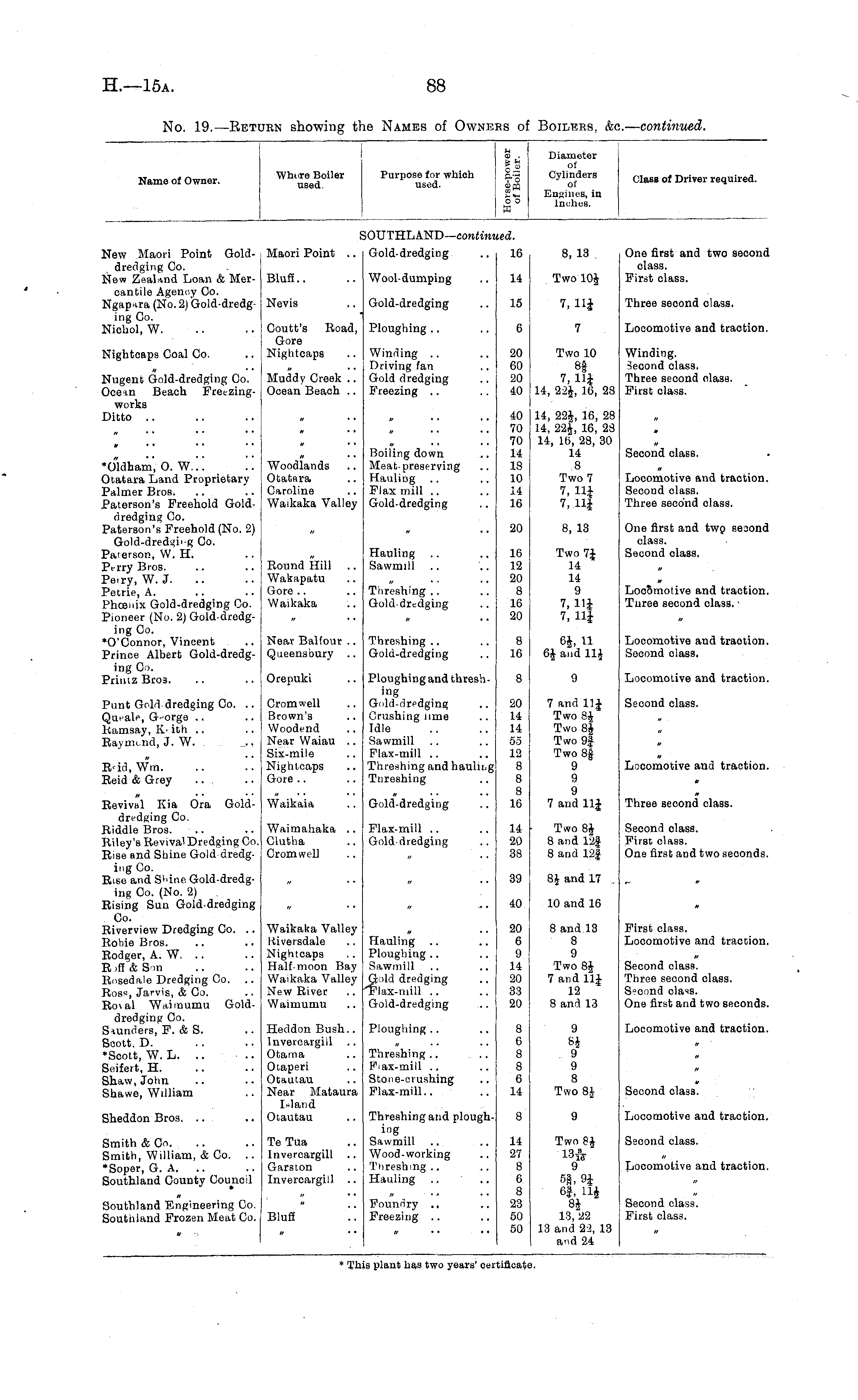 Name of Owner. Whure Boiler used. Purpose for which used. I *?* o I 0*0 Diameter of Cylinders of Engines, in Inches. Class of Driver required. iOUTHL AND— contini ',ed. New Maori Point Golddredging Co. New Zealand Loan & Mercantile Agency Go. Ngapura (No. 2) Gold-dredg-ing Co. Nichol, W. Maori Point .. Gold-dredging 16 8, 13 One first and two second class. First class. Bluff.. Wool-dumping 14 Two 10J Nevis Gold-dredging 15 7, Hi Three second class. Coutt's Road, Gore Nightcaps Ploughing 6 7 Locomotive and traction. Nightcaps Coal Co. Nugent Gold-dredging Co. Deem Beach Freezingworks Ditto .. Muddy Creek .. Ocean Beach .. Winding Driving fan Gold dredging Freezing .. 20 60 20 40 Two 10 8S 7, 11J 14, 22J, 16, 28 Winding. -Second class. Three second nlasa. First class. •o'idham, O. W... Dtatara Land Proprietary Palmer Bros. Paterson's Freehold Golddredging Co. Paterson's Freehold (No. 2) Gold-dred»i> g Co. Paierson, W. H. Perry Bros. Perry, W. J. Petrie, A. Phcenix Gold-dredging Co. Pioneer (No. 2) Gold-dredg-ing Co. •O'Connor, Vincent Prince Albert Gold-dredg-ing Co. Printz Bro3. Woodlands Otatara Caroline Waikaka Valley a •» . • Boiling down Meat-preserving Hauling Flax mill .. Gold-dredging 40 70 70 14 18 10 14 16 14, 22J, 16, 28 14, 22£, 16, 28 14, 16, 28, 30 14 8 Two 7 7, 11J 7, 11J Second class. Locomotive and traction. Second class. Three second class. 20 8, 13 One first and two second class. Second class. Round Hill .. Wakapatu Gore Waikaka Hauling Sawmill Threshing Gold-dredging 16 12 20 8 16 20 Two 7J 14 14 9 7, 11J 7,111 Loob'motive and traction. Tnree second class. Near Balfour .. Queensbury .. Threshing Gold-dredging 8 16 6J, 11 6J and 11$ Locomotive and traction. Second class. Orepuki Ploughingand threshing Gold-dredging Crushing lime Idle Sawmill Flax-mill Threshing and haulit.g Tnreshing 8 9 Locomotive and traction. Pont Gold dredging Co. .. Qucalp, George .. kamsay, Iv ith .. Raymcnd, J. W. Cromwell Brown's Woodend Near Waiau .. Six-mile Nightcaps Gore 20 14 14 55 12 8 8 8 16 7 and 11J Two Si Two 8 J Two 9| Two 8f 9 9 9 7 and 111 Second class. E'id.Wra. Reid & Grey Locomotive and traction. u Revival Kia Ora Golddredging Co. Riddle Bros. Riley's Revival Dredging Co. Rise and Shine Gold dredging Co. Rise and SMne Gold-dredg-ing Co. (No. 2) Rising Sun Gold-dredging Co. Riverview Dredging Co. .. Robie Bros. Rodger, A. W. .. R >ff & Son Rosedale Dredging Co. .. Ross, Jarvis, & Co. Ro\al Waimumu Golddredging Co. Suinders, F. & S. Scott, D. •Scott, W. L. .. 3eifert, H. Shaw,John Shawe, William Waikaia Gold-dredging Three second class. Waimahaka .. Clutha Cromwell Flax-mill Gold-dredging 14 20 38 Two 8J 8 and 12| 8 and 12j Second class. First class. One first and two seconds. 39 8$ and 17 *- * 40 10 and 16 Waikaka Valley Kiversdale Nightcaps Half-moon Bay Waikaka Valley New River Waimumu Hauling Ploughing Sawmill Gold dredging "Flax-mill Gold-dredging 20 6 9 14 20 33 20 8 and 13 8 9 Two 8J 7 and 111 12 8 and 13 First class. Locomotive and traction. Second class. Three second class. Second class. One first and two seconds. Heddon Bush.. Invercargill Otarna Otaperi Otautau Near Mataura Island Otautau Ploughing 8 6 8 8 6 14 9 8J 9 9 8 Locomotive and traction. Threshing .. Fiax-mill .. Stone-crushing Flax-mill.. Two 8$ Second class. Sneddon Bros. ... Threshing and ploughing Sawmill Wood-working Threshing Hauling 8 9 Locomotive and traction. Smith & Co. Smith, William, & Co. .. •Soper, G. A. .. Southland County Council Te Tua Invercargill Garston Invercargill 14 27 8 6 8 23 50 50 Two e$ 13* 9 58, 9J 6}, Hi 81 13,22 13 and 22, 13 and 24 Second class. Locomotive and traction. u Southland Engineering Co. Southland Frozen Meat Co. Foundry .. Freezing Second class. First class. Bluff a 'liis ilant h, ,s two -ears' certiflcal ie.
