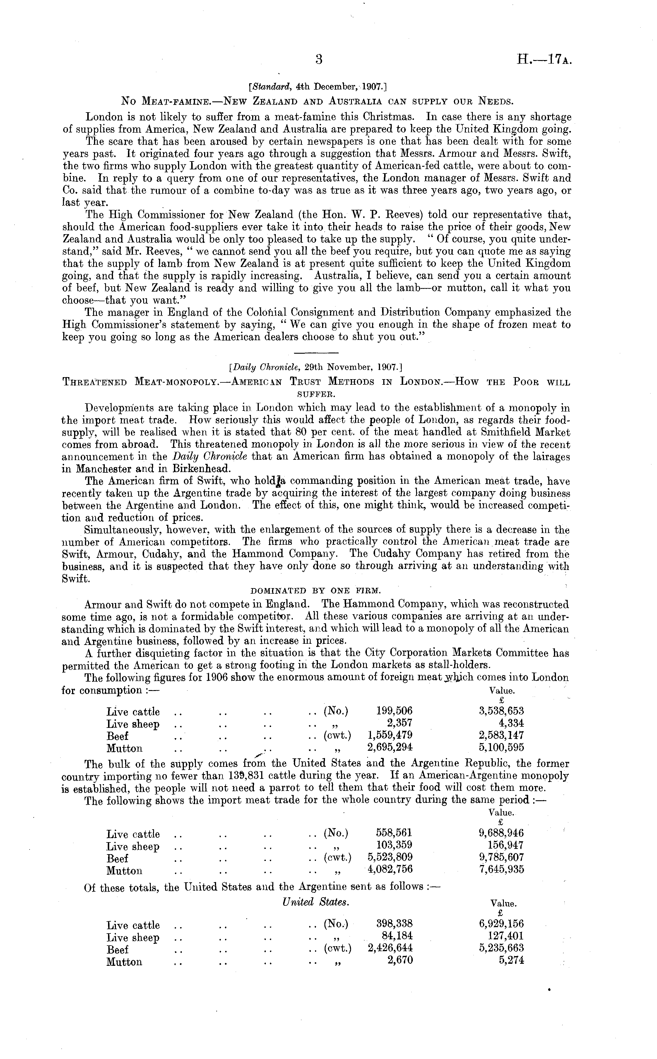 [Standard, 4th December, 1907.] No Meat-famine. —New Zealand and Australia can supply our Needs. London is not likely to suffer from a meat-famine this Christmas. In case there is any shortage of supplies from America, New Zealand and Australia are prepared to keep the United Kingdom going. The scare that has been aroused by certain newspapers is one that has been dealt with for some years past. It originated four years ago through a suggestion that Messrs. Armour and Messrs. Swift, the two firms who supply London with the greatest quantity of American-fed cattle, were about to combine. In reply to a query from one of our representatives, the London manager of Messrs. Swift and Co. said that the rumour of a combine to-day was as true as it was three years ago, two years ago, or last year. The High Commissioner for New Zealand (the Hon. W. P. Reeves) told our representative that, should the American food-suppliers ever take it into their heads to raise the price of their goods, New Zealand and Australia would be only too pleased to take up the supply. "Of course, you quite understand," said Mr. Reeves, " we cannot send you all the beef you require, but you can quote me as saying that the supply of lamb from New Zealand is at present quite sufficient to keep the United Kingdom going, and that the supply is rapidly increasing. Australia, I believe, can send you a certain amount of beef, but New Zealand is ready and willing to give you all the lamb—or mutton, call it what you choose —that you want." The manager in England of the Colonial Consignment and Distribution Company emphasized the High Commissioner's statement by saying, " We can give you enough in the shape of frozen meat to keep you going so long as the American dealers choose to shut you out." [Daily Chronicle, 29th November, 1907.] Threatened Meat-monopoly.—American Trust Methods in London.—How the Poor will SUFFER. Developments are taking place in London which may lead to the establishment of a monopoly in the import meat trade. How seriously this would affect the people of Loudon, as regards their foodsupply, will be realised when it is stated that 80 per cent, of the meat handled at Smithfield Market comes from abroad. This threatened monopoly in London is all the more serious in view of the recent announcement in the Daily Chronicle that an American firm has obtained a monopoly of the lairages in Manchester and in Birkenhead. The American firm of Swift, who holdjja commanding position in the American meat trade, have recently taken up the Argentine trade by acquiring the interest of the largest company doing business between the Argentine and London. The effect of this, one might think, would be increased competition and reduction of prices. Simultaneously, however, with the enlargement of the sources of supply there is a decrease in the number of American competitors. The firms who practically control the American meat trade are Swift, Armour, Cudahy, and the Hammond Company. The Cudahy Company has retired from the business, and it is suspected that they have only done so through arriving at an understanding with Swift. DOMINATED BY ONE FIRM. Armour and Swift do not compete in England. The Hammond Company, which was reconstructed some time ago, is not a formidable competitor. All these various companies are arriving at an understanding which is dominated by the Swift interest, and which will lead to a monopoly of all the American and Argentine business, followed by an increase in prices. A further disquieting factor in the situation is that the City Corporation Markets Committee has permitted the American to get a strong footing in the London markets as stall-holders. The following figures for 1906 show the enormous amount of foreign meat which comes into London for consumption : — Value. £ Live cattle .. .. .. .. (No.) 199,506 3,538,653 Live sheep „ 2,357 4,334 Beef ..' .. •• •• (cwt.) 1,559,479 2,583,147 Mutton .. .. ... .. „ 2,695,294 5,100,595 The bulk of the supply comes from the United States and the Argentine Republic, the former country importing no fewer than 139,831 cattle during the year. If an American-Argentine monopoly is established, the people will not need a parrot to tell them that their food will cost them more. The following shows the import meat trade for the whole country during the same period : — Value. £ Live cattle .. .. .. •. (No.) 558,561 9,688,946 Live sheep „ 103,359 156,947 Beef .. .. •• •• (cwt.) 5,523,809 9,785,607 Mutton „ 4,082,756 7,645,935 Of these totals, the United States and the Argentine sent as follows : — United States. Value. £ Live cattle (No.) 398,338 6,929,156 Live sheep „ 84,184 127,401 Beef .. •• •• ■• (cwt.) 2,426,644 5,235,663 Mutton „ 2,670 5,274