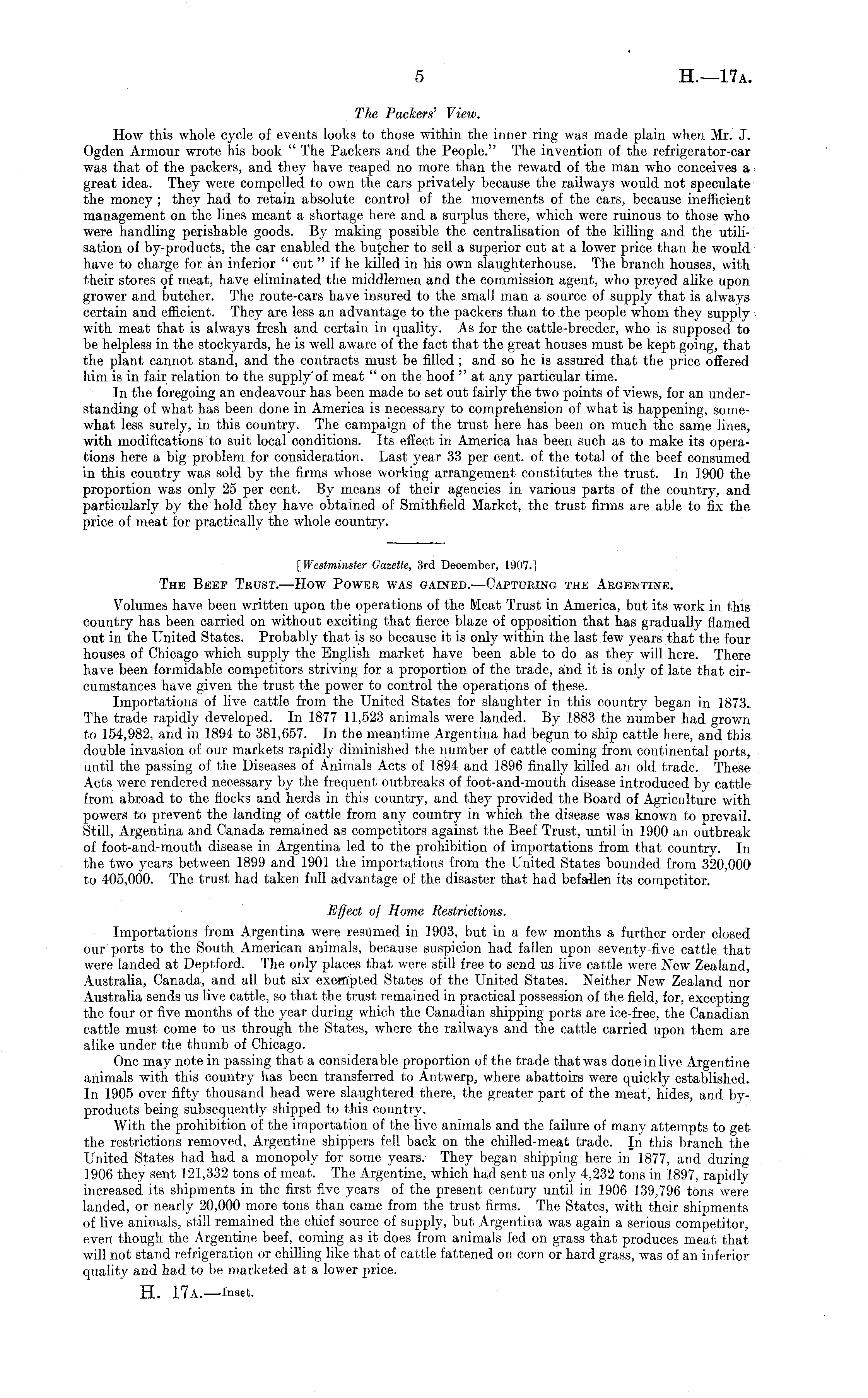 The Packers' View. How this whole cycle of events looks to those within the inner ring was made plain when Mr. J. Ogden Armour wrote his book " The Packers and the People." The invention of the refrigerator-car was that of the packers, and they have reaped no more than the reward of the man who conceives a great idea. They were compelled to own the cars privately because the railways would not speculate the money ; they had to retain absolute control of the movements of the cars, because inefficient management on the lines meant a shortage here and a surplus there, which were ruinous to those who were handling perishable goods. By making possible the centralisation of the killing and the utilisation of by-products, the car enabled the butcher to sell a superior cut at a lower price than he would have to charge for an inferior " cut" if he killed in his own slaughterhouse. The branch houses, with their stores of meat, have eliminated the middlemen and the commission agent, who preyed alike upon grower and butcher. The route-cars have insured to the small man a source of supply that is always certain and efficient. They are less an advantage to the packers than to the people whom they supply with meat that is always fresh and certain in quality. As for the cattle-breeder, who is supposed to be helpless in the stockyards, he is well aware of the fact that the great houses must be kept going, that the plant cannot stand, and the contracts must be filled; and so he is assured that the price offered him is in fair relation to the supply'of meat "on the hoof "at any particular time. In the foregoing an endeavour has been made to set out fairly the two points of views, for an understanding of what has been done in America is necessary to comprehension of what is happening, somewhat less surely, in this country. The campaign of the trust here has been on much the same lines, with modifications to suit local conditions. Its effect in America has been such as to make its operations here a big problem for consideration. Last year 33 per cent, of the total of the beef consumed in this country was sold by the firms whose working arrangement constitutes the trust. In 1900 the proportion was only 25 per cent. By means of their agencies in various parts of the country, and particularly by the hold they have obtained of Smithfield Market, the trust firms are able to fix the price of meat for practically the whole country. [Westminster Gazette, 3rd December, 1907.] The Beef Trust. —How Power was cained. —Capturing the Aroeintine. Volumes have been written upon the operations of the Meat Trust in America, but its work in this country has been carried on without exciting that fierce blaze of opposition that has gradually flamed out in the United States. Probably that is so because it is only within the last few years that the four houses of Chicago which supply the English market have been able to do as they will here. There have been formidable competitors striving for a proportion of the trade, and it is only of late that circumstances have given the trust the power to control the operations of these. Importations of live cattle from the United States for slaughter in this country began in 1873. The trade rapidly developed. In 1877 11,523 animals were landed. By 1883 the number had grown to 154,982, and in 1894 to 381,657. In the meantime Argentina had begun to ship cattle here, and this double invasion of our markets rapidly diminished the number of cattle coming from continental ports, until the passing of the Diseases of Animals Acts of 1894 and 1896 finally killed an old trade. These Acts were rendered necessary by the frequent outbreaks of foot-and-mouth disease introduced by cattle from abroad to the flocks and herds in this country, and they provided the Board of Agriculture with powers to prevent the landing of cattle from any country in which the disease was known to prevail. Still, Argentina and Canada remained as competitors against the Beef Trust, until in 1900 an outbreak of foot-and-mouth disease in Argentina led to the prohibition of importations from that country. In the two years between 1899 and 1901 the importations from the United States bounded from 320,000 to 405,000. The trust had taken full advantage of the disaster that had befallen its competitor. Effect of Home Restrictions. Importations from Argentina were resumed in 1903, but in a few months a further order closed our ports to the South American animals, because suspicion had fallen upon seventy-five cattle that were landed at Deptford. The only places that were still free to send us live cattle were New Zealand, Australia, Canada, and all but six exempted States of the United States. Neither New Zealand nor Australia sends us live cattle, so that the trust remained in practical possession of the field, for, excepting the four or five months of the year during which the Canadian shipping ports are ice-free, the Canadian cattle must come to us through the States, where the railways and the cattle carried upon them are alike under the thumb of Chicago. One may note in passing that a considerable proportion of the trade that was done in live Argentine animals with this country has been transferred to Antwerp, where abattoirs were quickly established. In 1905 over fifty thousand head were slaughtered there, the greater part of the meat, hides, and byproducts being subsequently shipped to this country. With the prohibition of the importation of the live animals and the failure of many attempts to get the restrictions removed, Argentine shippers fell back on the chilled-meat trade. In this branch the United States had had a monopoly for some years. They began shipping here in 1877, and during 1906 they sent 121,332 tons of meat. The Argentine, which had sent us only 4,232 tons in 1897, rapidly increased its shipments in the first five years of the present century until in 1906 139,796 tons were landed, or nearly 20,000 more tons 