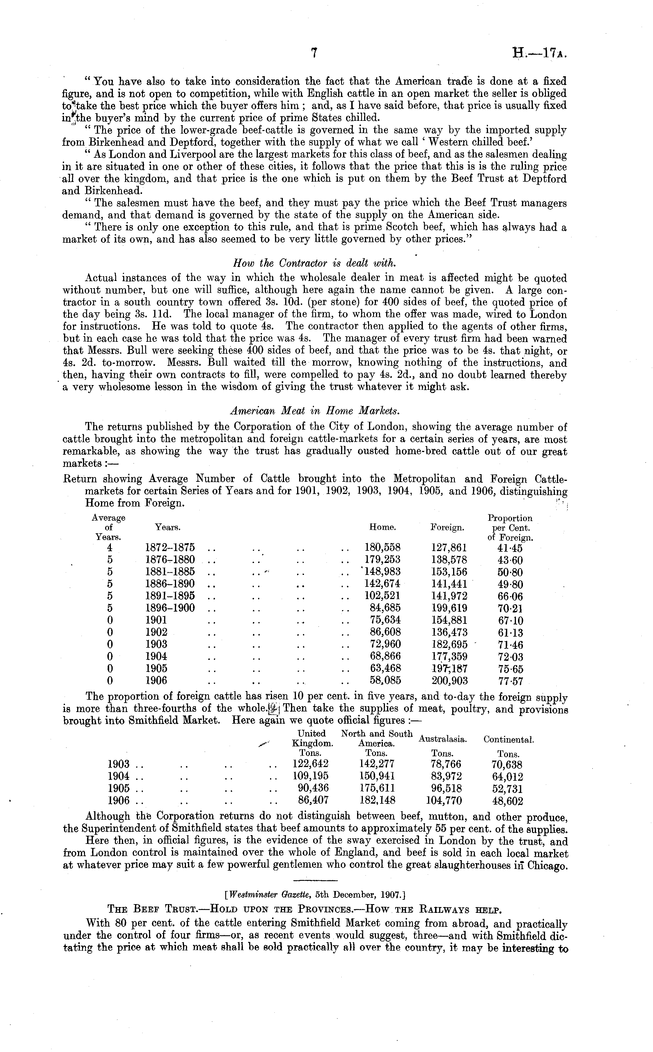 " You have also to take into consideration the fact that the American trade is done at a fixed figure, and is not open to competition, while with English cattle in an open market the seller is obliged to/take the best price which the buyer offers him ; and, as I have said before, that price is usually fixed buyer's mind by the current price of prime States chilled. " The price of the lower-grade beef-cattle is governed in the same way by the imported supply from Birkenhead and Deptford, together with the supply of what we call ' Western chilled beef.' " As London and Liverpool are the largest markets for this class of beef, and as the salesmen dealing in it are situated in one or other of these cities, it follows that the price that this is is the ruling price all over the kingdom, and that price is the one which is put on them by the Beef Trust at Deptford and Birkenhead. " The salesmen must have the beef, and they must pay the price which the Beef Trust managers demand, and that demand is governed by the state of the supply on the American side. " There is only one exception to this rule, and that is prime Scotch beef, which has always had a market of its own, and has also seemed to be very little governed by other prices." How the Contractor is dealt with. Actual instances of the way in which the wholesale dealer in meat is affected might be quoted without number, but one will suffice, although here again the name cannot be given. A large contractor in a south country town offered 3s. lOd. (per stone) for 400 sides of beef, the quoted price of the day being 3s. lid. The local manager of the firm, to whom the offer was made, wired to London for instructions. He was told to quote 4s. The contractor then applied to the agents of other firms, but in each case he was told that the price was 4s. The manager of every trust firm had been warned that Messrs. Bull were seeking these 400 sides of beef, and that the price was to be 4s. that night, or 4s. 2d. to-morrow. Messrs. Bull waited till the morrow, knowing nothing of the instructions, and then, having their own contracts to fill, were compelled to pay 4s. 2d., and no doubt learned thereby a very wholesome lesson in the wisdom of giving the trust whatever it might ask. American Meat in Home Markets. The returns published by the Corporation of the City of London, showing the average number of cattle brought into the metropolitan and foreign cattle-markets for a certain series of years, are most remarkable, as showing the way the trust has gradually ousted home-bred cattle out of our great markets: — Return showing Average Number of Cattle brought into the Metropolitan and Foreign Cattlemarkets for certain Series of Years and for 1901, 1902, 1903, 1904, 1905, and 1906, distinguishing Home from Foreign. '-' > \ Average Proportion of Years. Home. Foreign. per Cent. Years. of Foreign. 4 1872-1875 .. .. .. .. 180,558 127,861 41-45 5 1876-1880 .. ..' .. .. 179,253 138,578 43-60 5 1881-1885 .. .. .. .. 148,983 153,156 50-80 5 1886-1890 .. .. .. .. 142,674 141,441 49-80 5 1891-1895 .. .. .. .. 102,521 141,972 6606 5 1896-1900 .. .. .. .. 84,685 199,619 70-21 0 1901 .. .. .. .. 75,634 154,881 6710 0 1902 .. .. .. .. 86,608 136,473 6113 0 1903 .. .. .. .. 72,960 182,695 71-46 0 1904 .. .. .. .. 68,866 177,359 72-03 0 1905 .. .. .. .. 63,468 197,187 75-65 0 1906 .. .. 58,085 200,903 77-57 The proportion of foreign cattle has risen 10 per cent, in five years, and to-day the foreign supply is more than three-fourths of the whole.te-i Then take the supplies of meat, poultry, and provisions brought into Smithfield Market. Here again we quote official figures : — United North and South .... „ . . Kingdom. America. Australasia. Continental. Tons. Tons. Tons. Tons. 1903 .. .. .. .. 122,642 142,277 78,766 70,638 1904 .. .. .. .. 109,195 150,941 83,972 64,012 1905 .. .. .. .. 90,436 175,611 96,518 52,731 1906.. .. .. .. 86,407 182,148 104,770 48,602 Although the Corporation returns do not distinguish between beef, mutton, and other produce, the Superintendent of Smithfield states that beef amounts to approximately 55 per cent, of the supplies. Here then, in official figures, is the evidence of the sway exercised in London by the trust, and from London control is maintained over the whole of England, and beef is sold in each local market at whatever price may suit a few powerful gentlemen who control the great slaughterhouses in Chicago. [Westminster Gazette, sth December, 1907.] The Beef Trust. —Hold upon the Provinces. —How the Railways help. With 80 per cent, of the cattle entering Smithfield Market coming from abroad, and practically under the control of four firms —or, as recent events would suggest, three—and with Smithfield dictating the price at which meat shall be sold practically all over the country, it may be interesting to