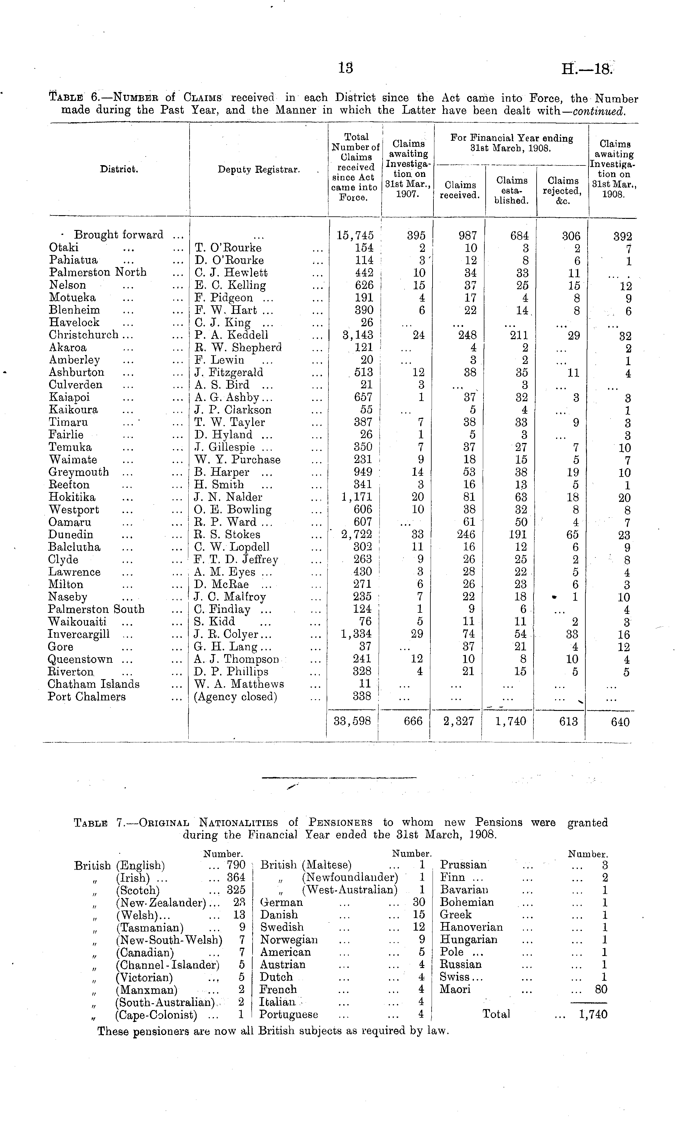 Deputy Registrar. Total J Number of Claims ' received sioce Act came into Force. Claims awaiting Investigation on 31st Mar., 1907. For Financial Yeai 31et March, IS Claims Claims received. , , es , a \ unshed. c ending 108. Claims awaiting Investigation on 31st Mar., 1908. Distriot. Claims rejected, &c. • Brought forward ... Otaki Pahiatua Palmerston North Nelson Motueka Blenheim Havelock Christchurch ... Akaroa Amberley Ashburton Culverden Kaiapoi Kaikoura Timaru ... ' Fairlie Temuka Waimate Greymouth ... Beef ton Hokitika Westport Oamaru Dunedin Balclutha Clyde Lawrence Milton Naseby Palmerston South Waikouaiti Inveroargill ... T. O'Eourke D. O'Eourke C. J. Hewlett B. C. Kelling F. Pidgeon ... F. W. Hart ... C. J. King ... P. A. Keddell E. W. Shepherd F. Lewin J. Fitzgerald A. S. Bird ... A. G. Ashby... J. P. Clarkson T. W. Tayler D. Hyland ... J. Gillespie ... W. Y. Purchase B. Harper ... H. Smith ... J. N. Nalder O. E. Bowling E. P. Ward ... E. S. Stokes C. W. Lopdell F. T. D. Jeffrey A. M. Byes ... D. McEae ... J. C. Malfroy C. Findlay ... S. Kidd " ... J. E. Colyer... G. H. Lang... A. J. Thompson D. P. Phillips W. A. Matthews (Agency closed) 15,745 154 114 442 626 191 390 26 3,143 121 20 513 21 657 55 387 26 : 350 231 949 341 1,171 606 607 ' 2,722 302 263 430 271 235 124 76 1,334 37 241 328 11 i 338 ' 395 2 o 10 15 4 6 24 12 3 1 7 1 7 9 14 3 20 10 33 11 9 3 6 7 1 5 29 12 4 987 10 12 34 37 17 22 248 4 3 38 37 5 38 5 37 18 53 16 81 38 61 246 16 26 28 26 22 9 11 74 37 10 21 684 3 8 33 25 4 14 211 2 2 35 3 32 4 33 3 27 15 38 13 63 32 50 191 12 25 22 23 18 6 11 54 21 8 15 306 2 6 11 15 8 8 "29 11 3 9 392 7 1 12 9 6 32 2 1 4 3 1 3 3 10 7 10 1 20 8 7 23 9 8 4 3 10 4 3 16 12 4 5 7 5 19 5 18 8 4 65 6 2 5 6 * 1 Gore 2 33 4 10 5 Queenstown ... Biverton Chatham Islands Port Chalmers v 33,598 666 2,327 1,740 613 640 I