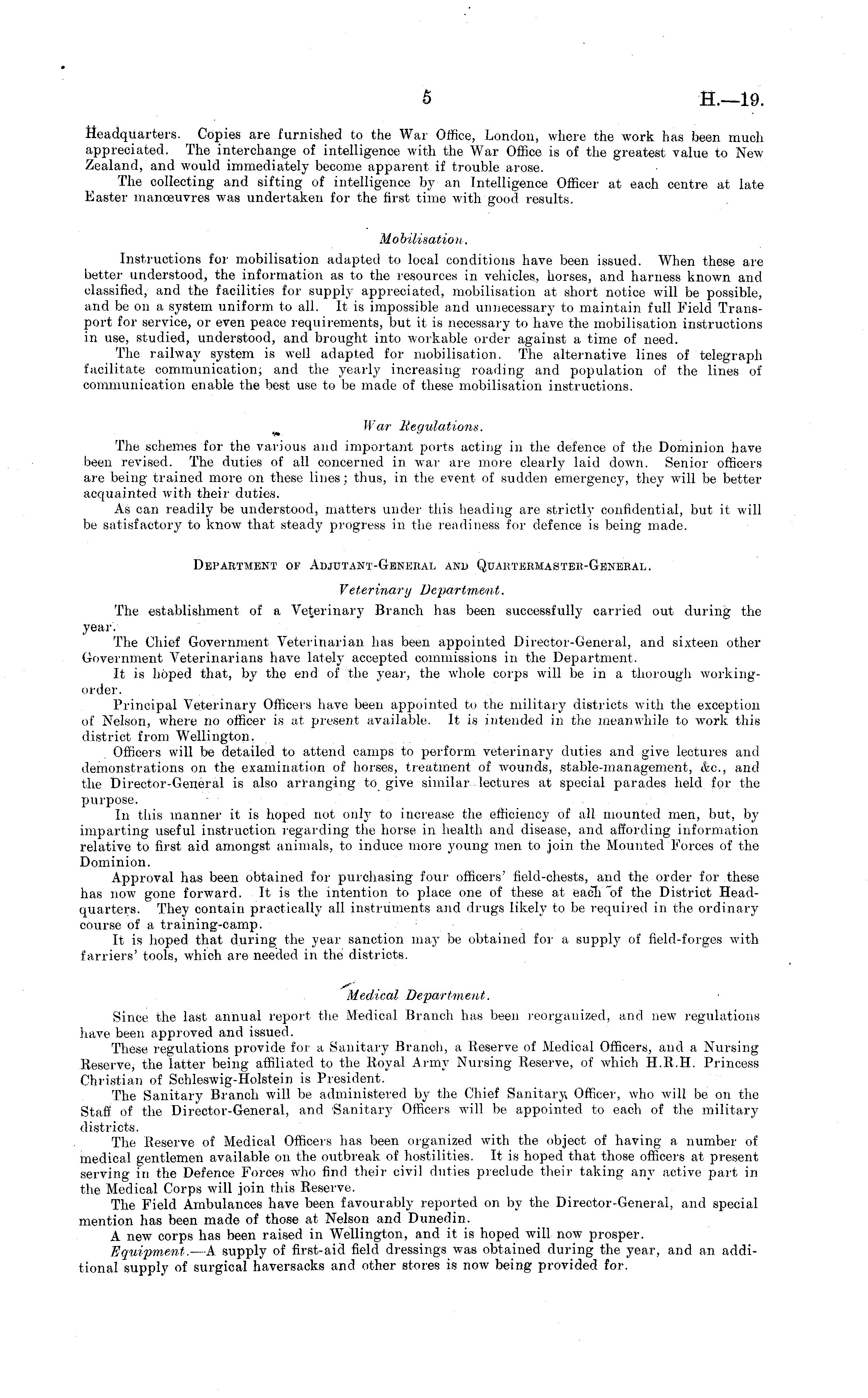 Headquarters. Copies are furnished to the War Office, London, where the work has been much appreciated. The interchange of intelligence with the War Office is of the greatest value to New Zealand, and would immediately become apparent if trouble arose. The collecting and sifting of intelligence by an Intelligence Officer at each centre at late Easter manoeuvres was undertaken for the first time with good results. Mobilisation. Instructions for mobilisation adapted to local conditions have been issued. When these are better understood, the information as to the resources in vehicles, horses, and harness known and classified, and the facilities for supply appreciated, mobilisation at short notice will be possible, and be on a system uniform to all. It is impossible and unnecessary to maintain full Field Transport for service, or even peace requirements, but it is necessary to have the mobilisation instructions in use, studied, understood, and brought into workable order against a time of need. The railway system is well adapted for mobilisation. The alternative lines of telegraph facilitate communication, and the yearly increasing roading and population of the lines of communication enable the best use to be made of these mobilisation instructions. War Regulations. The schemes for the various and important ports acting in the defence of the Dominion have been revised. The duties of all concerned in war are more clearly laid down. Senior officers are being trained more on these lines; thus, in the event of sudden emergency, they will be better acquainted with their duties. As can readily be understood, matters under this heading are strictly confidential, but it will be satisfactory to know that steady progress in the readiness for defence is being made. Department of Adjutant-General anu Quartermaster-General. Veterinary Department. The establishment of a Veterinary Branch has been successfully carried out during the year. The Chief Government Veterinarian has been appointed Director-General, and sixteen other Government Veterinarians have lately accepted commissions in the Department. It is hoped that, by the end of the year, the whole corps will be in a thorough workingorder. Principal Veterinary Officers have been appointed to the military districts with the exception of Nelson, where no officer is at present available. It is intended in the meanwhile to work this district from Wellington. Officers will be detailed to attend camps to perform veterinarj- duties and give lectures and demonstrations on the examination of horses, treatment of wounds, stable-management, &c, and the Director-General is also arranging to give similar lectures at special parades held for the purpose. In this manner it is hoped not only to increase the efficiency of all mounted men, but, by imparting useful instruction regarding the horse in health and disease, and affording information relative to first aid amongst animals, to induce more young men to join the Mounted Forces of the Dominion. Approval has been obtained for purchasing four officers' field-chests, and the order for these has now gone forward. It is the intention to place one of these at each of the District Headquarters. They contain practically all instruments and drugs likely to be required in the ordinary course of a training-camp. It is hoped that during the year sanction may be obtained for a supply of field-forges with farriers' tools, which are needed in the districts. y Medi col Department. Since the last annual report the Medical Branch has been reorganized, and new regulations have been approved and issued. These regulations provide for a Sanitary Branch, a Reserve of Medical Officers, and a Nursing Reserve, the latter being affiliated to the Royal Army Nursing Reserve, of which H.R.H. Princess Christian of Schleswig-Holstein is President. The Sanitary Branch will be administered by the Chief Sanitary, Officer, who will be on the Staff of the Director-General, and Sanitary Officers will be appointed to each of the military districts. The Reserve of Medical Officers has been organized with the object of having a number of medical gentlemen available on the outbreak of hostilities. It is hoped that those officers at present serving in the Defence Forces who find their civil duties preclude their taking any active part in the Medical Corps will join this Reserve. The Field Ambulances have been favourably reported on by the Director-General, and special mention has been made of those at Nelson and Dunedin. A new corps has been raised in Wellington, and it is hoped will now prosper. Equipment. —A supply of first-aid field dressings was obtained during the year, and an additional supply of surgical haversacks and other stores is now being provided for.