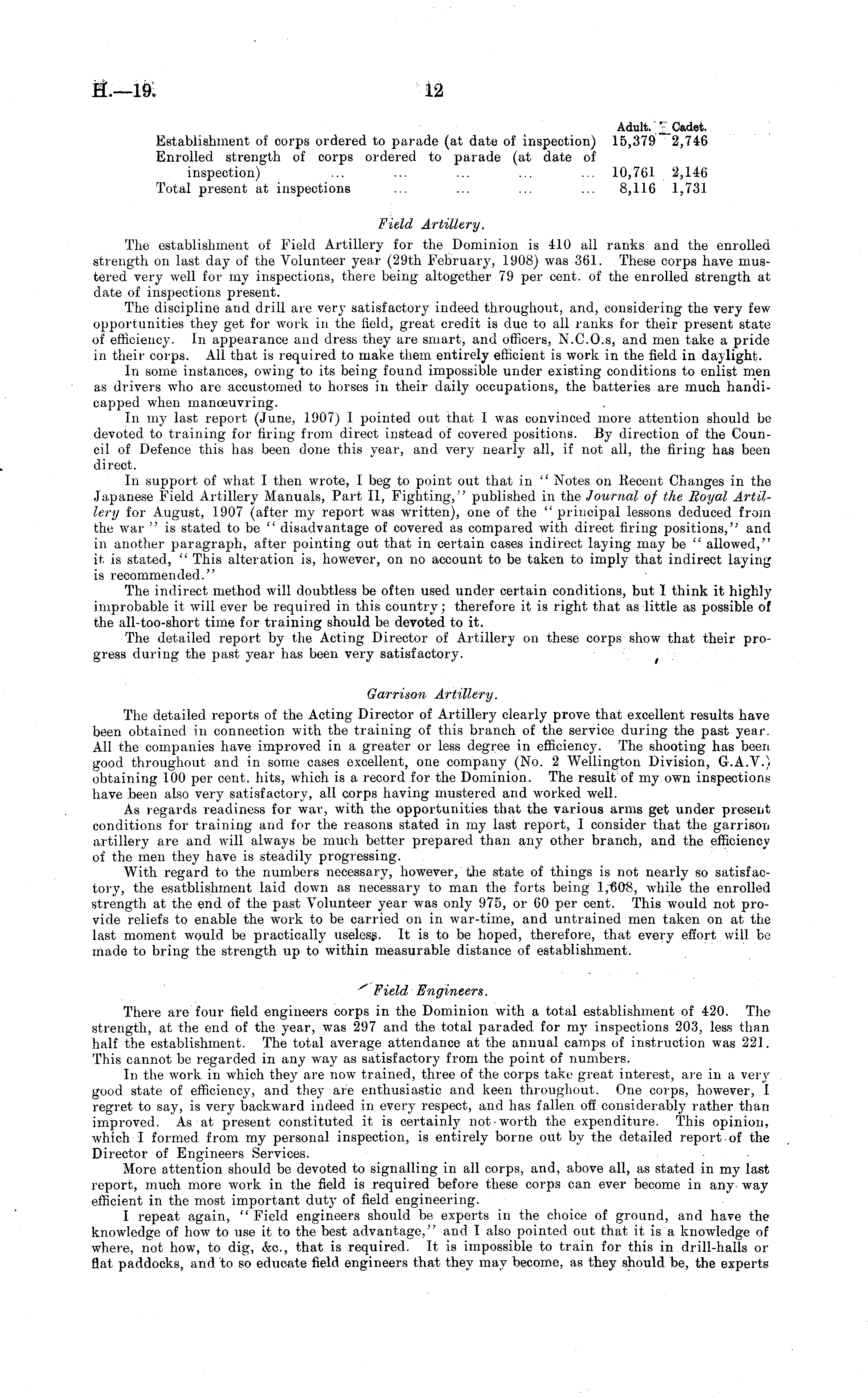Adult. Cadet. Establishment of corps ordered to parade (at date of inspection) 15,379 2,746 Enrolled strength of corps ordered to parade (at date of inspection) ... ... ... ... ... 10,761 2,146 Total present at inspections ... ... ... ... 8,116 1,731 Field Artillery. The establishment of Field Artillery for the Dominion is 410 all ranks and the enrolled strength on last day of the Volunteer year (29th February, 1908) was 361. These corps have mustered very well for my inspections, there being altogether 79 per cent, of the enrolled strength at date of inspections present. The discipline and drill are very satisfactory indeed throughout, and, considering the very few opportunities they get for work in the field, great credit is due to all ranks for their present state of efficiency. In appearance and dress they are smart, and officers, N.C.O.s, and men take a pride in their corps. All that is required to make them entirely efficient is work in the field in daylight. In some instances, owing to its being found impossible under existing conditions to enlist men as drivers who are accustomed to horses in their daily occupations, the batteries are much handicapped when manoeuvring. In my last report (June, 1907) I pointed out that I was convinced more attention should be devoted to training for firing from direct instead of covered positions. By direction of the Council of Defence this has been done this year, and very nearly all, if not all, the firing has been direct. In support of what I then wrote, I beg to point out that in " Notes on Recent Changes in the Japanese Field Artillery Manuals, Part 11, Fighting," published in the Journal of the Royal Artillery for August, 1907 (after my report was written), one of the " principal lessons deduced from the war " is stated to be " disadvantage of covered as compared with direct firing positions," and in another paragraph, after pointing out that in certain cases indirect laying may be " allowed," it is stated, " This alteration is, however, on no account to be taken to imply that indirect laying is recommended." The indirect method will doubtless be often used under certain conditions, but I think it highly improbable it will ever be required in this country; therefore it is right that as little as possible of the all-too-short time for training should be devoted to it. The detailed report by the Acting Director of Artillery on these corps show that their progress during the past year has been very satisfactory. Garrison Artillery. The detailed reports of the Acting Director of Artillery clearly prove that excellent results have been obtained in connection with the training of this branch of the service during the past year. All the companies have improved in a greater or less degree in efficiency. The shooting has been good throughout and in some cases excellent, one company (No. 2 Wellington Division, G.A.V.) obtaining 100 per cent, hits, which is a record for the Dominion. The result of my own inspections have been also very satisfactory, all corps having mustered and worked well. As regards readiness for war, with the opportunities that the various arms get under present conditions for training and for the reasons stated in my last report, I consider that the garrison artillery are and will always be much better prepared than any other branch, and the efficiency of the men they have is steadily progressing. With regard to the numbers necessary, however, the state of things is not nearly so satisfactory, the esatblishment laid down as necessary to man the forts being 1,608, while the enrolled strength at the end of the past Volunteer year was only 975, or 60 per cent. This would not provide reliefs to enable the work to be carried on in war-time, and untrained men taken on at the last moment would be practically useless. It is to be hoped, therefore, that every effort will be made to bring the strength up to within measurable distance of establishment. -"' Field Engineers. There are four field engineers corps in the Dominion with a total establishment of 420. The strength, at the end of the year, was 297 and the total paraded for my inspections 203, less than half the establishment. The total average attendance at the annual camps of instruction was 221. This cannot be regarded in any way as satisfactory from the point of numbers. In the work in which they are now trained, three of the corps take great interest, are in a very good state of efficiency, and they are enthusiastic and keen throughout. One corps, however, I regret to say, is very backward indeed in every respect, and has fallen off considerably rather than improved. As at present constituted it is certainly not-worth the expenditure. This opinion, which I formed from my personal inspection, is entirely borne out by the detailed report of the Director of Engineers Services. More attention should be devoted to signalling in all corps, and, above all, as stated in my last report, much more work in the field is required before these corps can ever become in any way efficient in the most important duty of field engineering. I repeat again, " Field engineers should be experts in the choice of ground, and have the knowledge of how to use it to the best advantage," and I also pointed out that it is a knowledge of where, not how, to dig, &c, that is required. It is impossible to train for this in drill-halls or flat paddocks, and to so educate field engineers that they may become, as they should be, the experts