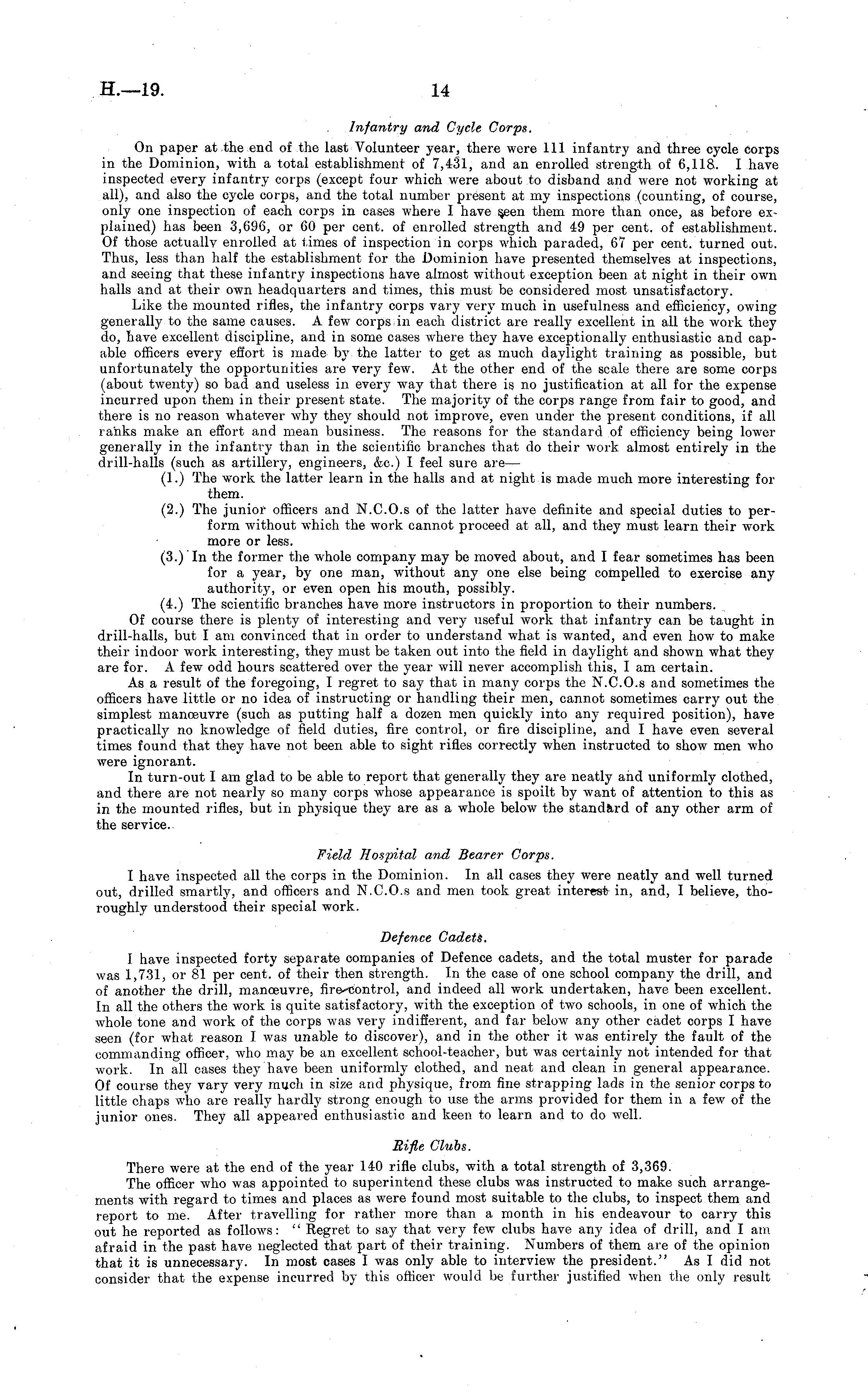 Infantry and Cycle Corps. On paper at the end of the last Volunteer year, there were 111 infantry and three cycle corps in the Dominion, with a total establishment of 7,431, and an enrolled strength of 6,118. I have inspected every infantry corps (except four which were about to disband and were not working at all), and also the cycle corps, and the total number present at my inspections (counting, of course, only one inspection of each corps in cases where I have s,een them more than once, as before explained) has been 3,696, or 60 per cent, of enrolled strength and 49 per cent, of establishment. Of those actually enrolled at times of inspection in corps which paraded, 67 per cent, turned out. Thus, less than half the establishment for the Dominion have presented themselves at inspections, and seeing that these infantry inspections have almost without exception been at night in their own halls and at their own headquarters and times, this must be considered most unsatisfactory. Like the mounted rifles, the infantry corps vary very much in usefulness and efficiency, owing generally to the same causes. A few corps in each district are really excellent in all the work they do, have excellent discipline, and in some cases where they have exceptionally enthusiastic and capable officers every effort is made by the latter to get as much daylight training as possible, but unfortunately the opportunities are very few. At the other end of the scale there are some corps (about twenty) so bad and useless in every way that there is no justification at all for the expense incurred upon them in their present state. The majority of the corps range from fair to good, and there is no reason whatever why they should not improve, even under the present conditions, if all ranks make an effort and mean business. The reasons for the standard of efficiency being lower generally in the infantry than in the scientific branches that do their work almost entirely in the drill-halls (such as artillery, engineers, &c.) I feel sure are— (1.) The work the latter learn in the halls and at night is made much more interesting for them. (2.) The junior officers and N.C.O.s of the latter have definite and special duties to perform without which the work cannot proceed at all, and they must learn their work more or less. (3.) In the former the whole company may be moved about, and I fear sometimes has been for a year, by one man, without any one else being compelled to exercise any authority, or even open his mouth, possibly. (4.) The scientific branches have more instructors in proportion to their numbers. Of course there is plenty of interesting and very useful work that infantry can be taught in drill-halls, but I am convinced that in order to understand what is wanted, and even how to make their indoor work interesting, they must be taken out into the field in daylight and shown what they are for. A few odd hours scattered over the year will never accomplish this, lam certain. As a result of the foregoing, I regret to say that in many corps the N.C.O.s and sometimes the officers have little or no idea of instructing or handling their men, cannot sometimes carry out the simplest manoeuvre (such as putting half a dozen men quickly into any required position), have practically no knowledge of field duties, fire control, or fire discipline, and I have even several times found that they have not been able to sight rifles correctly when instructed to show men who were ignorant. In turn-out I am glad to be able to report that generally they are neatly and uniformly clothed, and there are not nearly so many corps whose appearance is spoilt by want of attention to this as in the mounted rifles, but in physique they are as a whole below the standard of any other arm of the service. Field Hospital and Bearer Corps. I have inspected all the corps in the Dominion. In all cases they were neatly and well turned out, drilled smartly, and officers and N.C.O.s and men took great interest in, and, I believe, thoroughly understood their special work. Defence Cadets. I have inspected forty separate companies of Defence cadets, and the total muster for parade was 1,731, or 81 per cent, of their then strength. In the case of one school company the drill, and of another the drill, manoeuvre, fire-control, and indeed all work undertaken, have been excellent. In all the others the work is quite satisfactory, with the exception of two schools, in one of which the whole tone and work of the corps was very indifferent, and far below any other cadet corps I have seen (for what reason I was unable to discover), and in the other it was entirely the fault of the commanding officer, who may be an excellent school-teacher, but was certainly not intended for that work. In all cases they have been uniformly clothed, and neat and clean in general appearance. Of course they vary very much in size and physique, from fine strapping lads in the senior corps to little chaps who are really hardly strong enough to use the arms provided for them in a few of the junior ones. They all appeared enthusiastic and keen to learn and to do well. Bifle Clubs. There were at the end of the year 140 rifle clubs, with a total strength of 3,369. The officer who was appointed to superintend these clubs was instructed to make such arrangements with regard to times and places as were found most suitable to the clubs, to inspect them and report to me. After travelling for rather more than a month in his endeavour to carry this out he reported as follows: " Regret to say that very few r clubs have any idea of drill, and I am afraid in the past have neglected that part of their training. Numbers of them are of the opinion that it is unnecessary. In most cases I was only able to interview the president." As I did not consider that the expense incurred by this officer would be further justified when the only result
