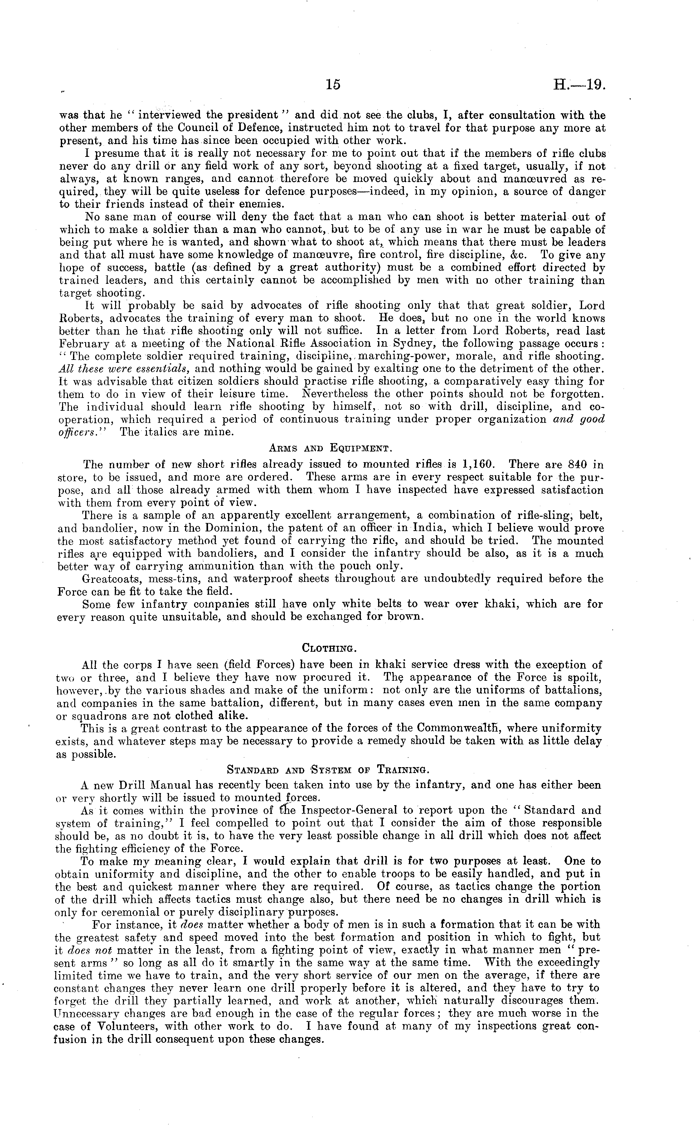 was that he " interviewed the president " and did not see the clubs, I, after consultation with the other members of the Council of Defence, instructed him not to travel for that purpose any more at present, and his time has since been occupied with other work. I presume that it is really not necessary for me to point out that if the members of rifle clubs never do any drill or any field work of any sort, beyond shooting at a fixed target, usually, if not always, at known ranges, and cannot therefore be moved quickly about and manoeuvred as required, they will be quite useless for defence purposes—indeed, in my opinion, a source of danger to their friends instead of their enemies. No sane man of course will deny the fact that a man who can shoot is better material out of which to make a soldier than a man who cannot, but to be of any use in war he must be capable of being put where he is wanted, and shown what to shoot at, which means that there must be leaders and that all must have some knowledge of manoeuvre, fire control, fire discipline, &c. To give any hope of success, battle (as defined by a great authority) must be a combined effort directed by trained leaders, and this certainly cannot be accomplished by men with no other training than target shooting. It will probably be said by advocates of rifle shooting only that that great soldier, Lord Roberts, advocates the training of every man to shoot. He does, but no one in the world knows better than he that rifle shooting only will not suffice. In a letter from Lord Roberts, read last February at a meeting of the National Rifle Association in Sydney, the following passage occurs : "The complete soldier required training, discipline, marching-power, morale, and rifle shooting. All these were essentials, and nothing would be gained by exalting one to the detriment of the other. It was advisable that citizen soldiers should practise rifle shooting, a comparatively easy thing for them to do in view of their leisure time. Nevertheless the other points should not be forgotten. The individual should learn rifle shooting by himself, not so with drill, discipline, and cooperation, which required a period of continuous training under proper organization and good officers." The italics are mine. Arms and Equipment. The number of new short rifles already issued to mounted rifles is 1,160. There are 840 in store, to be issued, and more are ordered. These arms are in every respect suitable for the purpose, and all those already armed with them whom I have inspected have expressed satisfaction with them from every point of view. There is a sample of an apparently excellent arrangement, a combination of rifle-sling, belt, and bandolier, now in the Dominion, the patent of an officer in India, which I believe would prove the most satisfactory method yet found of carrying the rifle, and should be tried. The mounted rifles are equipped with bandoliers, and I consider the infantry should be also, as it is a much better way of carrying ammunition than with the pouch only. Greatcoats, mess-tins, and waterproof sheets throughout are undoubtedly required before the Force can be fit to take the field. Some few infantry companies still have only white belts to wear over khaki, which are for every reason quite unsuitable, and should be exchanged for brown. Clothing. All the corps I have seen (field Forces) have been in khaki service dress with the exception of two or three, and I believe they have now procured it. The appearance of the Force is spoilt, however,.by the various shades and make of the uniform: not only are the uniforms of battalions, and companies in the same battalion, different, but in many cases even men in the same company or squadrons are not clothed alike. This is a great contrast to the appearance of the forces of the Commonwealth, where uniformity exists, and whatever steps may be necessary to provide a remedy should be taken with as little delay as possible. Standard and System of Training. A new Drill Manual has recently been taken into use by the infantry, and one has either been or very shortly will be issued to mounted forces. As it comes within the province of me Inspector-General to report upon the " Standard and system of training," I feel compelled to point out that I consider the aim of those responsible should be, as no doubt it is, to have the very least possible change in all drill which does not affect the fighting efficiency of the Force. To make my meaning clear, I would explain that drill is for two purposes at least. One to obtain uniformity and discipline, and the other to enable troops to be easily handled, and put in the best and quickest manner where they are required. Of course, as tactics change the portion of the drill which affects tactics must change also, but there need be no changes in drill which is only for ceremonial or purely disciplinary purposes. For instance, it does matter whether a body of men is in such a formation that it can be with the greatest safety and speed moved into the best formation and position in which to fight, but it does not matter in the least, from a fighting point of view, exactly in what manner men " present arms "so long as all do it smartly in the same way at the same time. With the exceedingly limited time we have to train, and the very short service of our men on the average, if there are constant changes they never learn one drill properly before it is altered, and they have to try to forget the drill they partially learned, and work at another, which naturally discourages them. Unnecessary changes are bad enough in the case of the regular forces; they are much worse in the case of Volunteers, with other work to do. I have found at many of my inspections great confusion in the drill consequent upon these changes.