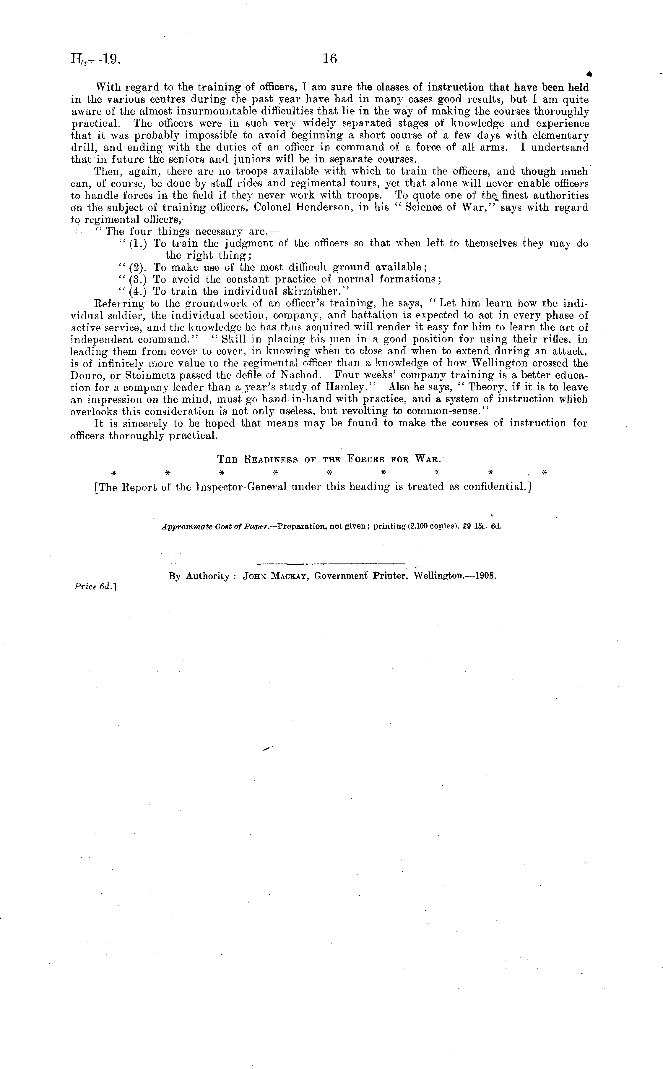 * With regard to the training of officers, I am sure the classes of instruction that have been held in the various centres during the past year have had in many cases good results, but I am quite aware of the almost insurmountable difficulties that lie in the way of making the courses thoroughlypractical. The officers were in such very widely separated stages of knowledge and experience that it was probablj' impossible to avoid beginning a short course of a few days with elementarydrill, and ending with the duties of an officer in command of a force of all arms. I undertsand that in future the seniors and juniors will be in separate courses. Then, again, there are no troops available with which to train the officers, and though much can, of course, be done by staff rides and regimental tours, yet that alone will never enable officers to handle forces in the field if they never work with troops. To quote one of the finest authorities on the subject of training officers, Colonel Henderson, in his " Science of War," says with regard to regimental officers, — " The four things necessary are, — " (1.) To train the judgment of the officers so that when left to themselves they may do the right thing; " (2). To make use of the most difficult ground available; " (3.) To avoid the constant practice of normal formations; '' (4.) To train the individual skirmisher." Referring to the groundwork of an officer's training, he says, " Let him learn how the individual soldier, the individual section, company, and battalion is expected to act in every phase of active service, and the knowledge he has thus acquired will render it easy for him to learn the art of independent command." " Skill in placing his men in a good position for using their rifles, in leading them from cover to cover, in knowing when to close and when to extend during an attack, is of infinitely more value to the regimental officer than a knowledge of how Wellington crossed the Douro, or Steinmetz passed the defile of Nachod. Four weeks' company training is a better education for a company leader than a year's study of Hamley." Also he says, " Theory, if it is to leave an impression on the mind, must go hand-in-hand with practice, and a system of instruction which overlooks this consideration is not only useless, but revolting to common-sense." It is sincerely to be hoped that means may be found to make the courses of instruction for officers thoroughly practical. The Readiness op the Forces for War. * # * * * # * *,* [The Report of the Inspector-General under this heading is treated as confidential.] Approximate Cost of Paper.— Preparation, not given; printing (2,100 copies), £ 9 16t. M.