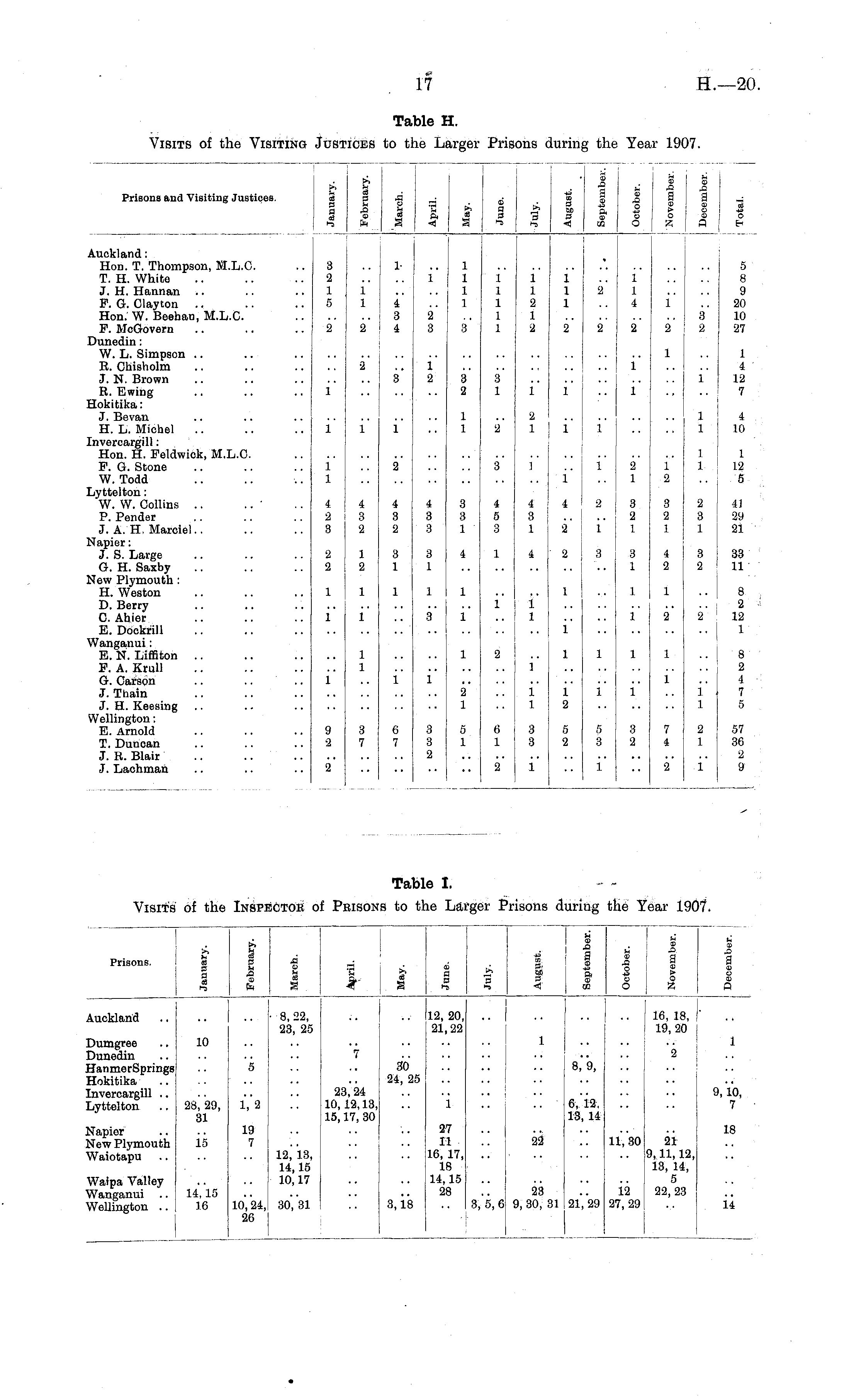 Table H. Visits of the Visiting Justices to the Larger Prisons during the Year 1907.