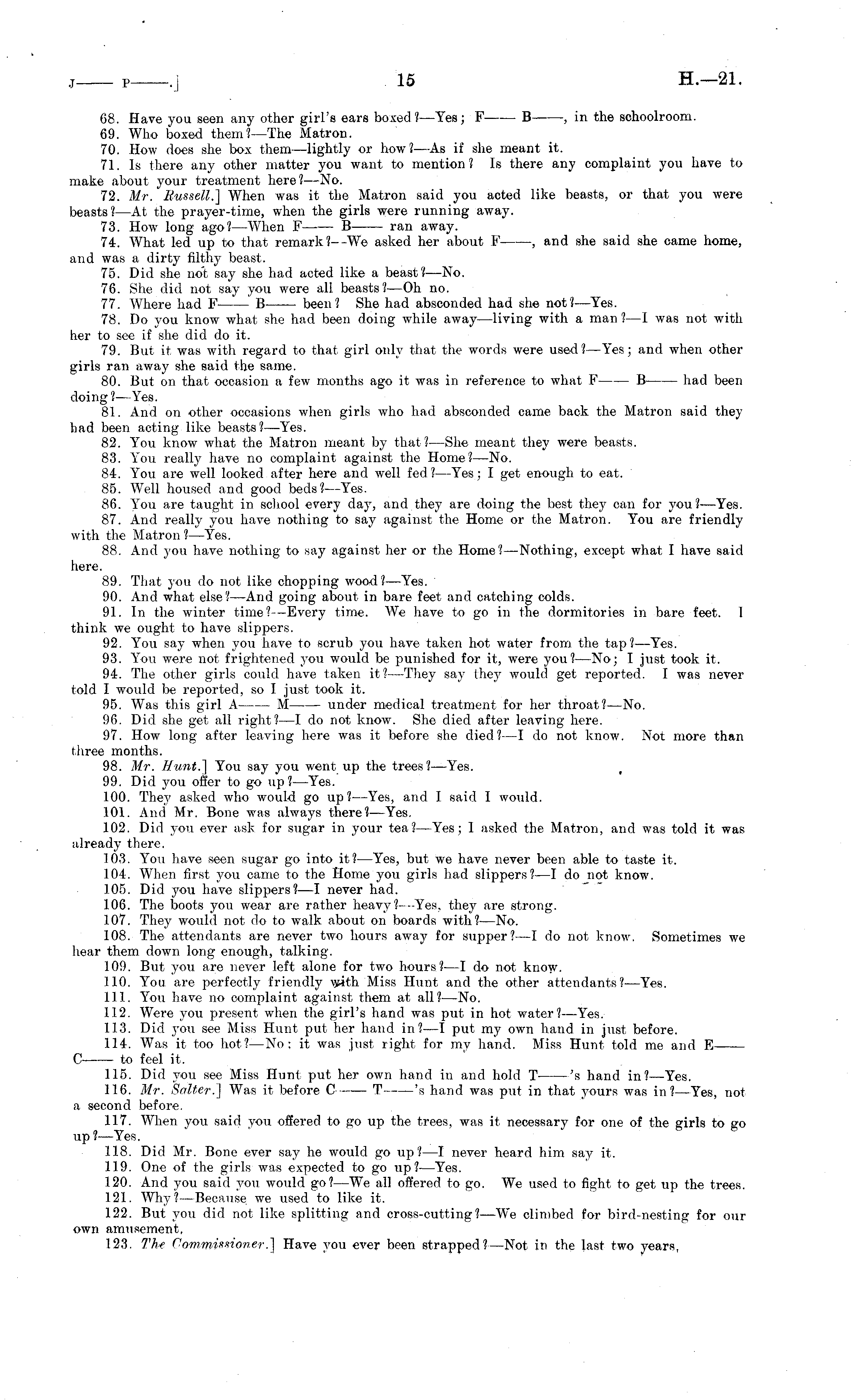 68. Have you seen any other girl's ears boxed? —Yes; F B , in the schoolroom. 69. Who boxed them?— The Matron. 70. How does she box them—lightly or how? —As if she meant, it. 71. Is there any other matter you want to mention? Is there any complaint you have to make about your treatment here? —No. 72. Mr. Russell.] When was it the Matron said you acted like beasts, or that you were beasts? —At the prayer-time, when the girls were running away. 73. How long ago?— When F B ran away. 74. What led up to that remark?--We asked her about F , and she said she came home, and was a dirty filthy beast. 75. Did she not say she had acted like a beast?— No. 76. She did not say you were all beasts? —Oh no. 77. Where had F B been? She had absconded had she not? —Yes. 78. Do you know what she had been doing while away —living with a man ?—I was not with her to see if she did do it. 79. But it. was with regard to that girl only that the words were used? —Yes; and when other girls ran away she said the same. 80. But on that occasion a few months ago it was in reference to what F B had been doing?— Yes. 81. And on other occasions when girls who had absconded came back the Matron said they had been acting like beasts? —Yes. 82. You know what the Matron meant by that?— She meant they were beasts. 83. You really have no complaint against the Home?— No. 84. You are well looked after here and well fed? —Yes; I get enough to eat, 85. Well housed and good beds?— Yes. 86. You are taught in school every day, and they are doing the best they can for you?- —Yes. 87. And really you have nothing to say against the Home or the Matron. You are friendly with the Matron ?—Yes. 88. And you have nothing to say against her or the Home? —Nothing, except what I have said here. 89. That you do not like chopping wood?— Yes. 90. And what else? —And going about in bare feet and catching colds. 91. In the winter time? —Every time. We have to go in the dormitories in bare feet. I think we ought to have slippers. 92. You say when you have to scrub you have taken hot water from the tap?— Yes. 93. You were not frightened you would be punished for it, were you?—No; I just took it. 94. The other girls could have taken it?— They say they would get reported. I was never told I would be reported, so I just took it. 95. Was this girl A M under medical treatment for her throat?— No. 96. Did she get all right?—l. do not know. She died after leaving here. 97. How long after leaving here was it before she died? —I do not know. Not more than three months. 98. Mr. Hunt.] You say you went up the trees?— Yes. 99. Did you offer to go up?— Yes. 100. They asked who would go up?— Yes, and I said I would. 101. And Mr. Bone was always there?— Yes. 102. Did you ever ask for sugar in your tea?— Yes; I asked the Matron, and was told it was already there. 103. You have seen sugar go into it?— Yes, but we have never been able to taste it. 104. When first you came to the Home you girls had slippers?—l do not know. 105. Did you have slippers?—l never had. 106. The boots you wear are rather heavy?--Yes. they are strong. 107. They would not do to walk about on boards with?— No. 108. The attendants are never two hours away for supper?—l do not know. Sometimes we hear them down long enough, talking. 109. But you are never left alone for two hours?—l do not know. 110. You are perfectly friendly with Miss Hunt and the other attendants?— Yes. 111. You have no complaint against them at all? —No. 112. Were you present when the girl's hand was put in hot water?— Yes. 113. Did you see Miss Hunt put her hand in?—l put my own hand in just before. 114. Was it too hot?—No; it was just right for my hand. Miss Hunt told me and E C to feel it. 115. Did you see Miss Hunt put her own hand in and hold T 's hand in?— Yes. 116. Mr. Salter.] Was it before C T 's hand was put in that yours was in?— Yes, not a second before. 117. When you said you offered to go up the trees, was it necessary for one of the girls to go up?— Yes. 118. Did Mr. Bone ever say he would go up?—l never heard him say it. 119. One of the girls was expected to go up?— Yes. 120. And you said you would go?—We all offered to go. We used to fight to get up the trees. 121. Why?— Because we used to like it. 122. But you did not like splitting and cross-cutting?—We climbed for bird-nesting for our own amusement, 123. Th<e Commissioner.] Have you ever been strapped? —Not in the last two years,