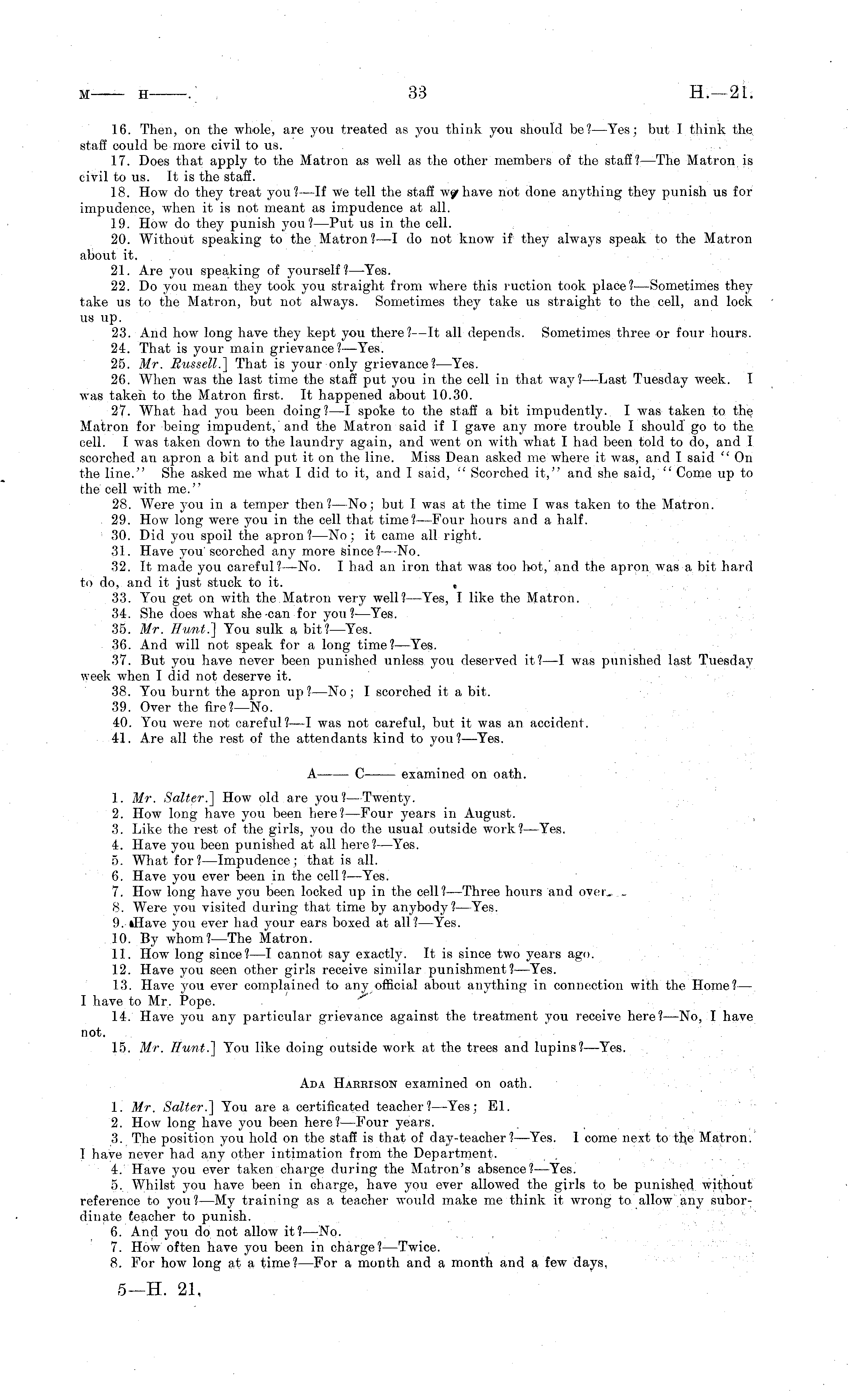 16. Then, on the whole, are you treated as you think you should be?— Yes; but I think the staff could be more civil to us. 17. Does that apply to the Matron as well as the other members of the staff?— The Matron is civil to us. It is the staff. 18. How do they treat you?—lf we tell the staff wj* have not done anything they punish us for impudence, when it is not meant as impudence at all. 19. How do they punish you?— Put us in the cell. 20. Without speaking to the Matron?—l do not know if they always speak to the Matron about it. 21. Are you speaking of yourself? —Yes. 22. Do you mean they took you straight from where this ruction took place?— Sometimes they take us to the Matron, but not always. Sometimes they take us straight to the cell, and lock us up. 23. And how long have they kept you there? —It all depends. Sometimes three or four hours. 24. That is your main grievance?— Yes. 25. Mr. Russell.] That is your only grievance?— Yes. 26. When was the last time the staff put you in the cell in that way?— Last Tuesday week. I was taken to the Matron first. It happened about 10.30. 27. What had you been doing?—l spoke to the staff a bit impudently. I was taken to the Matron for being impudent,'and the Matron said if I gave any more trouble I should go to the, cell. I was taken down to the laundry again, and went on with what I had been told to do, and I scorched an apron a bit and put it on the line. Miss Dean asked me where it was, and I said "On the line." She asked me what I did to it, and I said, " Scorched it," and she said, " Come up to the cell with me." 28. Were you in a temper then?—No; but I was at the time I was taken to the Matron. 29. How long were you in the cell that time?— Four hours and a half. 30. Did you spoil the apron?—No; it came all right, 31. Have you'scorched any more since? —No. 32. It made you careful?— No. I had an iron that was too hot, and the apron was a bit hard to do, and it just stuck to it. , 33. You get on with the Matron very well?— Yes, I like the Matron. 34. She does what she-can for you?— Yes. 35. Mr. Hunt.] You sulk a bit?— Yes. 36. And will not speak for a long time?— Yes. 37. But you have never been punished unless you deserved it?—l was punished last Tuesday week when I did not deserve it. 38. You burnt the apron up?—No ; I scorched it a bit. 39. Over the fire?— No. 40. You were not careful?—l was not careful, but it was an accident. 41. Are all the rest of the attendants kind to you?— Yes. A C examined on oath. 1. Mr. Salter.] How old are you?— Twenty. 2. How long have you been here?— Four years in August. 3. Like the rest of the girls, you do the usual outside work?— Yes. 4. Have you been punished at all here? —Yes. 5. What for?—lmpudence; that is all. 6. Have you ever been in the cell? —Yes. 7. How long have you been locked up in the cell? —Three hours and over. 8. Were you visited during that time by anybody? —Yes. 9. »Have you ever had your ears boxed at all?— Yes. 10. By whom?— The Matron. 11. How long since?—l cannot say exactly. It is since two years ago. 12. Have you seen other girls receive similar punishment?— Yes. 13. Have you ever complained to any official about anything in connection with the Home?— I have to Mr. Pope. 14. Have you any particular grievance against the treatment you receive here? —No, I have not. 15. Mr. Hunt.] You like doing outside work at the trees and lupins? —Yes. Ada Harrison examined on oath. 1. Mr. Salter.] You are a certificated teacher?— Yes; El. 2. How long have you been here?— Four years. 3. The position you hold on the staff is that of day-teacher? —Yes. 1 come next to the Matron. I have never had any other intimation from the Department, 4. Have you ever taken charge during the Matron's absence?— Yes. 5. Whilst you have been in charge, have you ever allowed the girls to be punished without reference to you ?—My training as a teacher would make me think it wrong to allow any subordinate teacher to punish. 6. And you do not allow it?— No. 7. How often have you been in charge?— Twice. 8. For how long at a time? —For a month and a month and a few days,