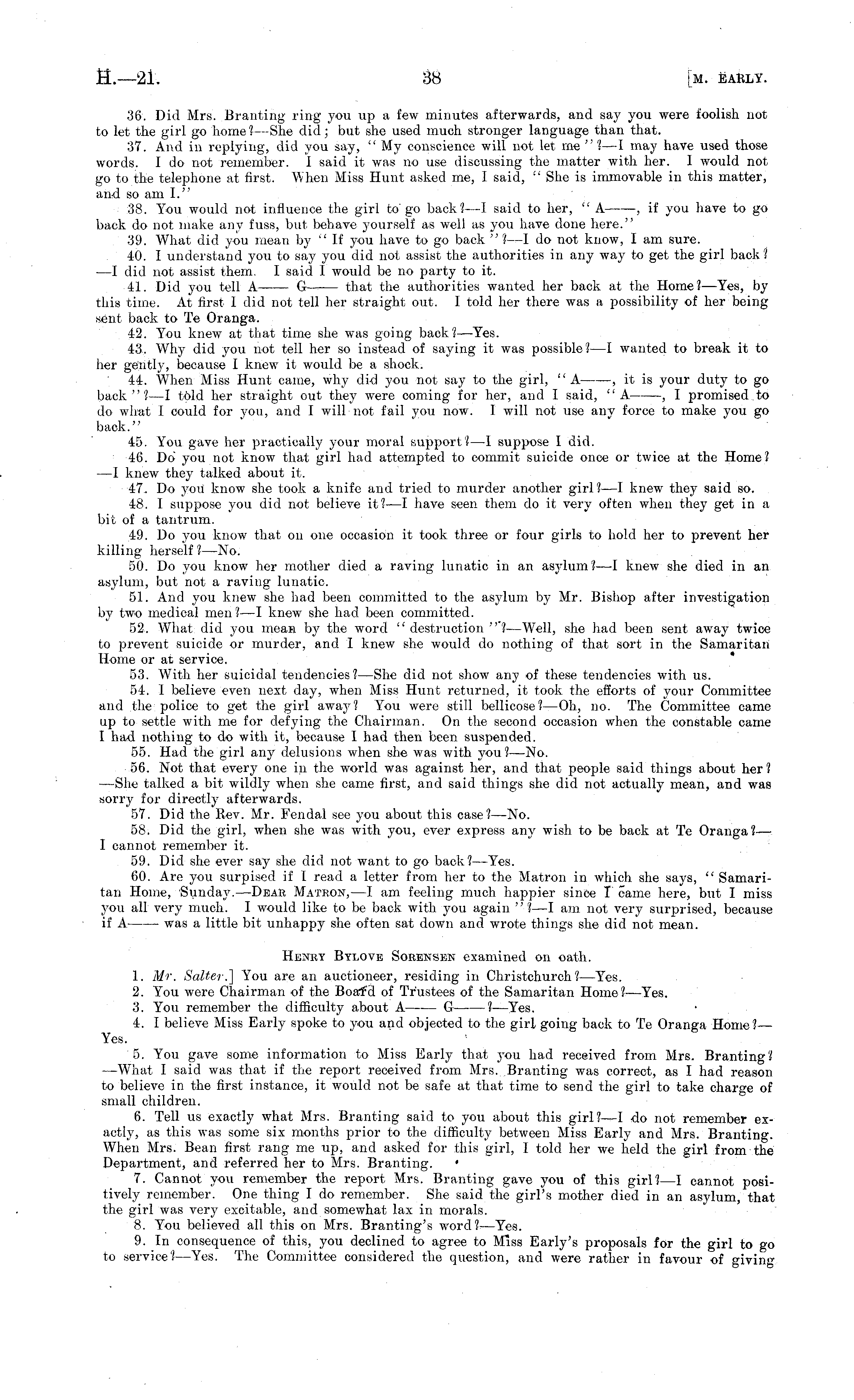36. Did Mrs. Branting ring you up a few minutes afterwards, and say you were foolish not to let the girl go home? —She did; but she used much stronger language than that. 37. And in replying, did you say, "My conscience will not let me "?—I may have used those words. Ido not remember. I said it was no use discussing the matter with her. I would not go to the telephone at first. When Miss Hunt asked me, I said, " She is immovable in this matter, and so am I." 38. You would not influence the girl togo back? —I said to her, " A , if you have to go back do not make any fuss, but behave yourself as well as you have done here." 39. What did you mean by "If you have to go back "? —I do not know, lam sure. 40. I. understand you to say you did not assist the authorities in any way to get the girl back ? —I did not assist them. I said I would be no party to it. 41. Did you tell A G that the authorities wanted her back at the Home? —Yes, by this time. At first I did not tell her straight out. 1 told her there was a possibility of her being sent back to Te Oranga. 42. You knew at that time she was going back?— Yes. 43. Why did you not tell her so instead of saying it was possible?—l wanted to break it to her gently, because I knew it would be a shock. 44. When Miss Hunt came, why did you not say to the girl, "A , it is your duty to go back"? —I told her straight out they were coming for her, and I said, "A , I promised to do what I could for you, and I will not fail you now. I will not use any force to make you go back." 45. You gave her practically your moral support?—l suppose I did. 46. Do you not know that girl had attempted to commit suicide once or twice at the Home? —I knew they talked about it. 47. Do you know she took a knife and tried to murder another girl?—l knew they said so. 48. I suppose you did not believe it?—l have seen them do it very often when they get in a bit of a tantrum. 49. Do you know that on one occasion it took three or four girls to hold her to prevent her killing herself ?—No. 50. Do you know her mother died a raving lunatic in an asylum?—l knew she died in an asylum, but not a raving lunatic. 51. And you knew she had been committed to the asylum by Mr. Bishop after investigation by two medical men? —I knew she had been committed. 52. What did you mean by the word "destruction "?—Well, she had been sent away twice to prevent suicide or murder, and I knew she would do nothing of that sort in the Samaritan Home or at service. 53. With her suicidal tendencies? —She did not show any of these tendencies with us. 54. 1 believe even next day, when Miss Hunt returned, it took the efforts of your Committee and the police to get the girl away? You were still bellicose? —Oh, no. The Committee came up to settle with me for defying the Chairman. On the second occasion when the constable came I had nothing to do with it, because I had then been suspended. 55. Had the girl any delusions when she was with you? —No. 56. Not that every one in the world was against her, and that people said things about her? —She talked a bit wildly when she came first, and said things she did not actually mean, and was sorry for directly afterwards. 57. Did the Rev. Mr. Fendal see you about this case?— No. 58. Did the girl, when she was with you, ever express any wish to be back at Te Oranga?—I cannot remember it. 59. Did she ever say she did not want to go back?— Yes. 60. Are you surpised if I read a letter from her to the Matron in which she says, " Samaritan Home, Sunday.—Dear Matron, —I am feeling much happier since I came here, but I miss you all very much. I would like to be back, with you again "?—I am not very surprised, because if A was a little bit unhappy she often sat down and wrote things she did not mean. Henry Bylove Sorensen examined on oath. 1. Mr. Salter.] You are an auctioneer, residing in Christchurch?—Yes. 2. You were Chairman of the Boafd of Trustees of the Samaritan Home? —Yes. 3. You remember the difficulty about A G ?—Yes. 4. I believe Miss Early spoke to you and objected to the girl going back to Te Oranga Home?— Yes. 5. You gave some information to Miss Early that you had received from Mrs. Branting? —What I said was that if the report received from Mrs. Branting was correct, as I had reason to believe in the first instance, it would not be safe at that time to send the girl to take charge of small children. 6. Tell us exactly what Mrs. Branting said to you about this girl?—l do not remember exactly, as this was some six months prior to the difficulty between Miss Early and Mrs. Branting. When Mrs. Bean first rang me up, and asked for this girl, I told her we held the girl from the Department, and referred her to Mrs. Branting. • 7. Cannot you remember the report Mrs. Branting gave you of this girl?—l cannot positively remember. One thing Ido remember. She said the girl's mother died in an asylum, that the girl was very excitable, and somewhat lax in morals. 8. You believed all this on Mrs. Branting's word? —Yes. 9. In consequence of this, you declined to agree to Miss Early's proposals for the girl to go to service?— Yes. The Committee considered the question, and were rather in favour of givin<>-