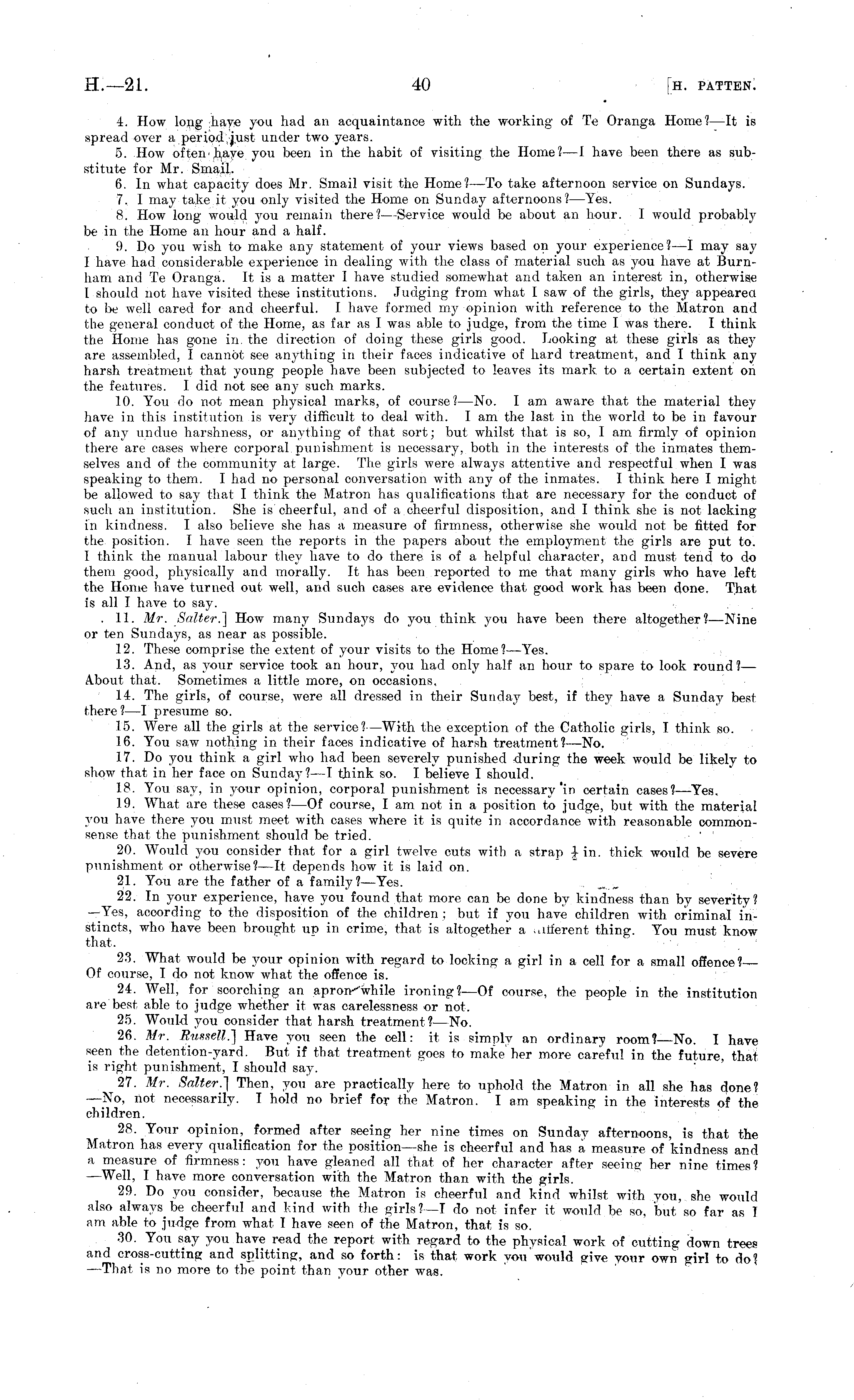 4. How long have you had an acquaintance with the working of Te Oranga Home I —lt is spread over a period just under two years. 5. How often have you been in the habit of visiting the Home? —I have been there as substitute for Mr. Smail. 6. In what capacity does Mr. Smail visit the Home?—To take afternoon service on Sundays. 7. I may take it you only visited the Home on Sunday afternoons?— Yes. 8. How long would you remain there ?—Service would be about an hour. I would probably be in the Home an hour and a half. 9. Do you wish to make any statement of your views based on your experience?—l may say I have had considerable experience in dealing with the class of material such as you have at Burnham and Te Oranga. It is a matter I have studied somewhat and taken an interest in, otherwise I should not have visited these institutions. Judging from what I saw of the girls, they appearea to be well cared for and cheerful. I have formed my opinion with reference to the Matron and the general conduct of the Home, as far as I was able to judge, from the time I was there. I think the Home has gone in. the direction of doing these girls good. Looking at these girls as they are assembled, I cannot see anything in their faces indicative of hard treatment, and I think any harsh treatment that young people have been subjected to leaves its mark to a certain extent on the features. I did not see any such marks. 10. You do not mean physical marks, of course?— No. I am aware that the material they have in this institution is very difficult to deal with. I am the last in the world to be in favour of any undue harshness, or anything of that sort; but whilst that is so, I am firmly of opinion there are cases where corporal punishment is necessary, both in the interests of the inmates themselves and of the community at large. The girls were always attentive and respectful when I was speaking to them. I had no personal conversation with any of the inmates. I think here I might be allowed to say that I think the Matron has qualifications that are necessary for the conduct of such an institution. She is cheerful, and of a cheerful disposition, and I think she is not lacking in kindness. I also believe she has a measure of firmness, otherwise she would not be fitted for the position. I have seen the reports in the papers about the employment the girls are put to. I think the manual labour they have to do there is of a helpful character, and must tend to do them good, physically and morally. It has been reported to me that many girls who have left the Home have turned out well, and such cases are evidence that good work has been done. That is all I have to say. . 11. Mr. Salter.] How many Sundays do you think you have been there altogether?— Nine or ten Sundays, as near as possible. 12. These comprise the extent of your visits to the Home?— Yes. 13. And, as your service took an hour, you had only half an hour to spare to look round? — About that, Sometimes a little more, on occasions. 14. The girls, of course, were all dressed in their Sunday best, if they have a Sunday best there ?—I presume so. 15. Were all the girls at the service? —With the exception of the Catholic girls, I think so. - 16. You saw nothing in their faces indicative of harsh treatment?— No. 17. Do you think a girl who had been severely punished during the week would be likely to show that in her face on Sunday?—l think so. I believe I should. 18. You say, in your opinion, corporal punishment is necessary'in certain cases?— Yes. 19. What are these cases?—Of course, I am not in a position to judge, but with the material you have there you must meet with cases where it is quite in accordance with reasonable commonsense that the punishment should be tried. 20. Would you consider that for a girl twelve cuts with a strap J in. thick would be severe punishment or otherwise?—lt depends how it is laid on. 21. You are the father of a family? —Yes. 22. In your experience, have you found that more can be done by kindness than by severity? —Yes, according to the disposition of the children ; but if you have children with criminal instincts, who have been brought up in crime, that is altogether a .afferent thing. You must know that, 23. What would be your opinion with regard to locking a girl in a cell for a small offence?— Of course, I do not know what the offence is. 24. Well, for scorching an aprorKwhile ironing?—Of course, the people in the institution are best able to judge whether it was carelessness or not. 25. Would you consider that harsh treatment?— No. 26. Mr. Russell.] Have you seen the cell: it is simply an ordinary room?— No. I have seen the detention-yard. But if that treatment goes to make her more careful in the future, that is right punishment, I should say. 27. Mr. Salter.] Then, you are practically here to uphold the Matron in all she has done? —No, not necessarily. I hold no brief for the Matron. lam speaking in the interests of the children. 28. Your opinion, formed after seeing her nine times on Sunday afternoons, is that the Matron has every qualification for the position—she is cheerful and has a measure of kindness and a measure of firmness: you have gleaned all that of her character after seeing her nine times? —Well, I have more conversation with the Matron than with the girls. 29. Do you consider, because the Matron is cheerful and kind whilst, with you, she would also cheerful and kind with the girls?—l do not infer it would be so, but so far as I am able to judge from what I have seen of the Matron, that is so. 30. You say you have read the report with regard to the physical work of cutting down trees and cross-cutting and splitting, and so forth: is that work you would give your own girl to do? —That is no more to the point than your other was.